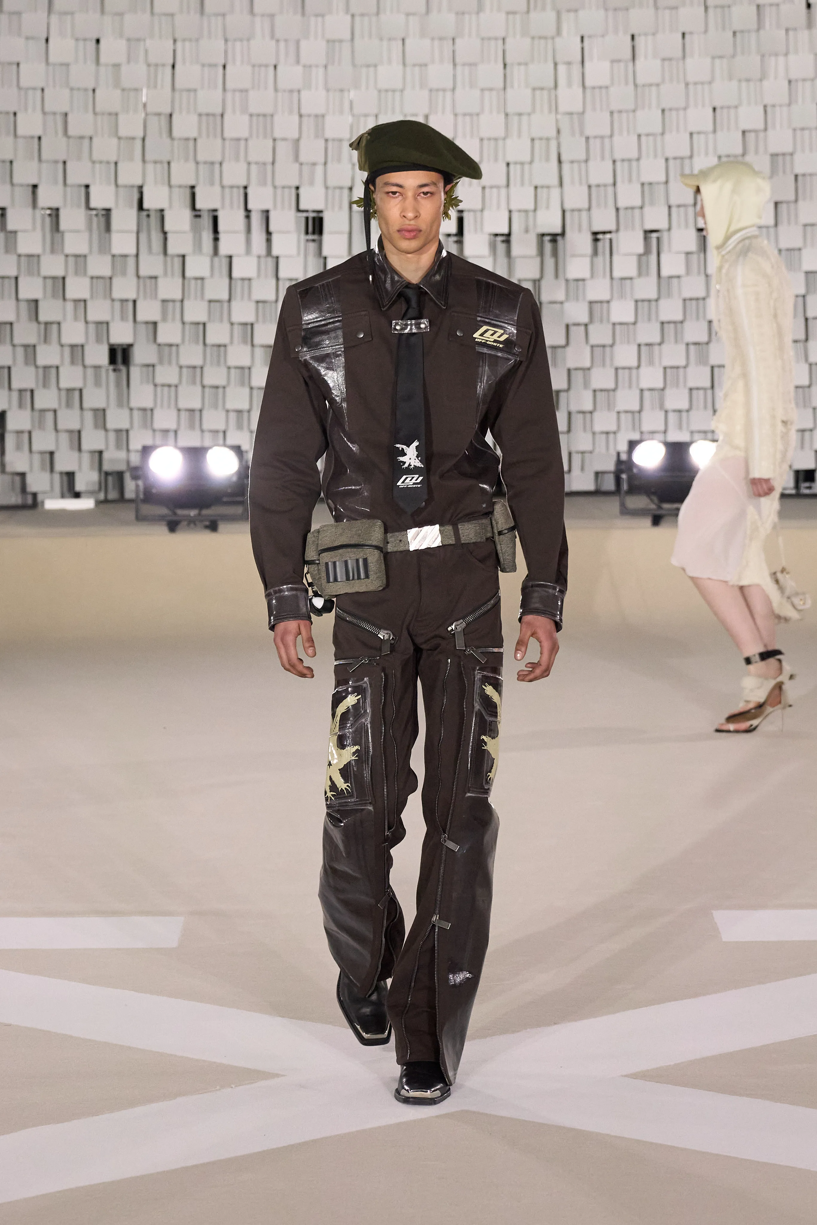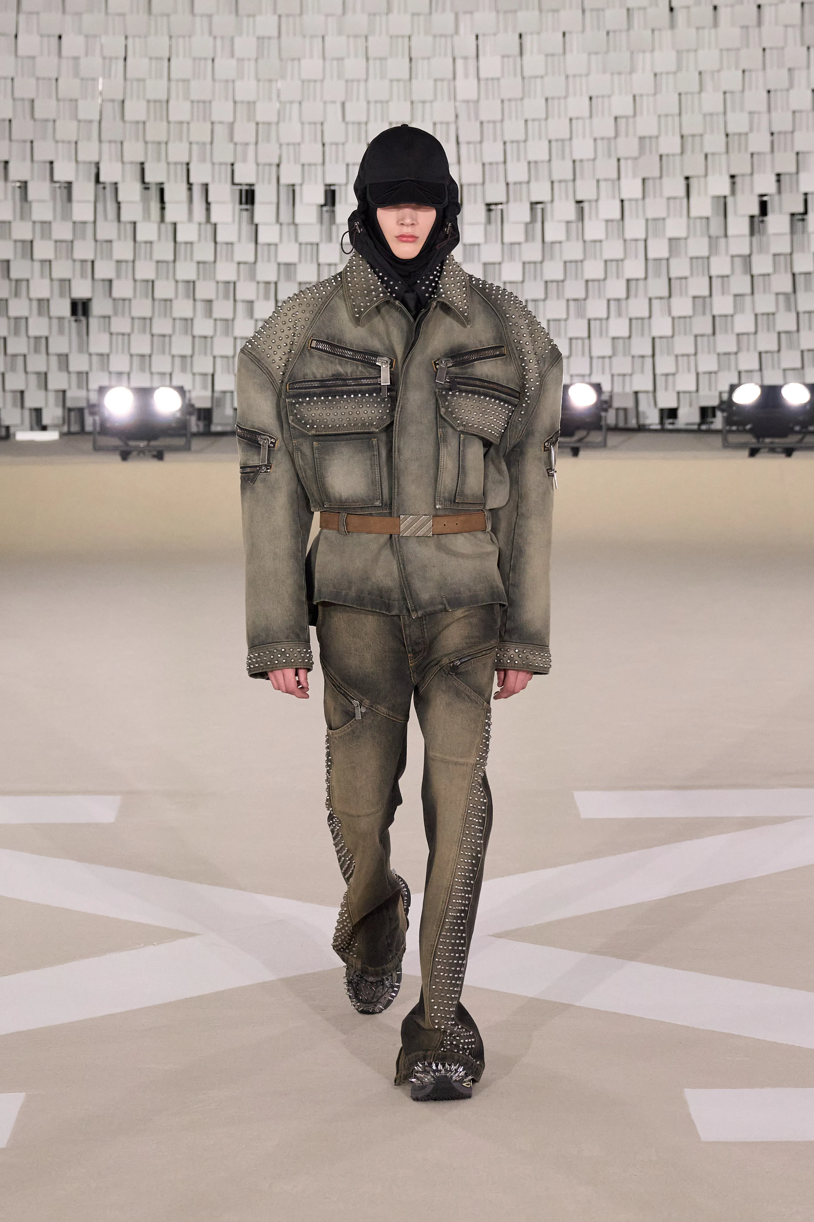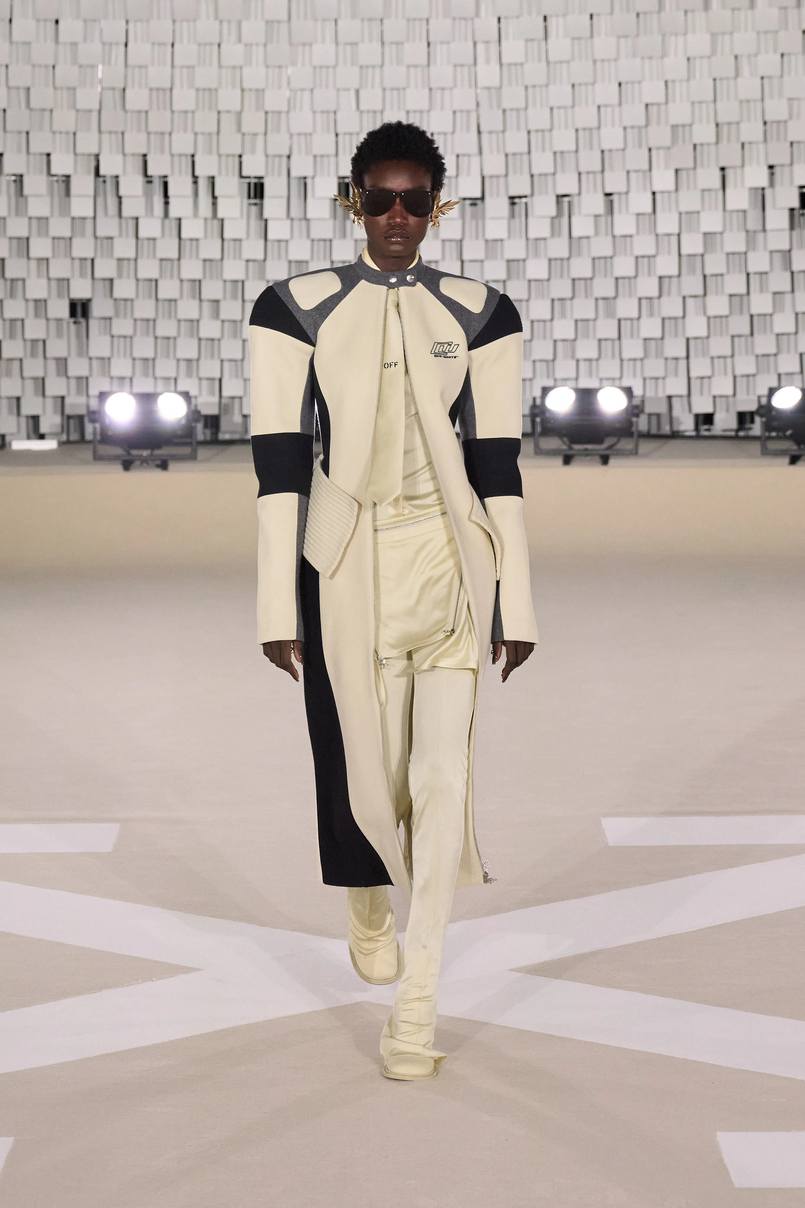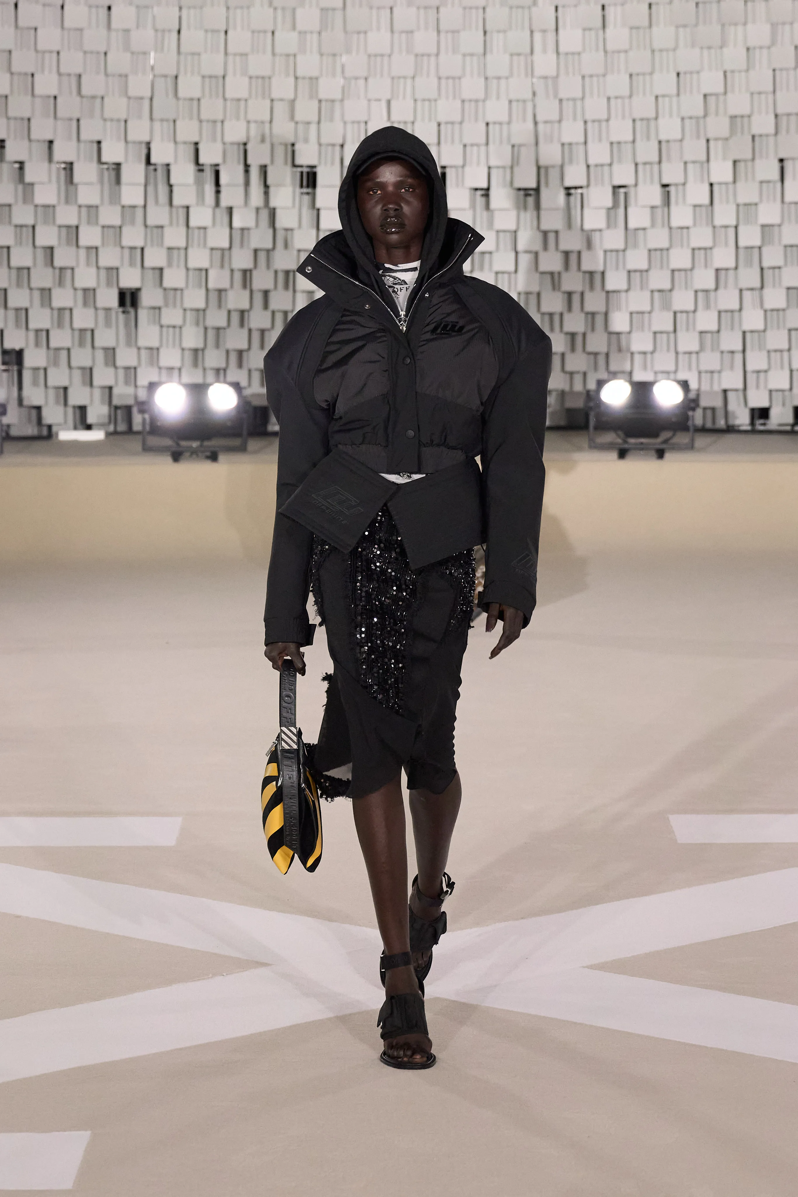"Dans le sens de la communauté, je trouve que se trouvent la force et la grâce, la beauté et la joie d’être humain. J’imagine Off-White comme une société d’individus de tous âges, de toutes races et de tous horizons, qui s’efforcent d’exprimer leur véritable identité tout en se liant et en s’aidant les uns les autres, en partageant des valeurs et des visions", souligne Ib Kamara. Pour cette collection Off-White baptisée "State Of Resistance", le créatif a fait appel à des inspirations personnelles : les symboles ghanéens, les uniformes britanniques ou les influences punk. Si les uniformes sont un langage particulier, il a travaillé sur ces pièces en mettant en valeur les épaules comme signifiant à la fois la résistance et la force. La démocratie et l’humilité qui font partie intégrante de l’idée de communauté ont conduit à se concentrer sur des matières telles que le jersey et le denim, qui deviennent une toile pour expérimenter les délavages, le traitement, les formes. Les vêtements pour hommes et femmes partagent la même férocité, la palette neutre accentuée d’aqua, de violet et de rouge, le même accent sur les formes comme le varsity et le bomber, et même le nouveau Sand Bag, avec l’idée de quelque chose de commun à l’envers. Le denim déchiré, les épaules rembourrées, les vestes longues avec des sweats à capuche à l'intérieur, les shorts de sport et les pantalons anatomiques créent un riche mélange de cultures et de styles.