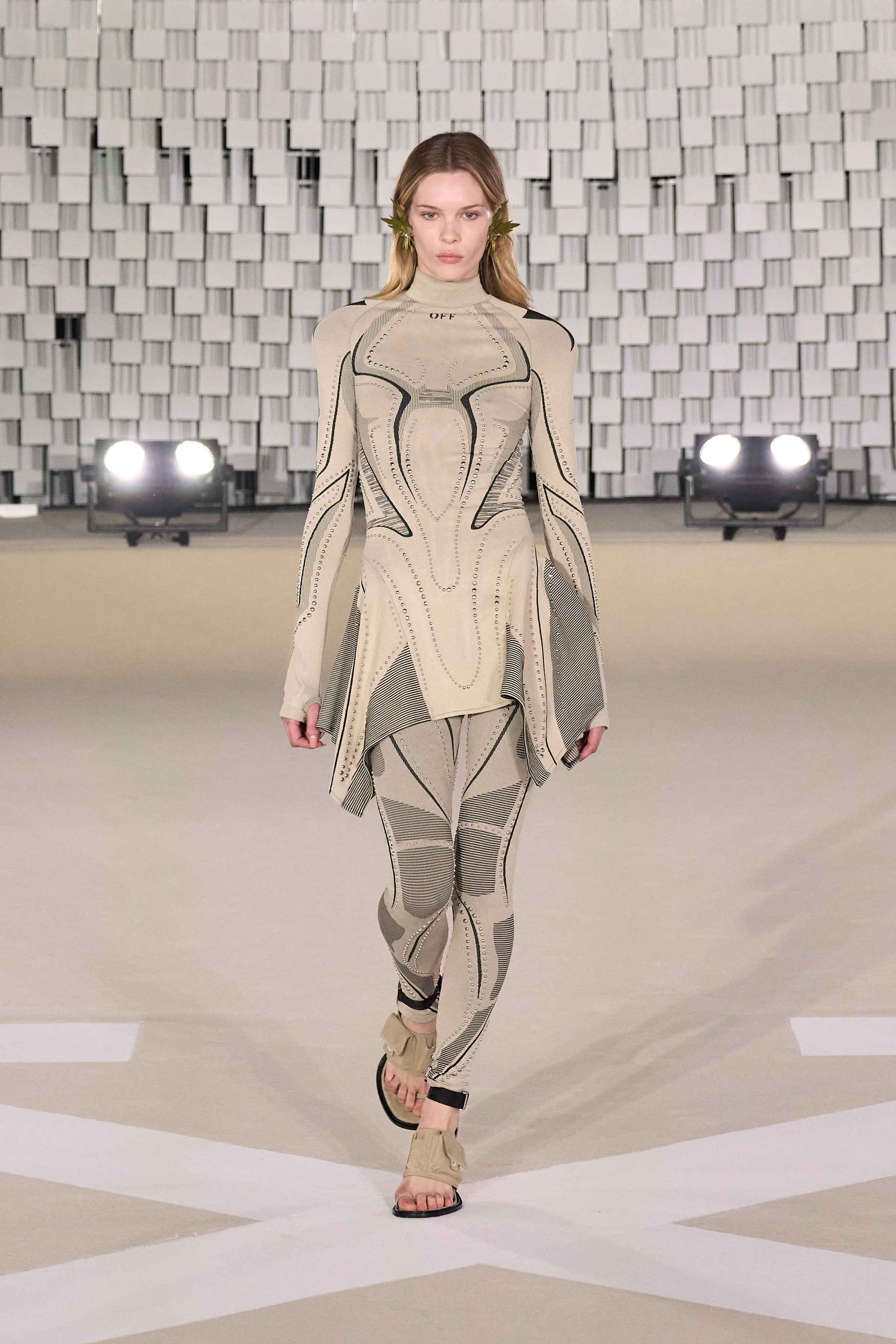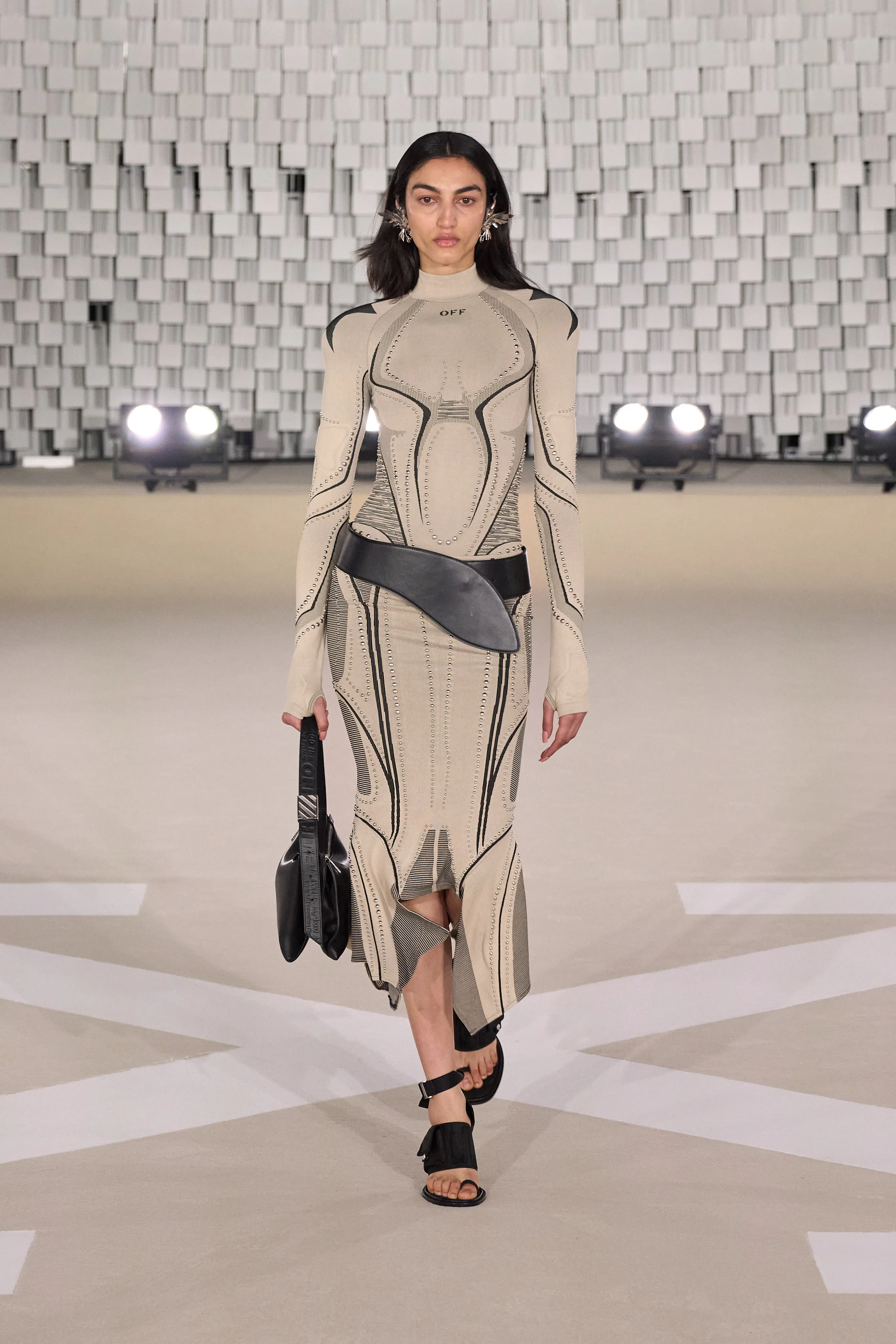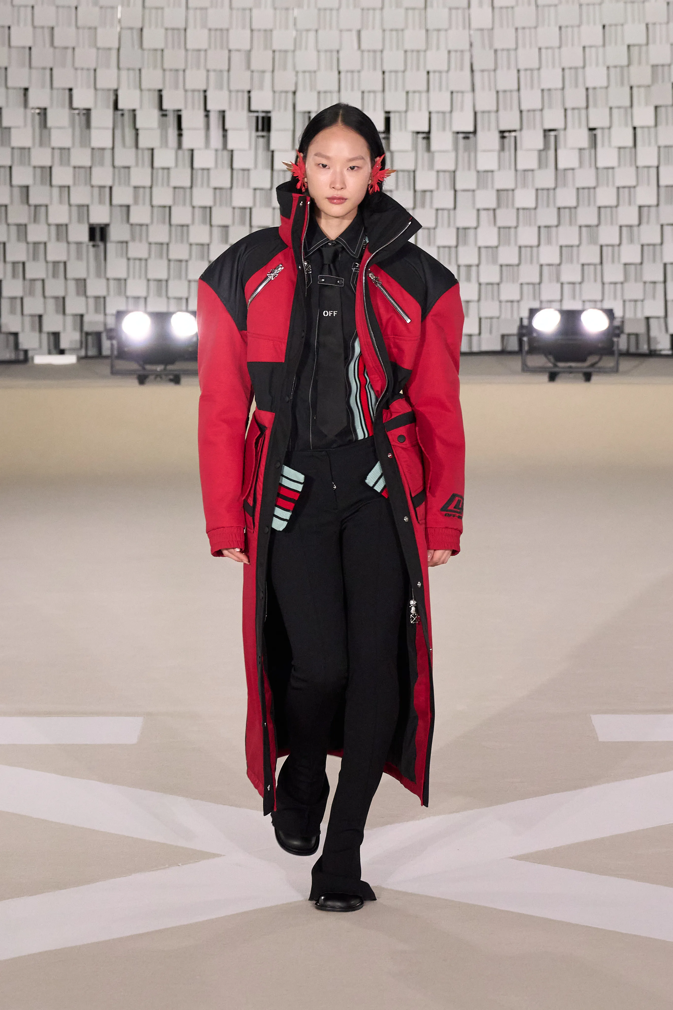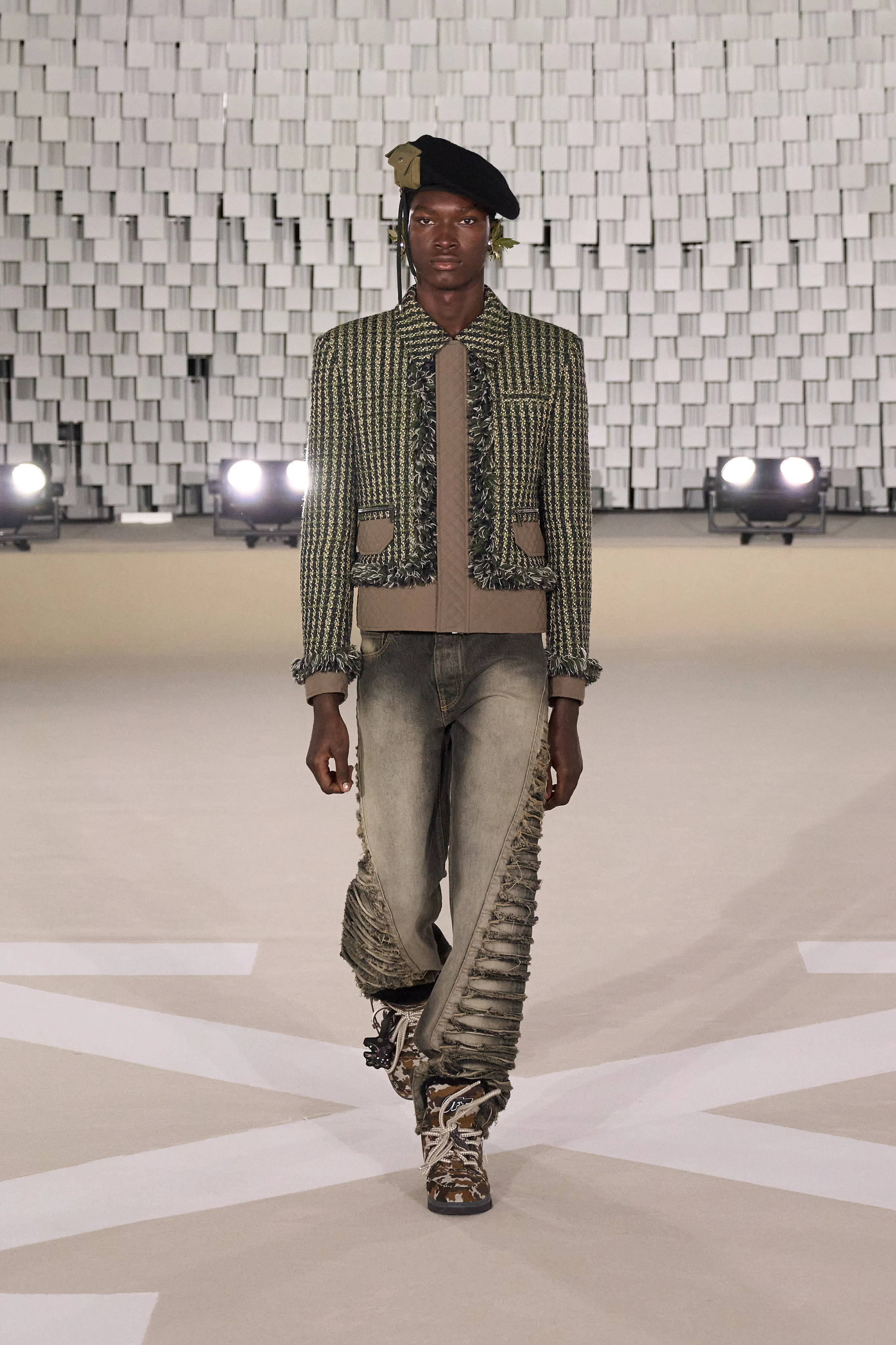 "Dans le sens de la communauté, je trouve que se trouvent la force et la grâce, la beauté et la joie d’être humain. J’imagine Off-White comme une société d’individus de tous âges, de toutes races et de tous horizons, qui s’efforcent d’exprimer leur véritable identité tout en se liant et en s’aidant les uns les autres, en partageant des valeurs et des visions", souligne Ib Kamara. Pour cette collection Off-White baptisée "State Of Resistance", le créatif a fait appel à des inspirations personnelles : les symboles ghanéens, les uniformes britanniques ou les influences punk. Si les uniformes sont un langage particulier, il a travaillé sur ces pièces en mettant en valeur les épaules comme signifiant à la fois la résistance et la force. La démocratie et l’humilité qui font partie intégrante de l’idée de communauté ont conduit à se concentrer sur des matières telles que le jersey et le denim, qui deviennent une toile pour expérimenter les délavages, le traitement, les formes. Les vêtements pour hommes et femmes partagent la même férocité, la palette neutre accentuée d’aqua, de violet et de rouge, le même accent sur les formes comme le varsity et le bomber, et même le nouveau Sand Bag, avec l’idée de quelque chose de commun à l’envers. Le denim déchiré, les épaules rembourrées, les vestes longues avec des sweats à capuche à l'intérieur, les shorts de sport et les pantalons anatomiques créent un riche mélange de cultures et de styles.