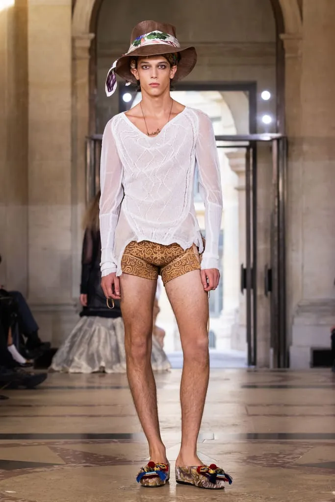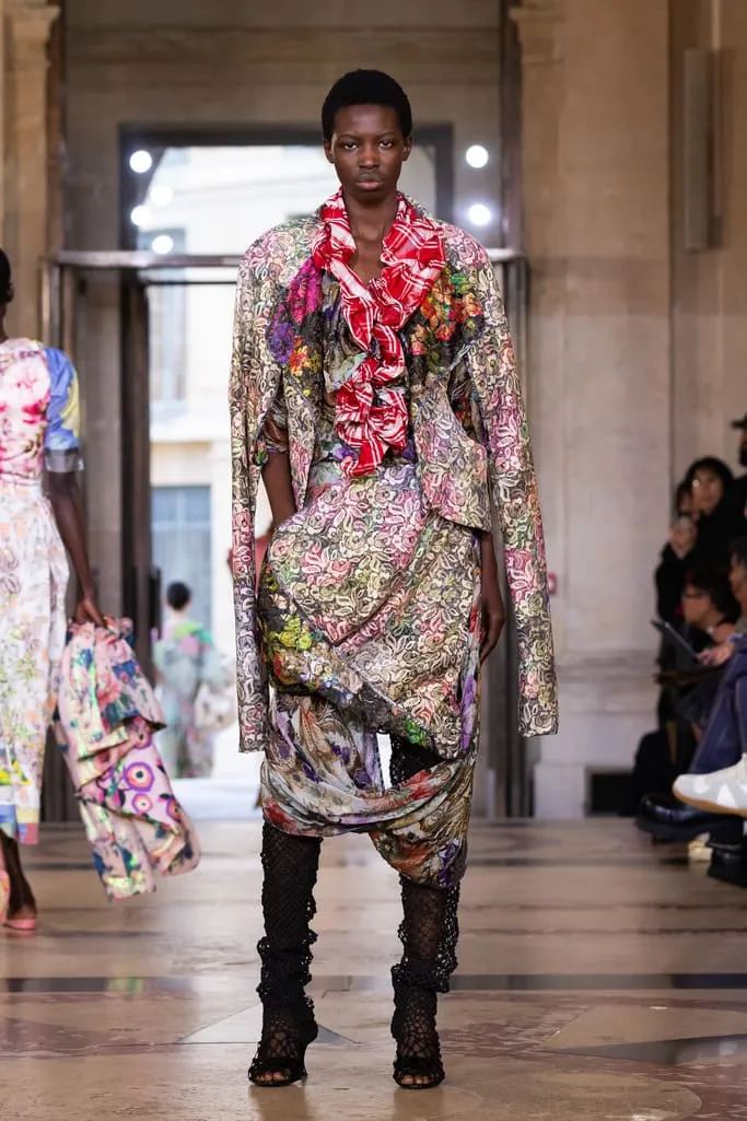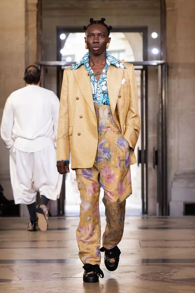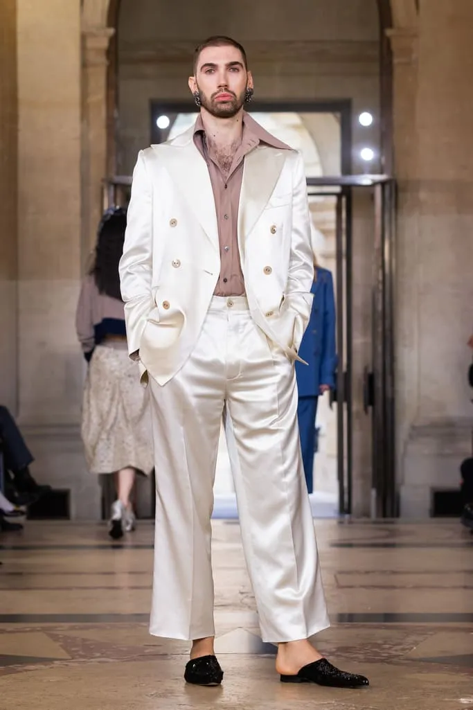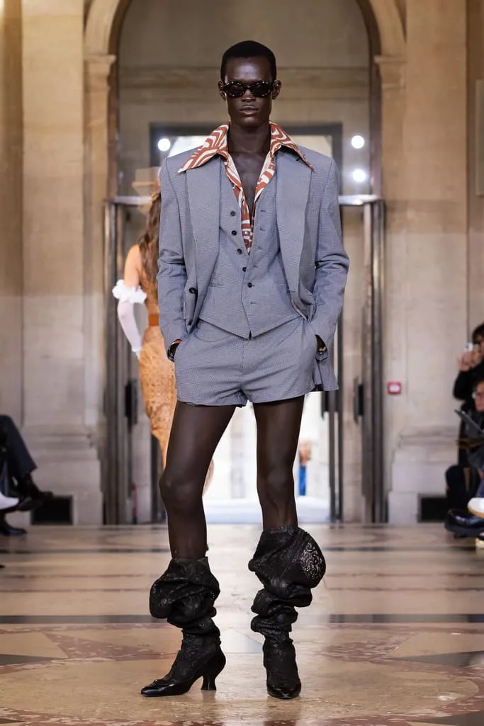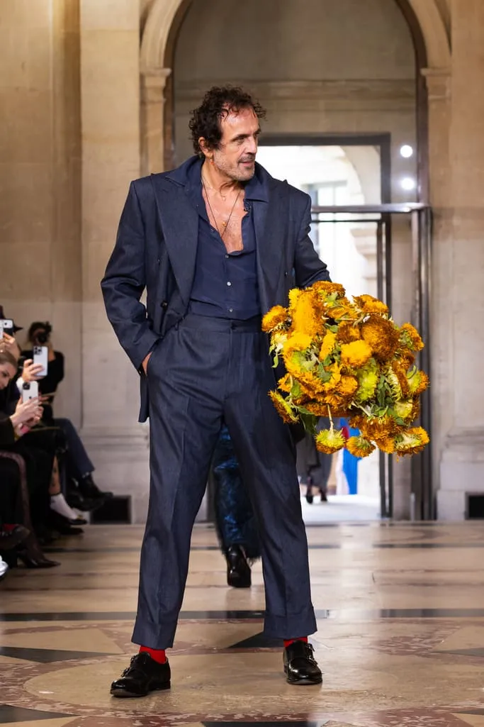 "Croit-on à la réincarnation ? Je peux raconter deux vies antérieures : d'abord en homme, soldat romain, puis en Reine de France. Vivienne et moi aimions les anciens parfums de Versailles qui ont inspiré notre nouvelle fragrance Boudoir, nom de cette collection. Boudoir évoque un espace privé, secret, sans distraction constante – là où l'on est au plus près de soi-même, où réside la vérité. La collection est née de draperies anciennes, traduites en vêtements. J'ai adoré ces tissus italiens typiques des marchés, combinés aux imprimés iconiques de la maison et à des tissus réutilisés. Vivant à Milan et ayant passé l'été en Sicile, je voulais capturer l'esprit méditerranéen : des vêtements faciles à vivre, ni vieux ni neufs, qui appartiennent à ceux qui les portent", explique Andreas Kronthaler. "Faire ce show à l'Institut de France, lieu culturel et historique majeur, est merveilleux. L'ikebana comprend des tournesols – ils illuminent notre terrasse londonienne et me font toujours sourire. Dans ce monde en mutation, j'ai choisi le dernier mouvement de Jupiter de Mozart, un son annonçant l'avenir avec espoir". Tout juste dévoilé et inspiré des parfums de l'Osmothèque de Versailles aimés par Vivienne, "Boudoir" sublime la sensualité. Élégant et contrasté, ancré dans une approche consciente mêlant tradition et innovation. Disponible dès ce 4 octobre dans les boutiques phares de Londres, Paris, Milan, New York et L.A.
