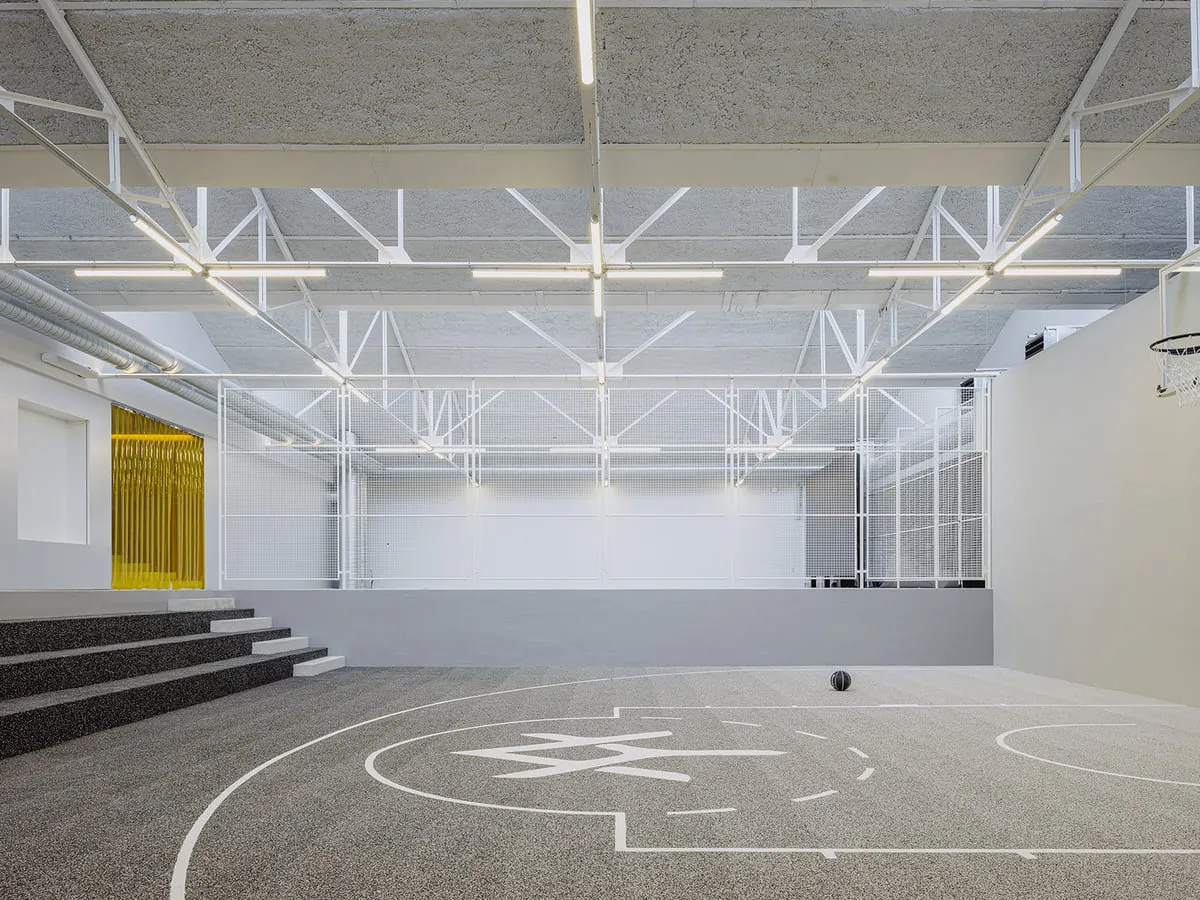 Chaque lieu possède son caractère propre. La Galerie, cœur battant du campus, mélange béton brut et touches de couleur vive qui reflètent l'énergie de YARD. C'est un espace de respiration, ouvert sur la cuisine commune, où l'on se croise, échange et collabore. La Fabrique joue sur un registre plus doux avec son bois clair et ses tonalités sable, créant une ambiance apaisante pour le travail de création. Quant au Yard Hall, c'est le grand manifeste du projet : une scène modulable généreuse où la hauteur sous plafond et la charpente apparente célèbrent l'esprit du lieu. C’est d’ailleurs dans cet espace que les productions s’enchaînent : "entre shootings, vidéos, événements sportifs ou culturels et rencontres", souligne Tom Brunet, co-fondateur de YARD.