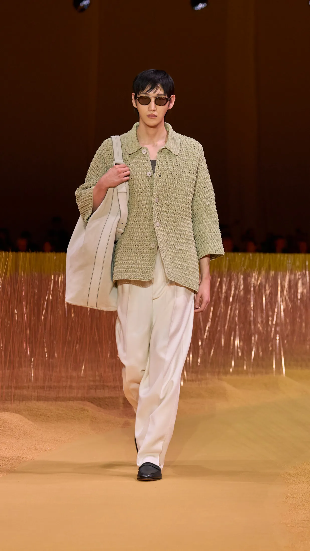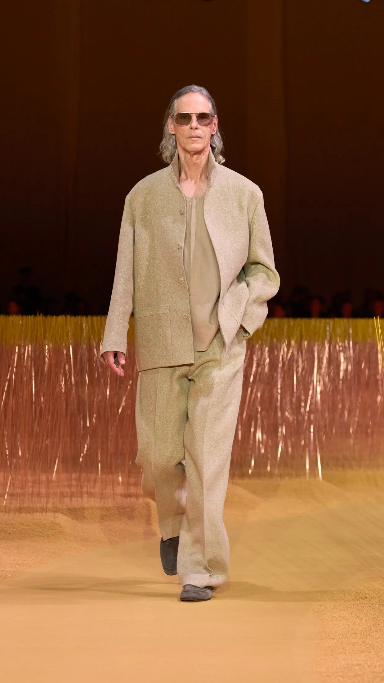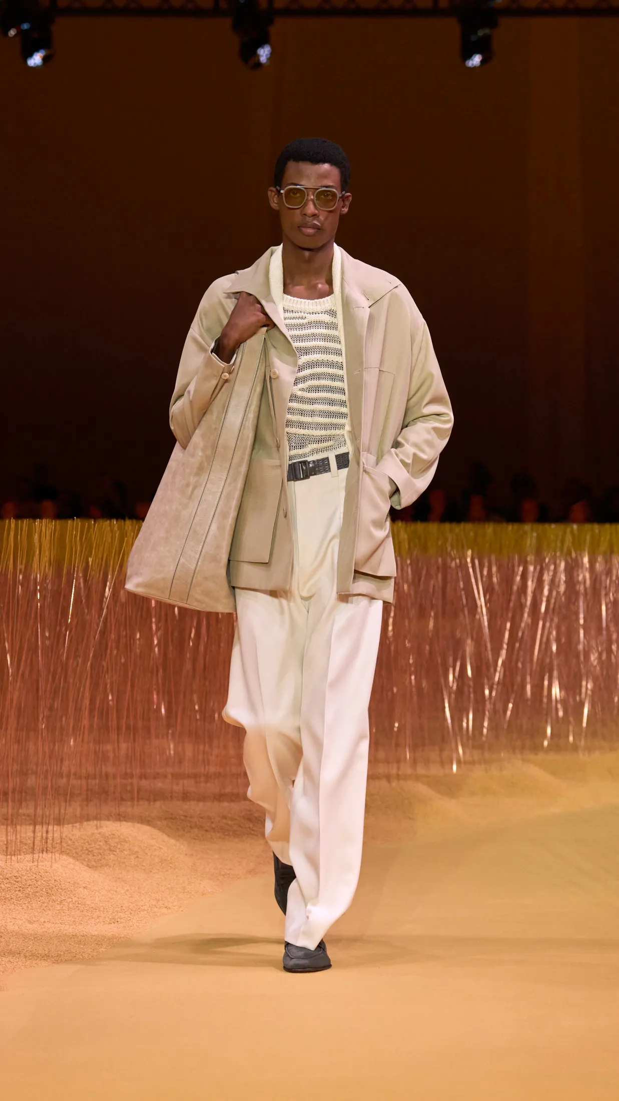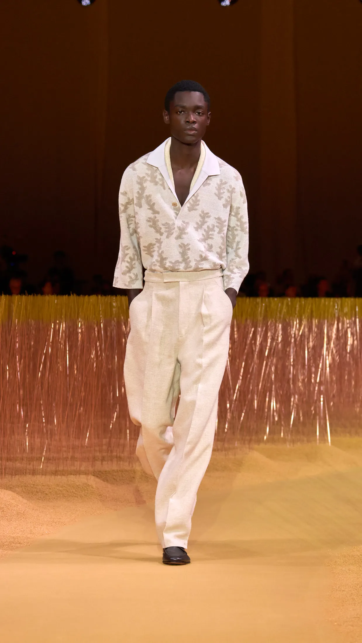 Présentée en bordure de Milan, la collection Zegna été 2025 fait tomber la barrière des genres et des âges en déclinant le lin sous toutes ses formes. Dans une salle aux tons ocres, dont le sol est parsemé de clairières de pousses de lin, hommes et femmes défilent dans toutes leurs individualités. À travers Oasi Lino, c’est la pluralité des possibles qu’a voulu explorer le directeur artistique Alessandro Sartori. “Il y a quelque chose de profondément italien dans cette collection”, explique-t-il. Certains looks rappellent l’Italie des années 1980, couleurs sombres, blousons en cuir, mocassins noirs, écharpes et mallettes en daim, à l’image des gangsters célèbres du cinéma. Puis, sans transition, le défilé emmène ses spectateurs au bord de la Méditerranée : chemise ouverte, couleurs criardes et motifs corail. Alessandro Sartori semble avoir plus d’un tour dans son sac tout en mettant l’accent sur l’éthique de durabilité et de traçabilité des matériaux utilisés. Cette matière fluide et révélatrice qu’est le lin offre un grand nombre de possibilités quant à la création de pièces. Des vestes et manteaux aux volumes enveloppants, en passant par des blazers allongés, jusqu’aux polos en mailles et shorts d’été colorés, rien n’est laissé au hasard. Pour les couleurs, la proposition est tout aussi variée : blanc, jaune sennelier, bleu turquoise, sable, marron, terracotta, et noir opaque qui renforcent cette idée de diversité. Zegna clôture le défilé en beauté avec l’apparition de l’acteur danois Mads Mikkelsen fermant la marche habillée d’un rouge sombre et provocateur.