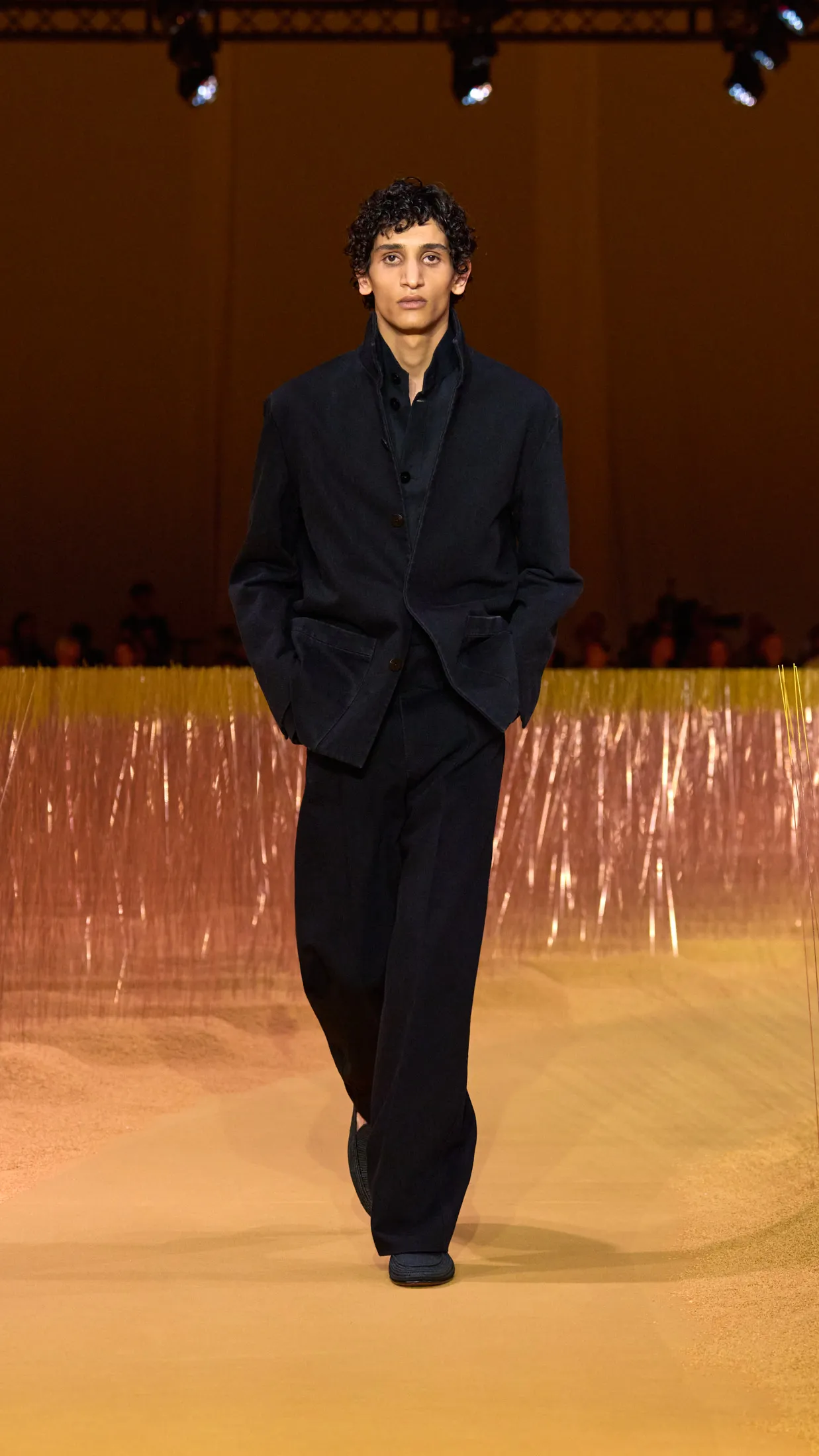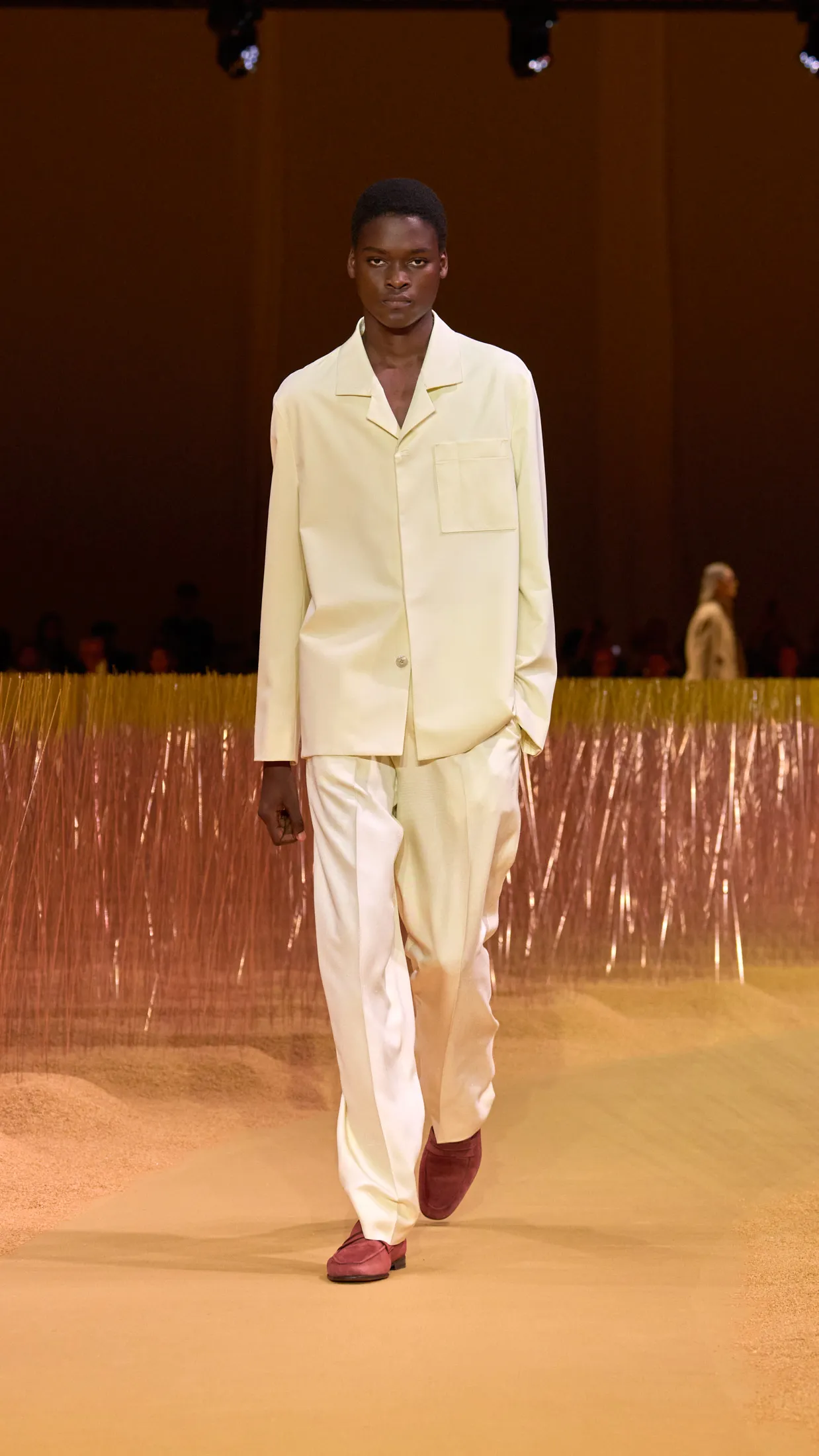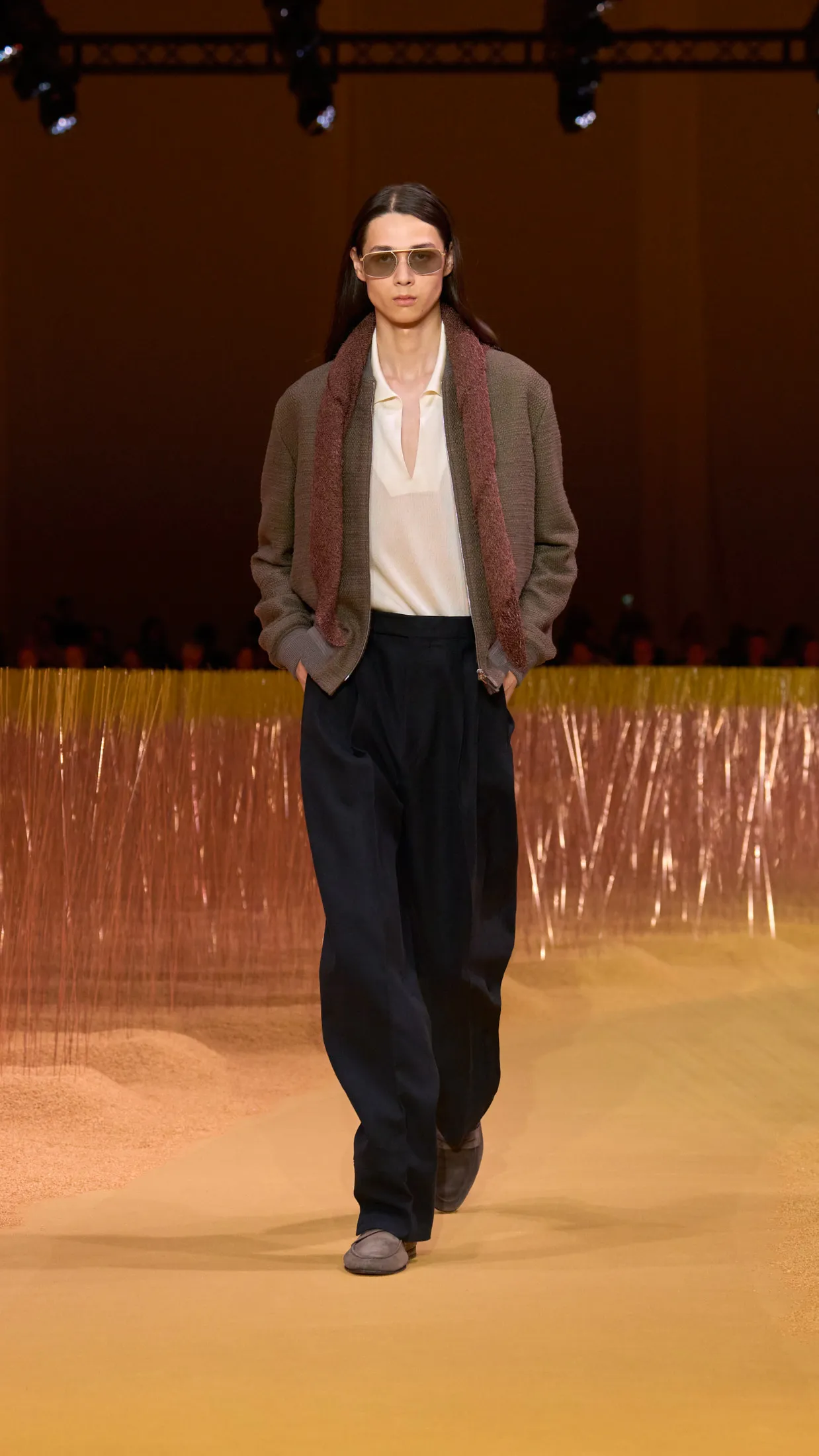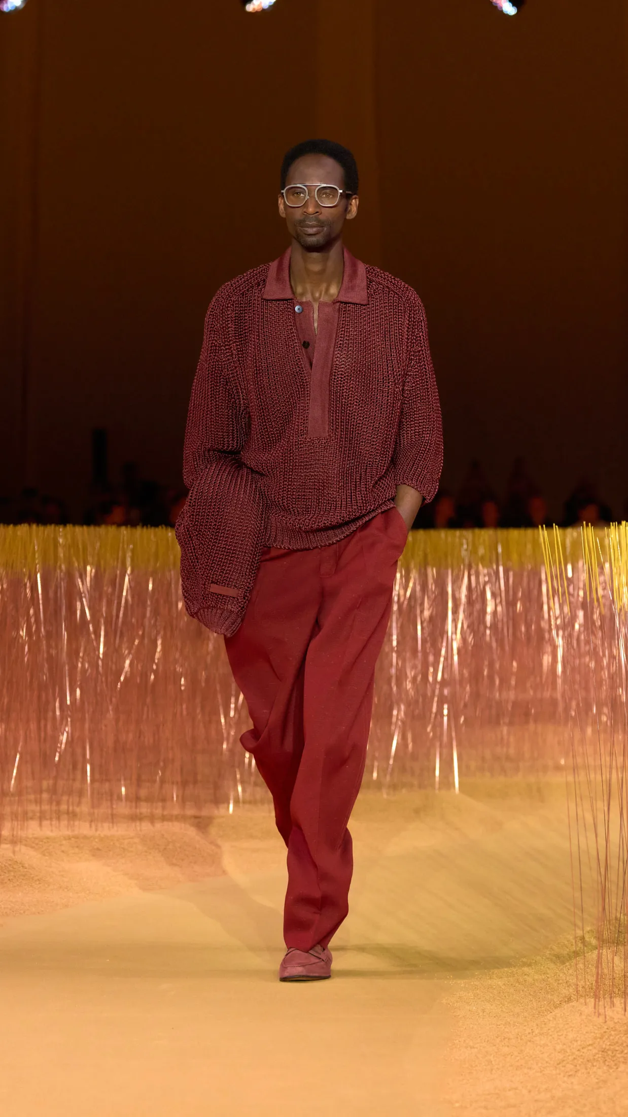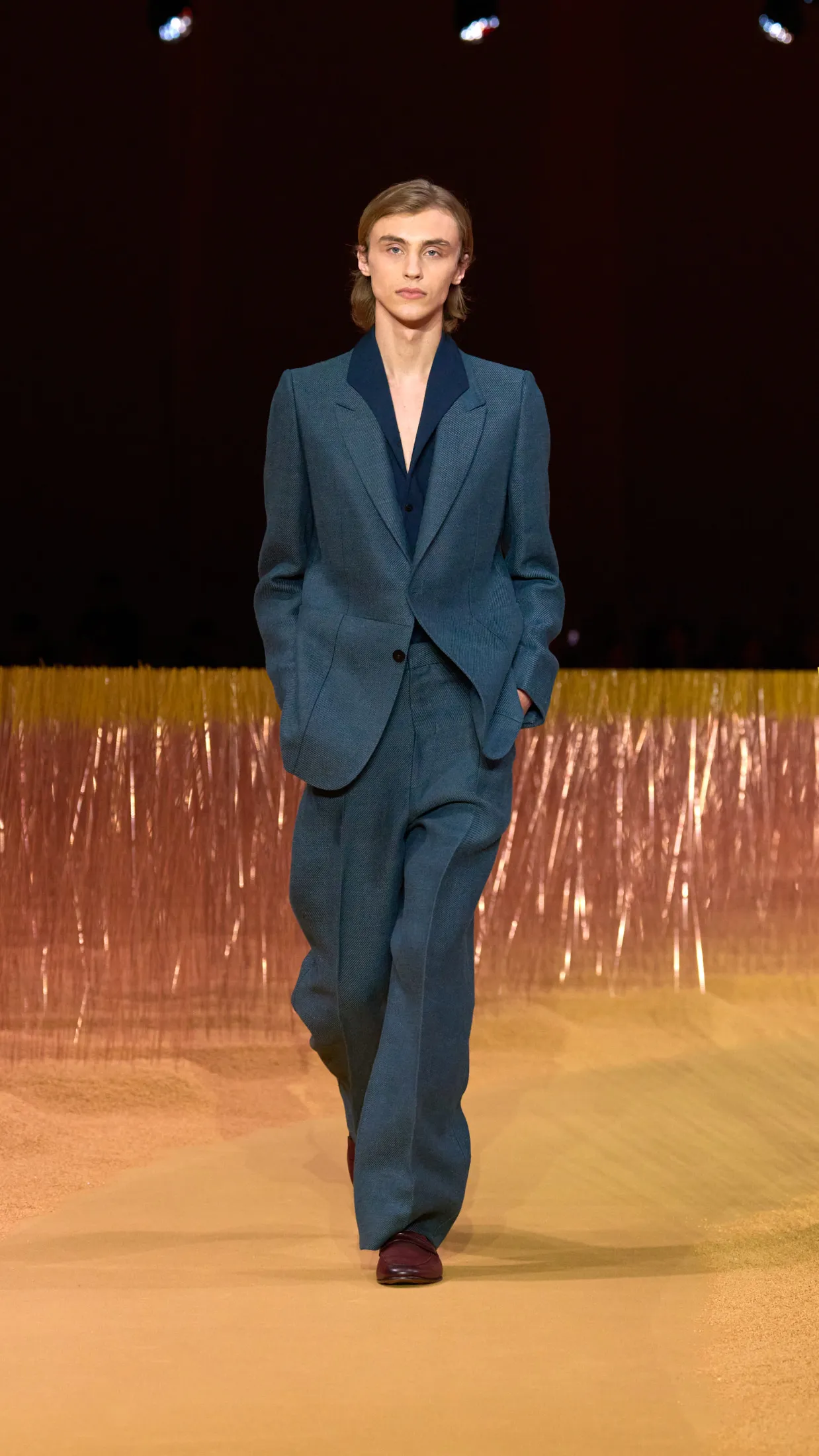 Présentée en bordure de Milan, la collection Zegna été 2025 fait tomber la barrière des genres et des âges en déclinant le lin sous toutes ses formes. Dans une salle aux tons ocres, dont le sol est parsemé de clairières de pousses de lin, hommes et femmes défilent dans toutes leurs individualités. À travers Oasi Lino, c’est la pluralité des possibles qu’a voulu explorer le directeur artistique Alessandro Sartori. “Il y a quelque chose de profondément italien dans cette collection”, explique-t-il. Certains looks rappellent l’Italie des années 1980, couleurs sombres, blousons en cuir, mocassins noirs, écharpes et mallettes en daim, à l’image des gangsters célèbres du cinéma. Puis, sans transition, le défilé emmène ses spectateurs au bord de la Méditerranée : chemise ouverte, couleurs criardes et motifs corail. Alessandro Sartori semble avoir plus d’un tour dans son sac tout en mettant l’accent sur l’éthique de durabilité et de traçabilité des matériaux utilisés. Cette matière fluide et révélatrice qu’est le lin offre un grand nombre de possibilités quant à la création de pièces. Des vestes et manteaux aux volumes enveloppants, en passant par des blazers allongés, jusqu’aux polos en mailles et shorts d’été colorés, rien n’est laissé au hasard. Pour les couleurs, la proposition est tout aussi variée : blanc, jaune sennelier, bleu turquoise, sable, marron, terracotta, et noir opaque qui renforcent cette idée de diversité. Zegna clôture le défilé en beauté avec l’apparition de l’acteur danois Mads Mikkelsen fermant la marche habillée d’un rouge sombre et provocateur.