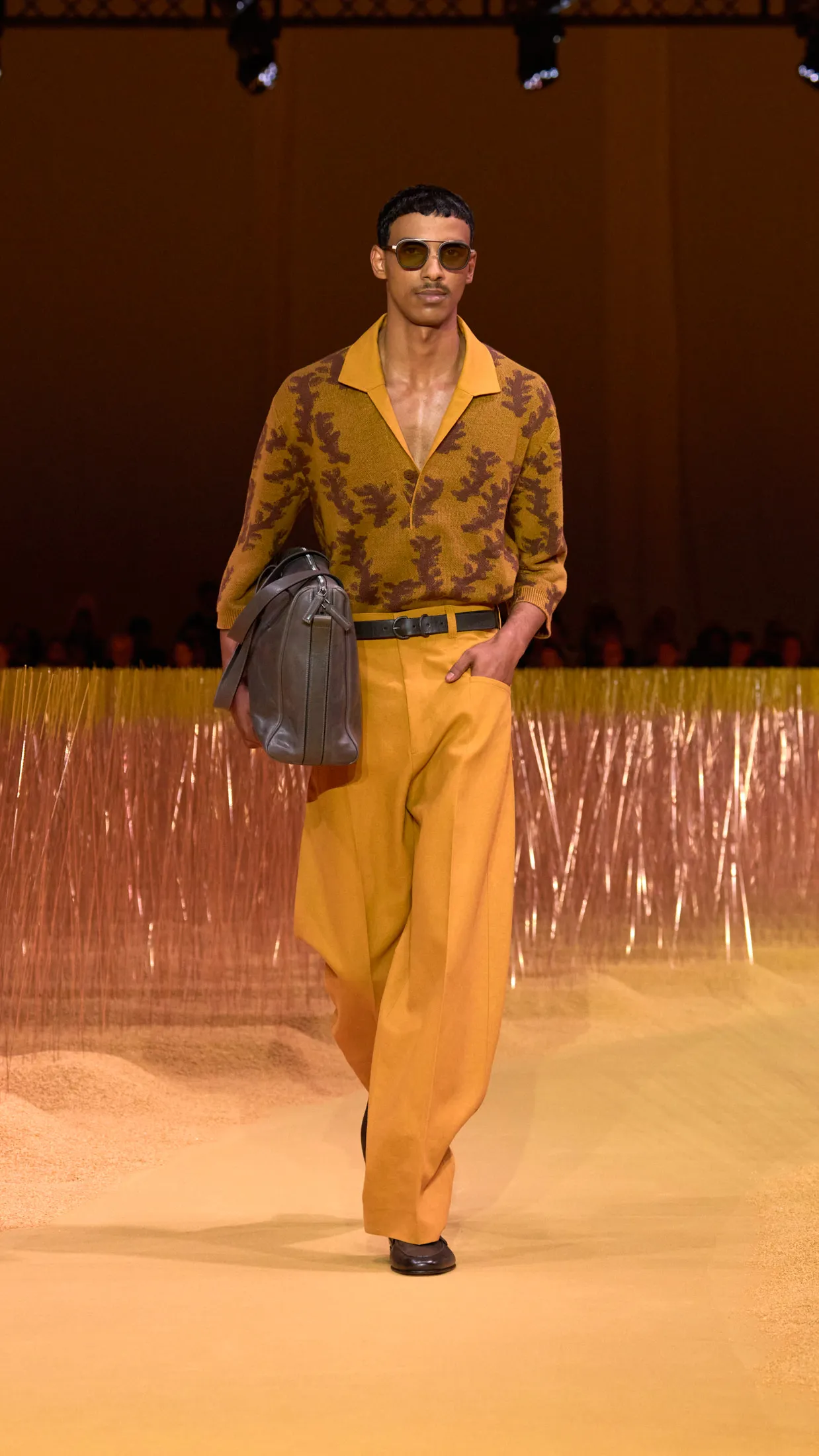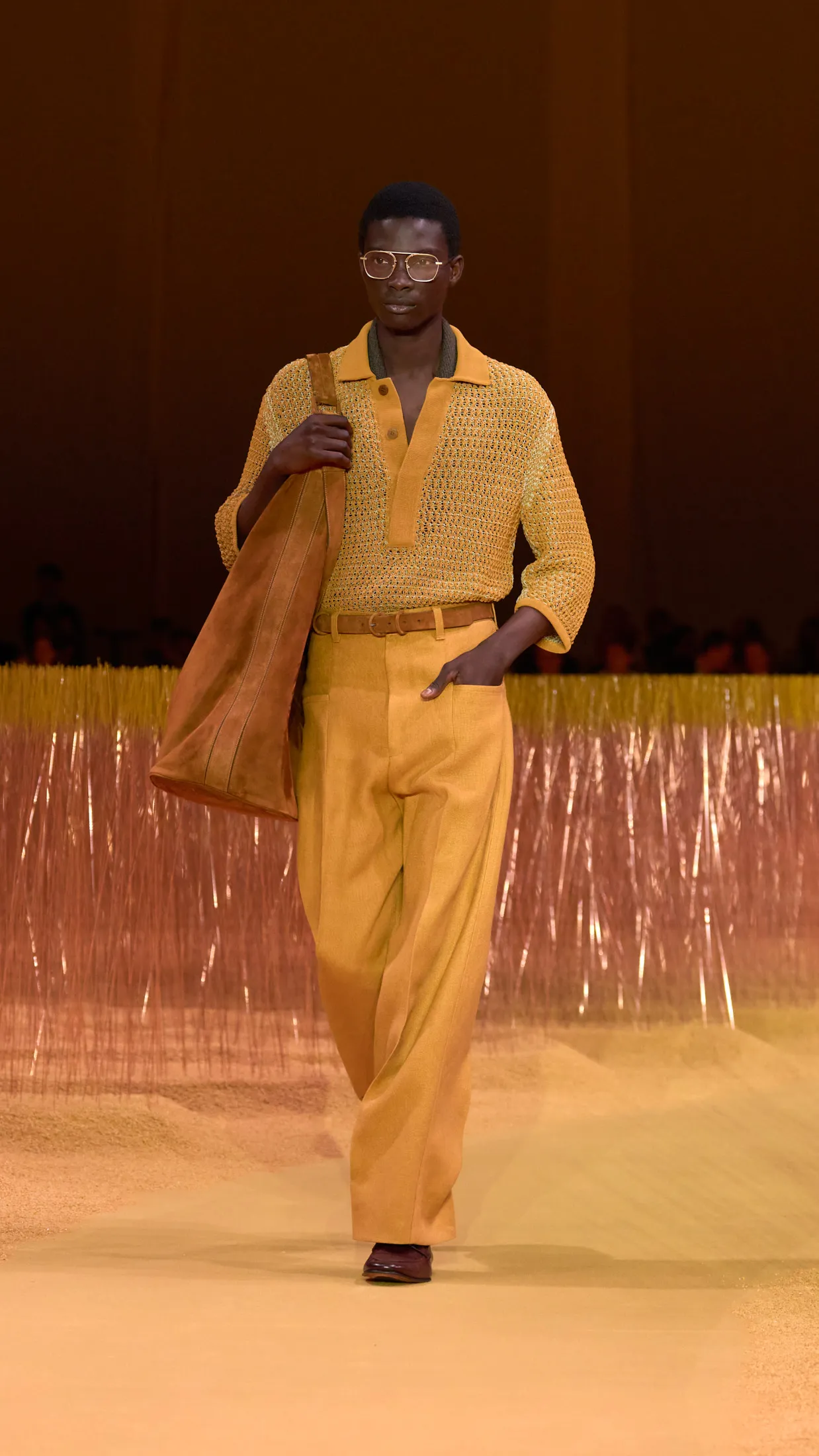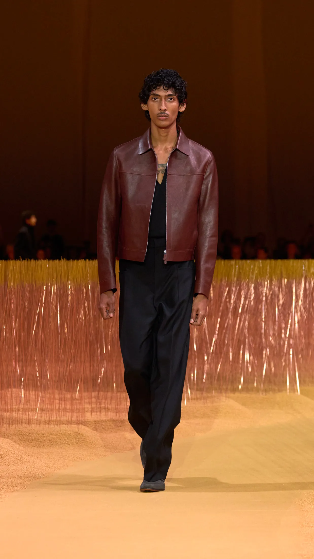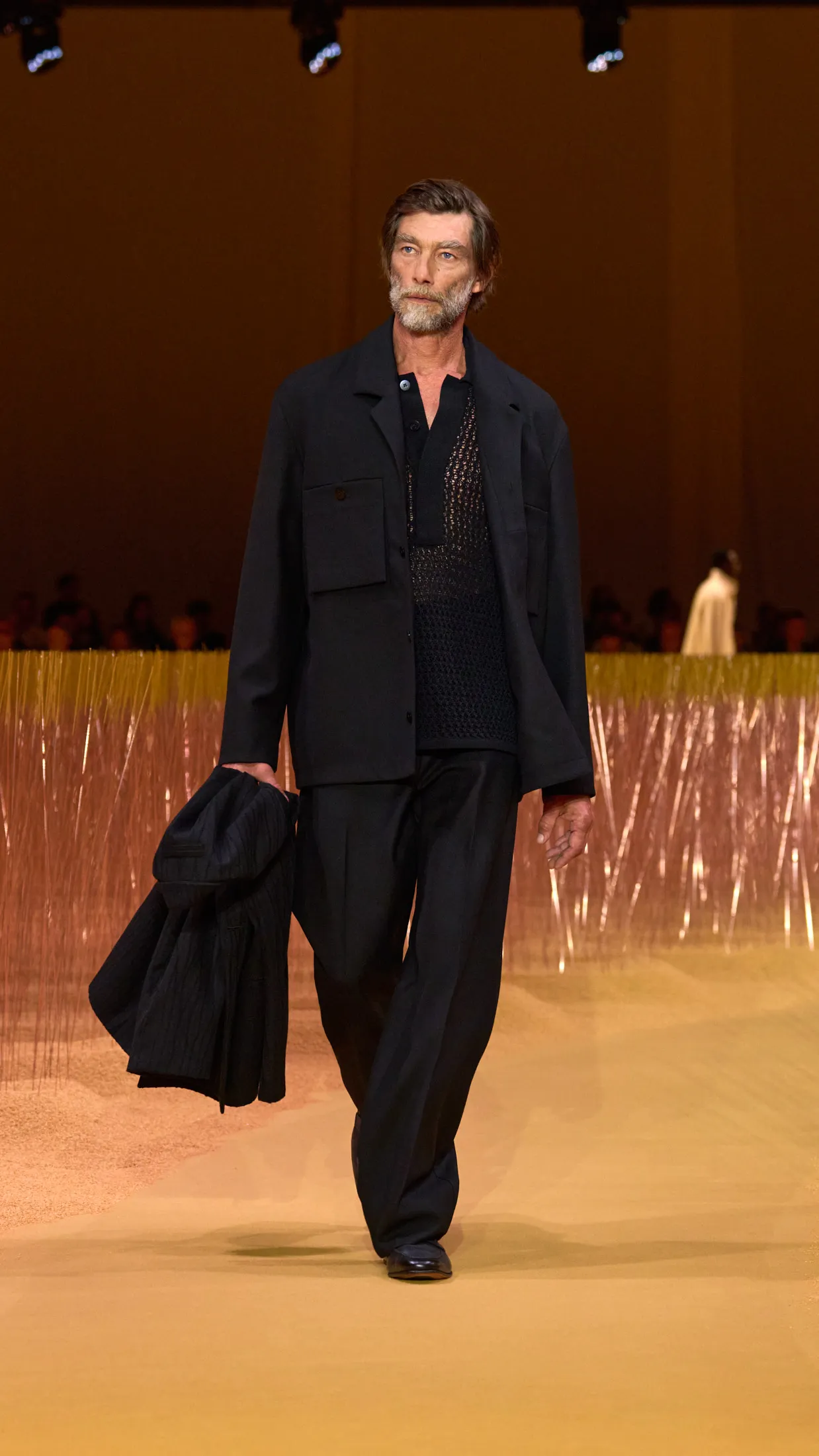 Présentée en bordure de Milan, la collection Zegna été 2025 fait tomber la barrière des genres et des âges en déclinant le lin sous toutes ses formes. Dans une salle aux tons ocres, dont le sol est parsemé de clairières de pousses de lin, hommes et femmes défilent dans toutes leurs individualités. À travers Oasi Lino, c’est la pluralité des possibles qu’a voulu explorer le directeur artistique Alessandro Sartori. “Il y a quelque chose de profondément italien dans cette collection”, explique-t-il. Certains looks rappellent l’Italie des années 1980, couleurs sombres, blousons en cuir, mocassins noirs, écharpes et mallettes en daim, à l’image des gangsters célèbres du cinéma. Puis, sans transition, le défilé emmène ses spectateurs au bord de la Méditerranée : chemise ouverte, couleurs criardes et motifs corail. Alessandro Sartori semble avoir plus d’un tour dans son sac tout en mettant l’accent sur l’éthique de durabilité et de traçabilité des matériaux utilisés. Cette matière fluide et révélatrice qu’est le lin offre un grand nombre de possibilités quant à la création de pièces. Des vestes et manteaux aux volumes enveloppants, en passant par des blazers allongés, jusqu’aux polos en mailles et shorts d’été colorés, rien n’est laissé au hasard. Pour les couleurs, la proposition est tout aussi variée : blanc, jaune sennelier, bleu turquoise, sable, marron, terracotta, et noir opaque qui renforcent cette idée de diversité. Zegna clôture le défilé en beauté avec l’apparition de l’acteur danois Mads Mikkelsen fermant la marche habillée d’un rouge sombre et provocateur.