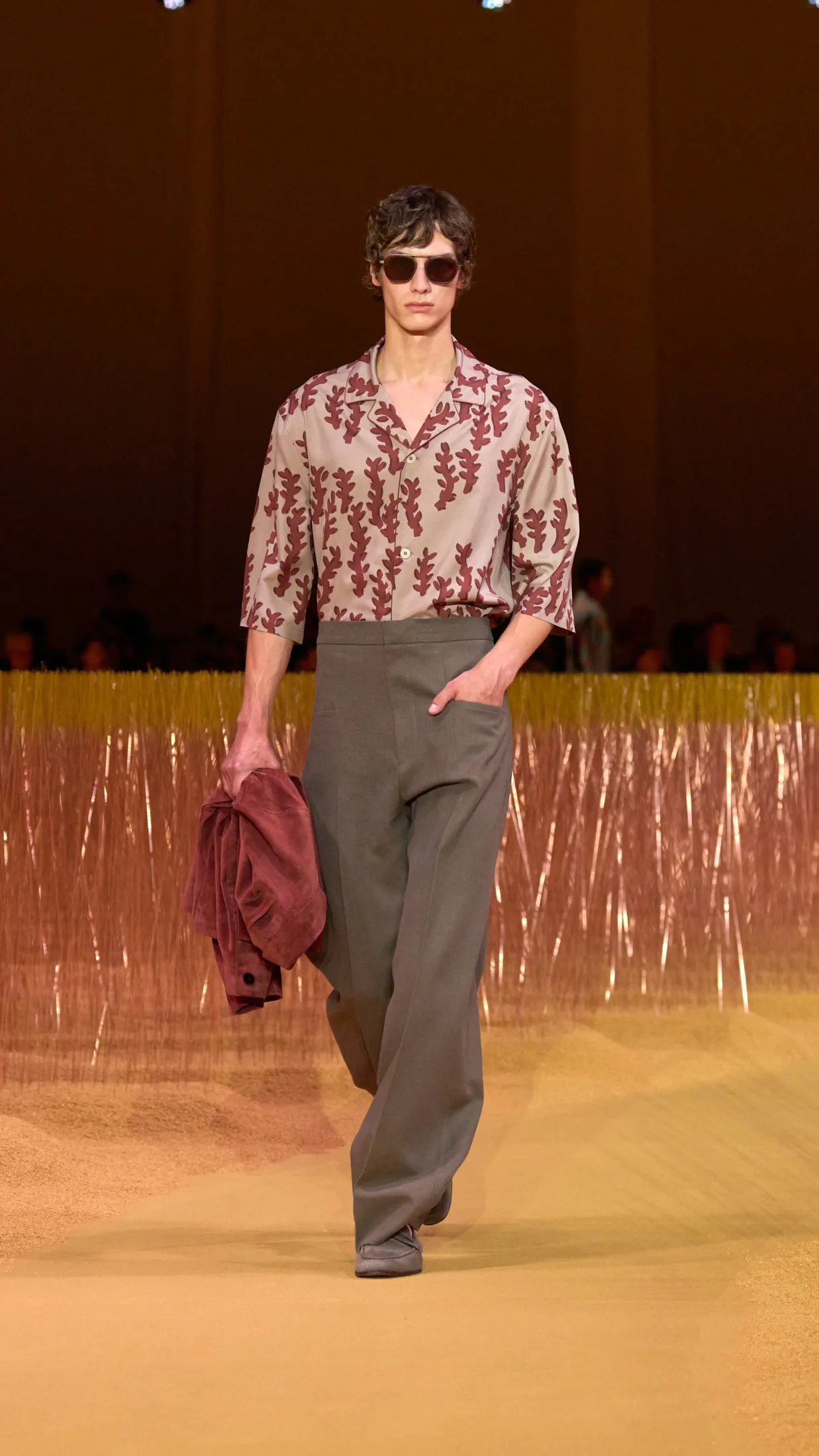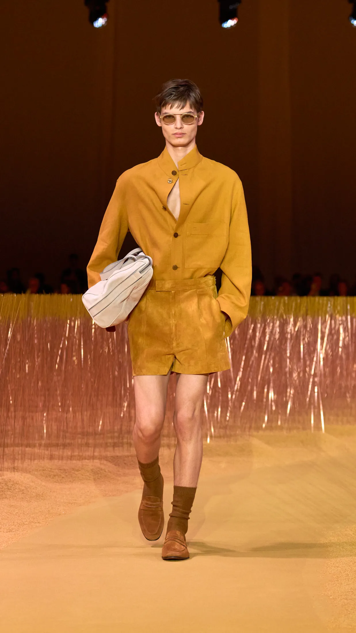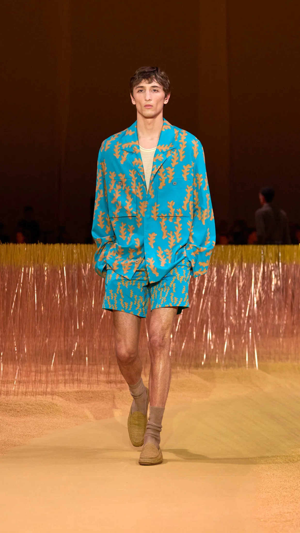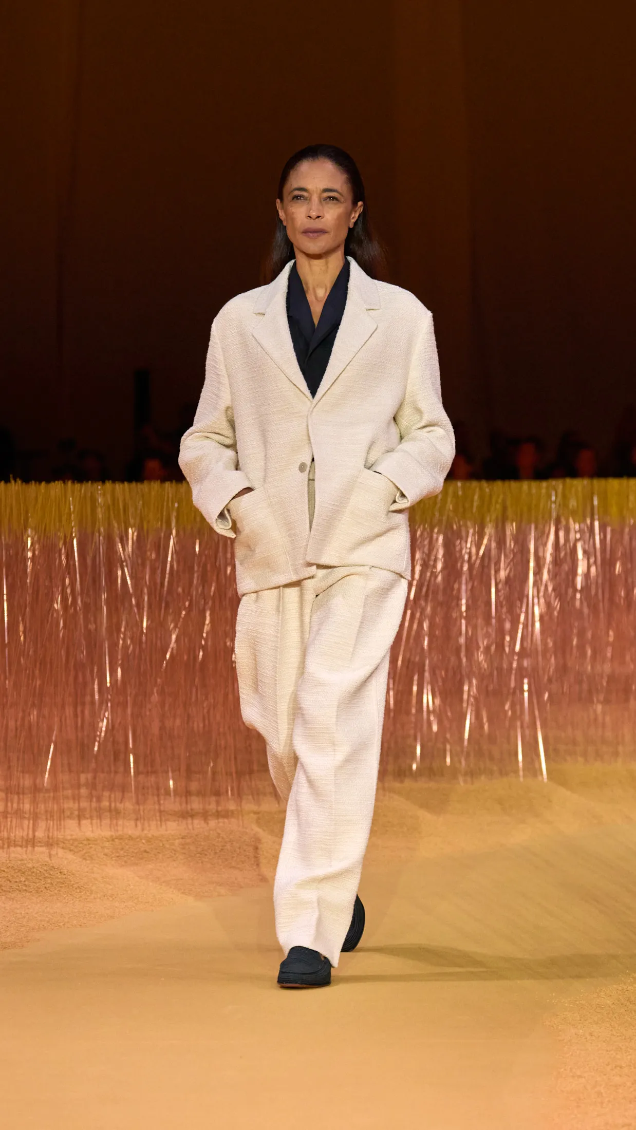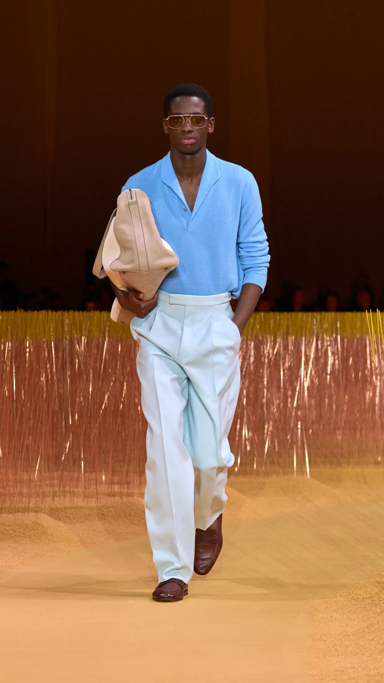 Présentée en bordure de Milan, la collection Zegna été 2025 fait tomber la barrière des genres et des âges en déclinant le lin sous toutes ses formes. Dans une salle aux tons ocres, dont le sol est parsemé de clairières de pousses de lin, hommes et femmes défilent dans toutes leurs individualités. À travers Oasi Lino, c’est la pluralité des possibles qu’a voulu explorer le directeur artistique Alessandro Sartori. “Il y a quelque chose de profondément italien dans cette collection”, explique-t-il. Certains looks rappellent l’Italie des années 1980, couleurs sombres, blousons en cuir, mocassins noirs, écharpes et mallettes en daim, à l’image des gangsters célèbres du cinéma. Puis, sans transition, le défilé emmène ses spectateurs au bord de la Méditerranée : chemise ouverte, couleurs criardes et motifs corail. Alessandro Sartori semble avoir plus d’un tour dans son sac tout en mettant l’accent sur l’éthique de durabilité et de traçabilité des matériaux utilisés. Cette matière fluide et révélatrice qu’est le lin offre un grand nombre de possibilités quant à la création de pièces. Des vestes et manteaux aux volumes enveloppants, en passant par des blazers allongés, jusqu’aux polos en mailles et shorts d’été colorés, rien n’est laissé au hasard. Pour les couleurs, la proposition est tout aussi variée : blanc, jaune sennelier, bleu turquoise, sable, marron, terracotta, et noir opaque qui renforcent cette idée de diversité. Zegna clôture le défilé en beauté avec l’apparition de l’acteur danois Mads Mikkelsen fermant la marche habillée d’un rouge sombre et provocateur.