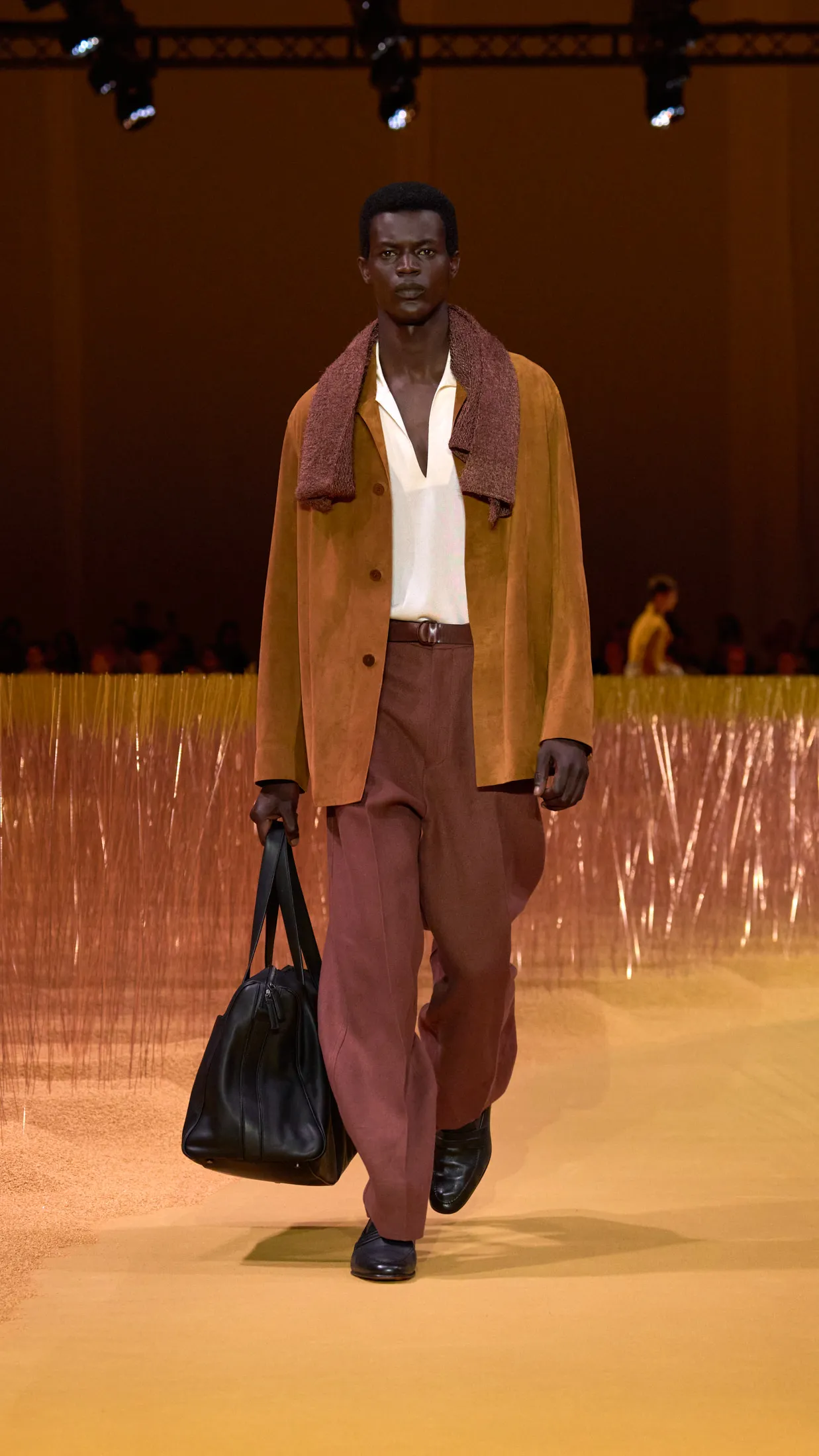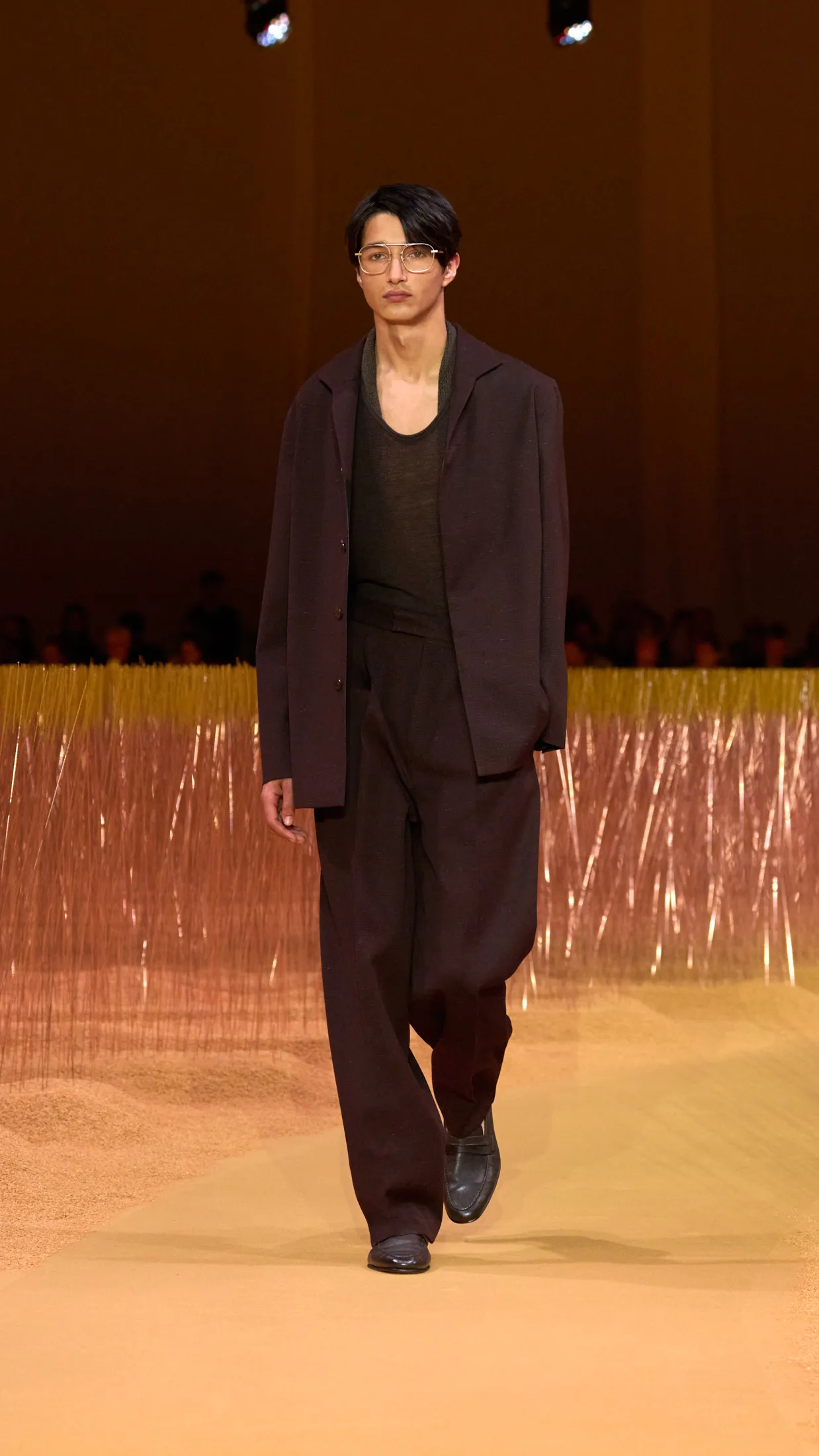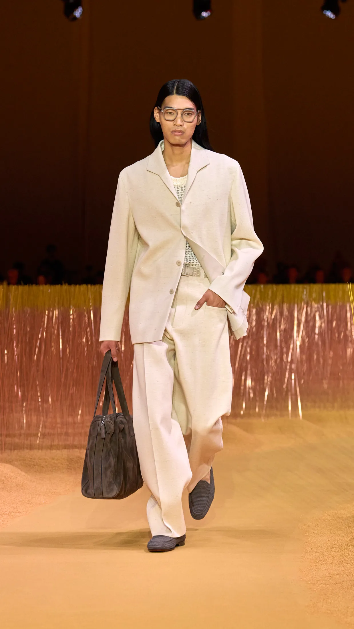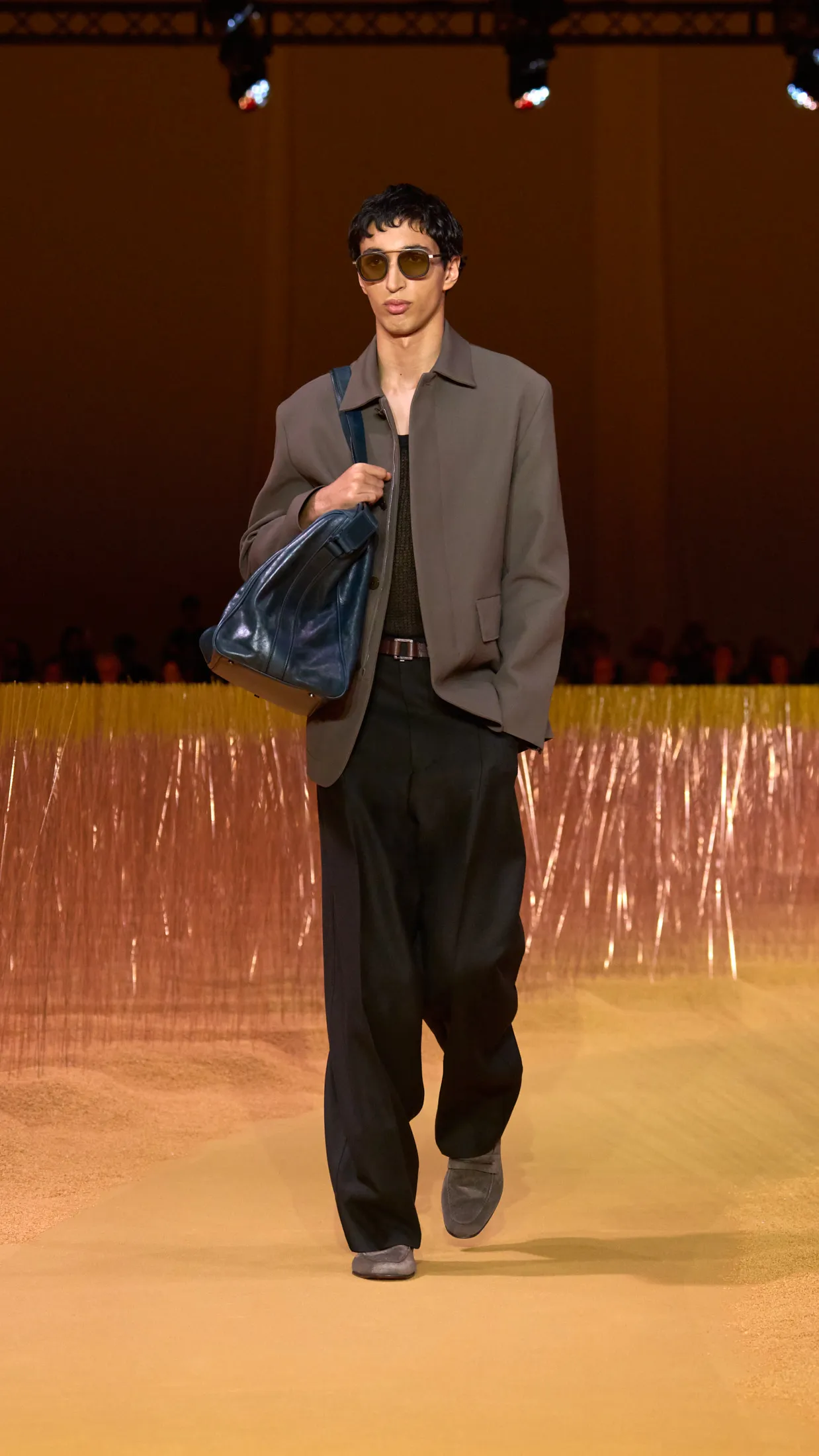 Présentée en bordure de Milan, la collection Zegna été 2025 fait tomber la barrière des genres et des âges en déclinant le lin sous toutes ses formes. Dans une salle aux tons ocres, dont le sol est parsemé de clairières de pousses de lin, hommes et femmes défilent dans toutes leurs individualités. À travers Oasi Lino, c’est la pluralité des possibles qu’a voulu explorer le directeur artistique Alessandro Sartori. “Il y a quelque chose de profondément italien dans cette collection”, explique-t-il. Certains looks rappellent l’Italie des années 1980, couleurs sombres, blousons en cuir, mocassins noirs, écharpes et mallettes en daim, à l’image des gangsters célèbres du cinéma. Puis, sans transition, le défilé emmène ses spectateurs au bord de la Méditerranée : chemise ouverte, couleurs criardes et motifs corail. Alessandro Sartori semble avoir plus d’un tour dans son sac tout en mettant l’accent sur l’éthique de durabilité et de traçabilité des matériaux utilisés. Cette matière fluide et révélatrice qu’est le lin offre un grand nombre de possibilités quant à la création de pièces. Des vestes et manteaux aux volumes enveloppants, en passant par des blazers allongés, jusqu’aux polos en mailles et shorts d’été colorés, rien n’est laissé au hasard. Pour les couleurs, la proposition est tout aussi variée : blanc, jaune sennelier, bleu turquoise, sable, marron, terracotta, et noir opaque qui renforcent cette idée de diversité. Zegna clôture le défilé en beauté avec l’apparition de l’acteur danois Mads Mikkelsen fermant la marche habillée d’un rouge sombre et provocateur.