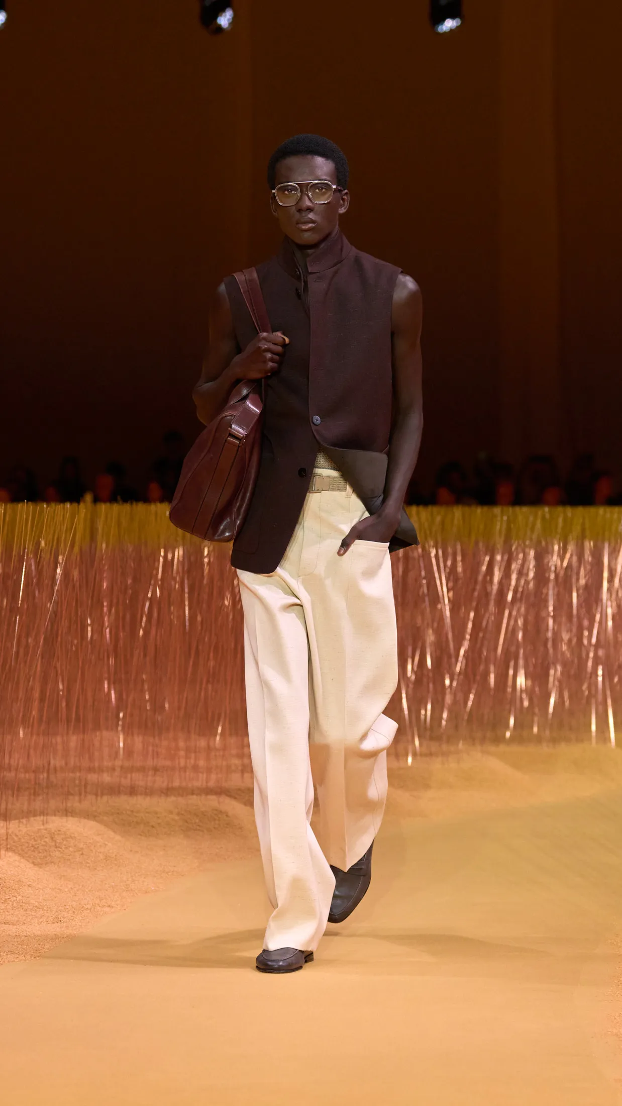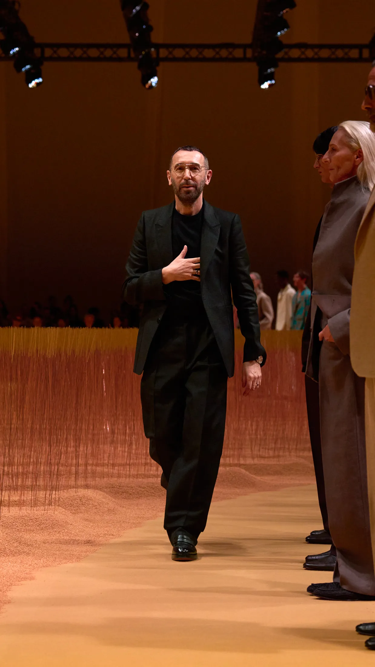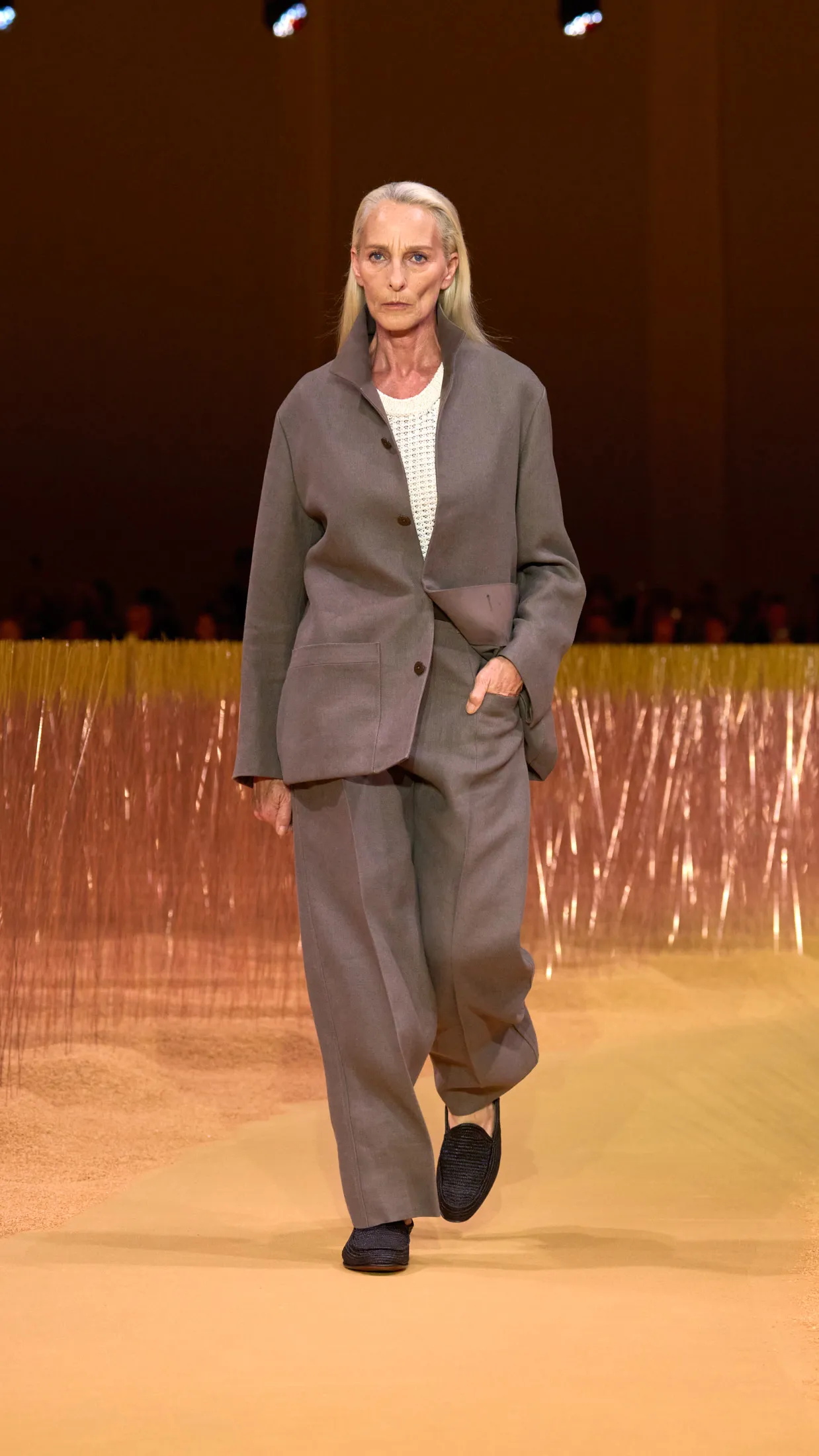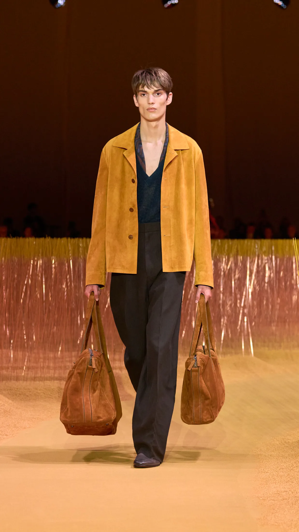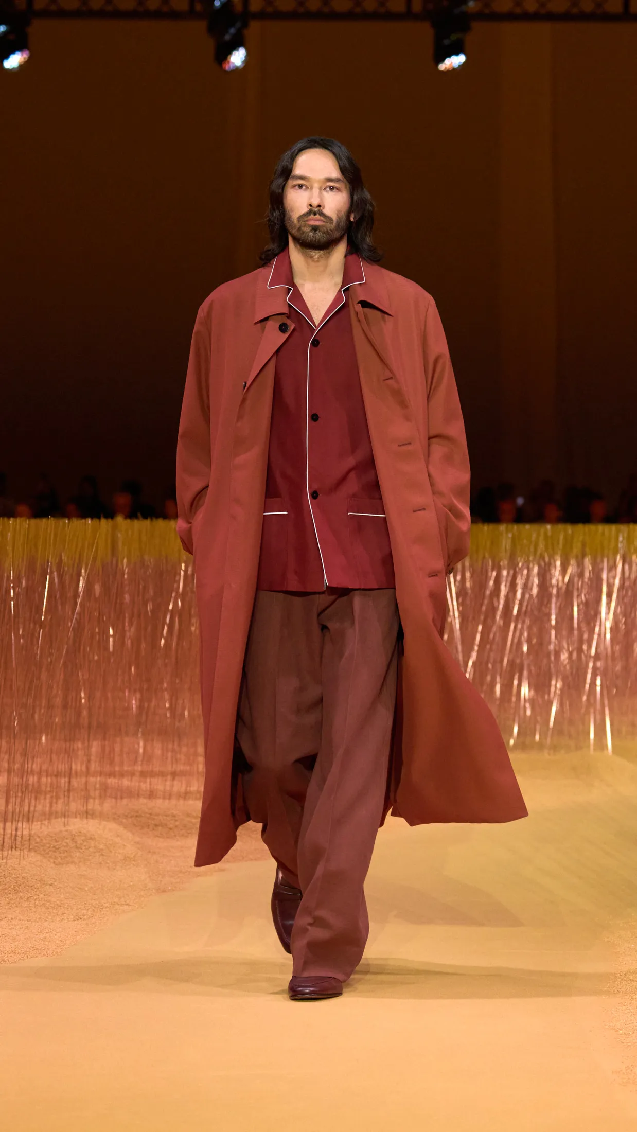 Présentée en bordure de Milan, la collection Zegna été 2025 fait tomber la barrière des genres et des âges en déclinant le lin sous toutes ses formes. Dans une salle aux tons ocres, dont le sol est parsemé de clairières de pousses de lin, hommes et femmes défilent dans toutes leurs individualités. À travers Oasi Lino, c’est la pluralité des possibles qu’a voulu explorer le directeur artistique Alessandro Sartori. “Il y a quelque chose de profondément italien dans cette collection”, explique-t-il. Certains looks rappellent l’Italie des années 1980, couleurs sombres, blousons en cuir, mocassins noirs, écharpes et mallettes en daim, à l’image des gangsters célèbres du cinéma. Puis, sans transition, le défilé emmène ses spectateurs au bord de la Méditerranée : chemise ouverte, couleurs criardes et motifs corail. Alessandro Sartori semble avoir plus d’un tour dans son sac tout en mettant l’accent sur l’éthique de durabilité et de traçabilité des matériaux utilisés. Cette matière fluide et révélatrice qu’est le lin offre un grand nombre de possibilités quant à la création de pièces. Des vestes et manteaux aux volumes enveloppants, en passant par des blazers allongés, jusqu’aux polos en mailles et shorts d’été colorés, rien n’est laissé au hasard. Pour les couleurs, la proposition est tout aussi variée : blanc, jaune sennelier, bleu turquoise, sable, marron, terracotta, et noir opaque qui renforcent cette idée de diversité. Zegna clôture le défilé en beauté avec l’apparition de l’acteur danois Mads Mikkelsen fermant la marche habillée d’un rouge sombre et provocateur.