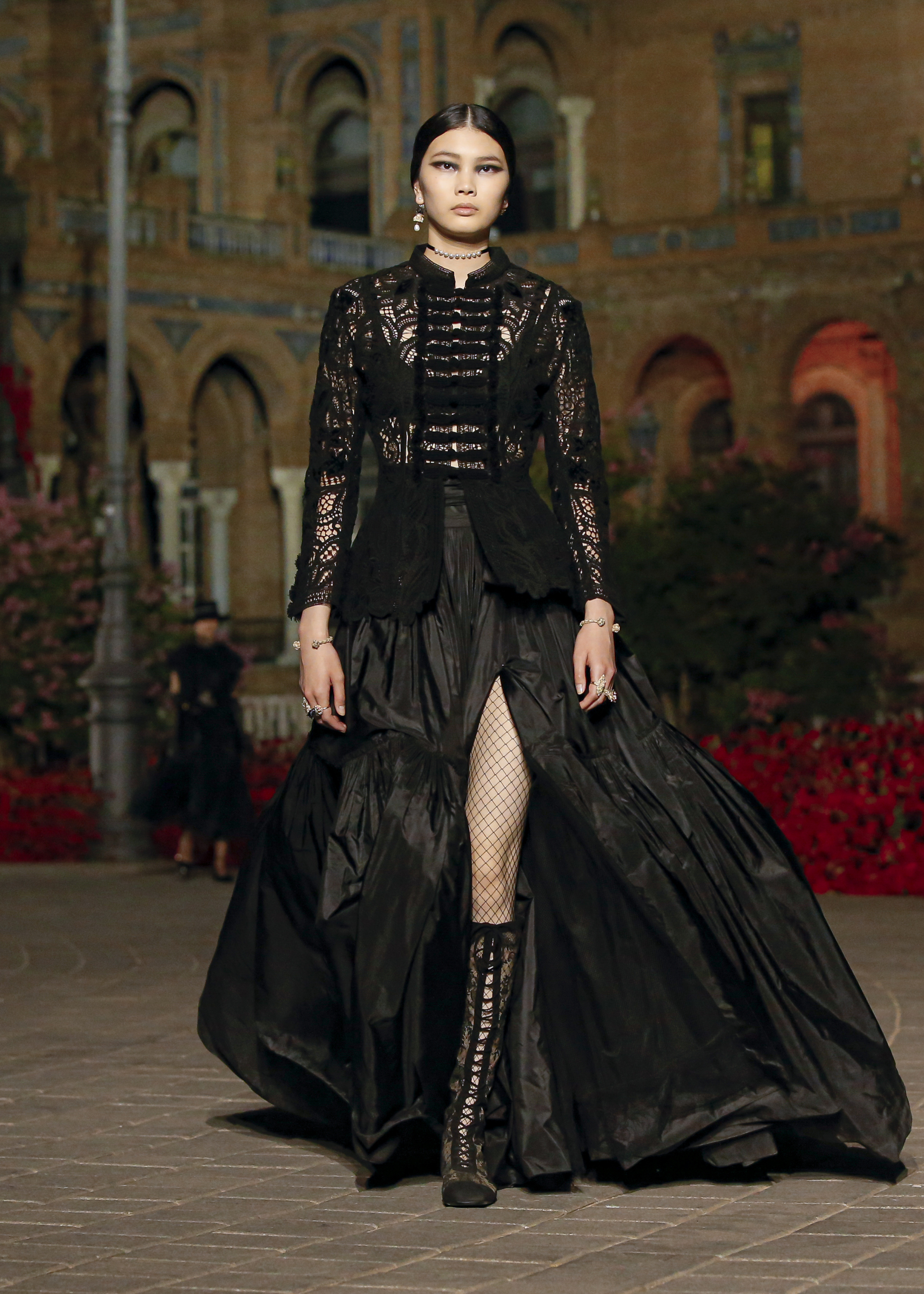 La collection Dior croisière 2023 est pour Maria Grazia Chiuri un chemin fait de découvertes, d’imaginaire et de réflexions, entre héritage et inventivité. Présenté à Séville, au cœur de la majestueuse place d’Espagne, le défilé rend hommage aux ferias espagnoles, de l’art de la danse à la tradition équestre. L’icône de cette ligne est La Capitana, le nom donné à Carmen Amaya, représentant l’essence même du flamenco, avec sa liberté de le danser qui réinvente les règles. En écho à ces inspirations, les looks évoquent, par exemple, la duchesse d’Albe, personnage légendaire, montant à cheval avec Jackie Kennedy. L’emblématique châle de Manille raconte tous les récits et les voyages des communautés qui l’ont conçu et arboré ; les silhouettes se font ainsi les narratrices des histoires de ces "objets nomades" aux voix plurielles. Au croisement de ces rencontres exaltant des savoir-faire d’excellence, les créations célèbrent les multiples visions de la féminité.