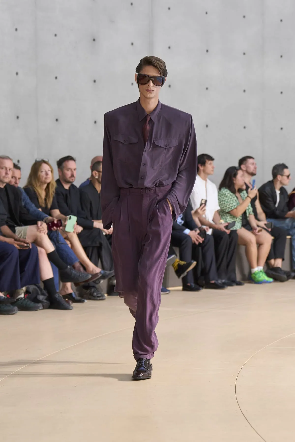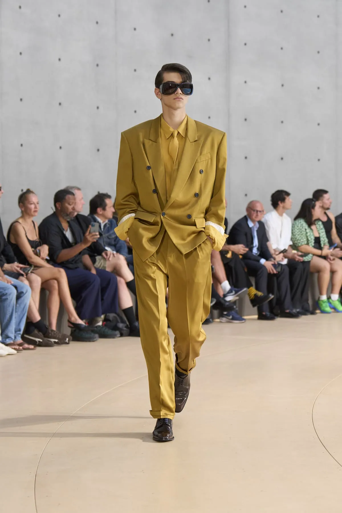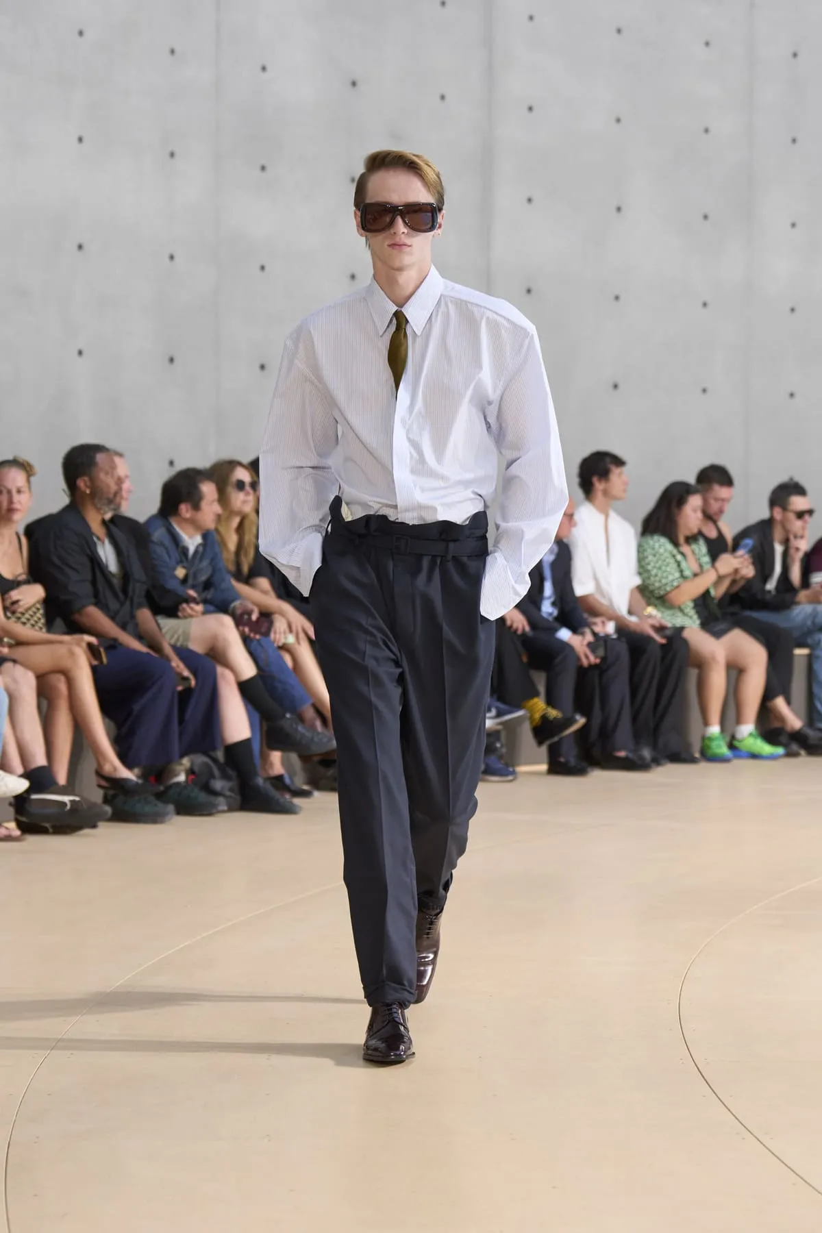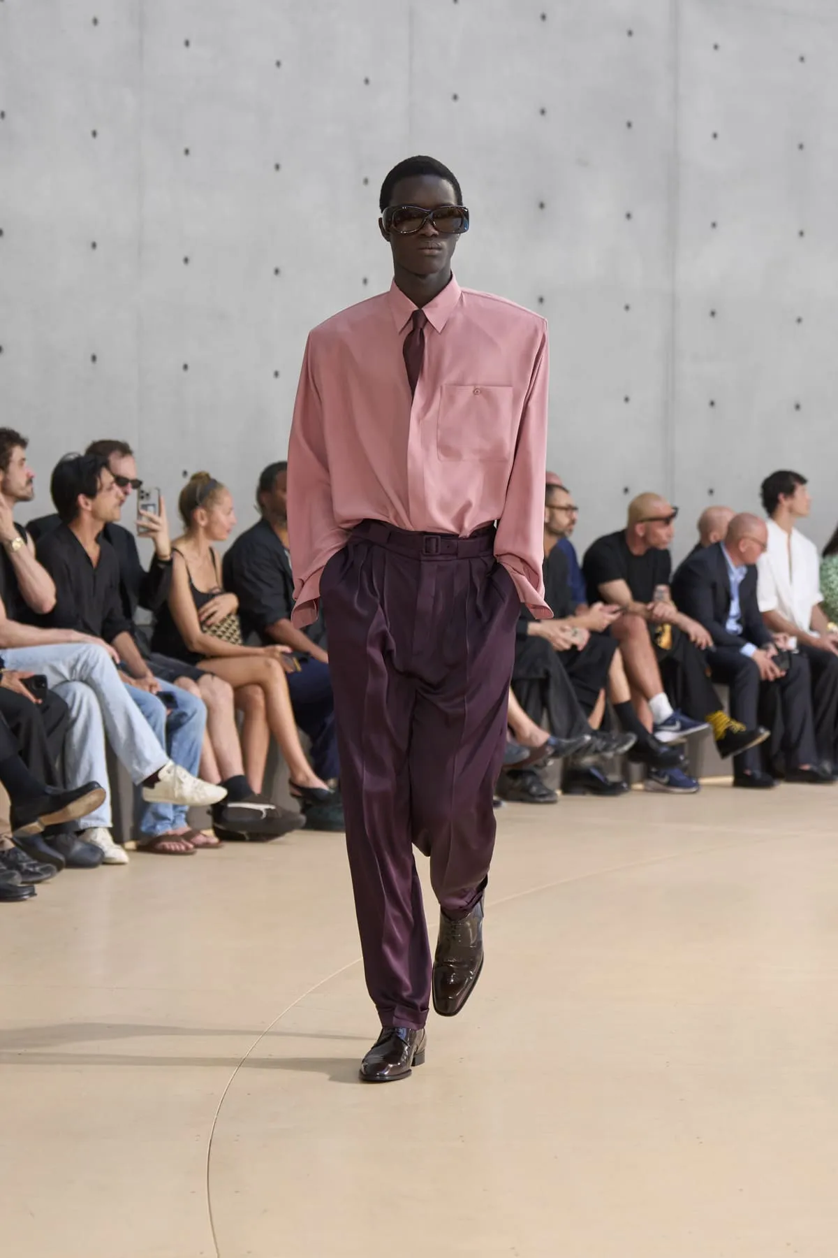 Pour le défilé Saint Laurent homme été 2026, Anthony Vaccarello évoque un moment suspendu, quelque part entre Paris et Fire Island, où l’évasion devient élégance et le désir langage. Cette ligne, dévoilée à la Bourse de Commerce, rend hommage à une génération disparue, aux artistes – Stanton, Angus, Ellis – qui ont donné un visage à des désirs silencieux. Et à Yves Saint Laurent, bien sûr, qui, en 1974, a trouvé refuge pour créer à nouveau. Inspirée par une époque où le désir était un style, où la beauté servait de bouclier contre le vide, la collection explore cette sensualité subtile, cet instant fragile où l’on s’habille autant pour se révéler que pour dissimuler. L’ambiguïté devient élégance. Elle se déploie autour de "clinamen", une installation de Céleste Boursier-Mougenot : un bassin circulaire où des bols en porcelaine dérivent et s'entrechoquent, dessinant des lignes invisibles sur l'eau, produisant une résonance sans chorégraphie. Les formes flottent plutôt qu'elles ne s'accrochent. Tailles cintrées. Épaules allongées. Des matières comme la soie et le nylon épousent le corps avec aisance. La palette est feutrée : sable, sel, ocre pâle, mousse sèche, bleu piscine. En 2026, l’heure est à la continuité.