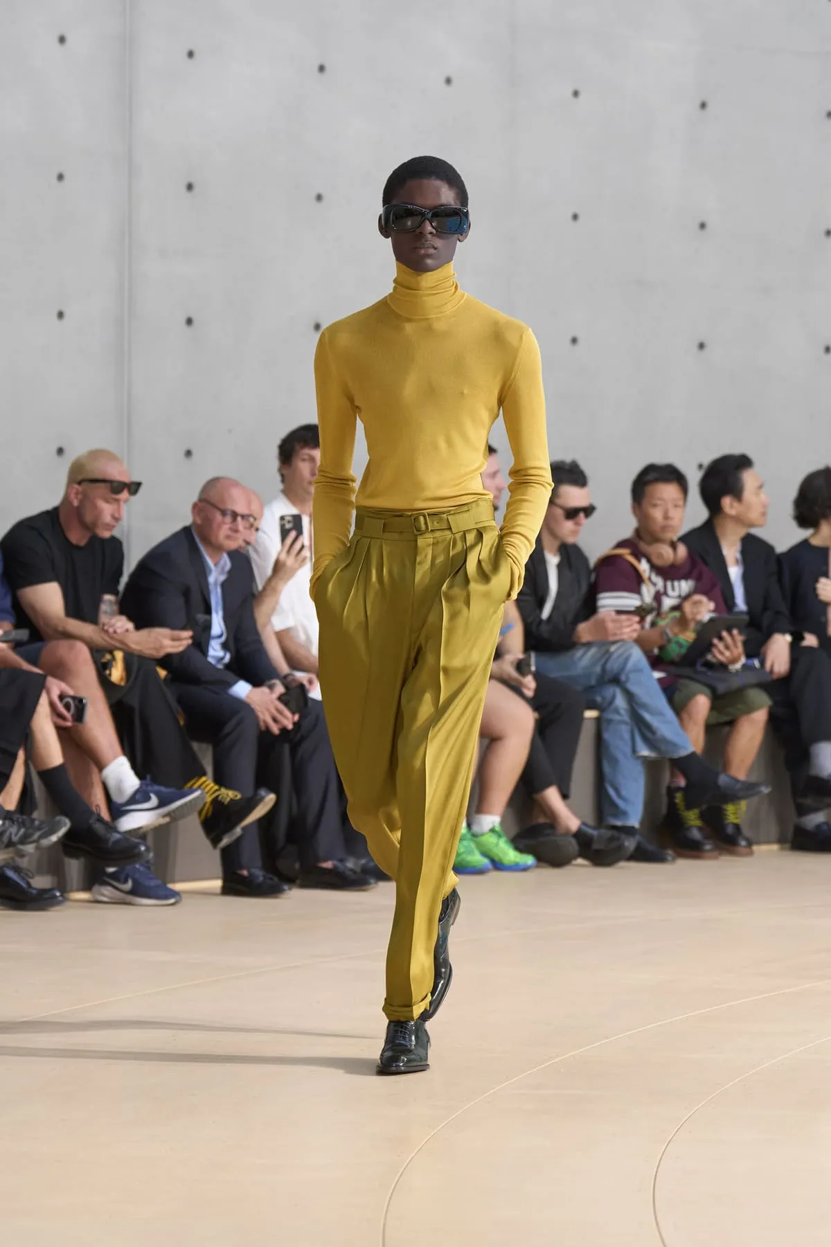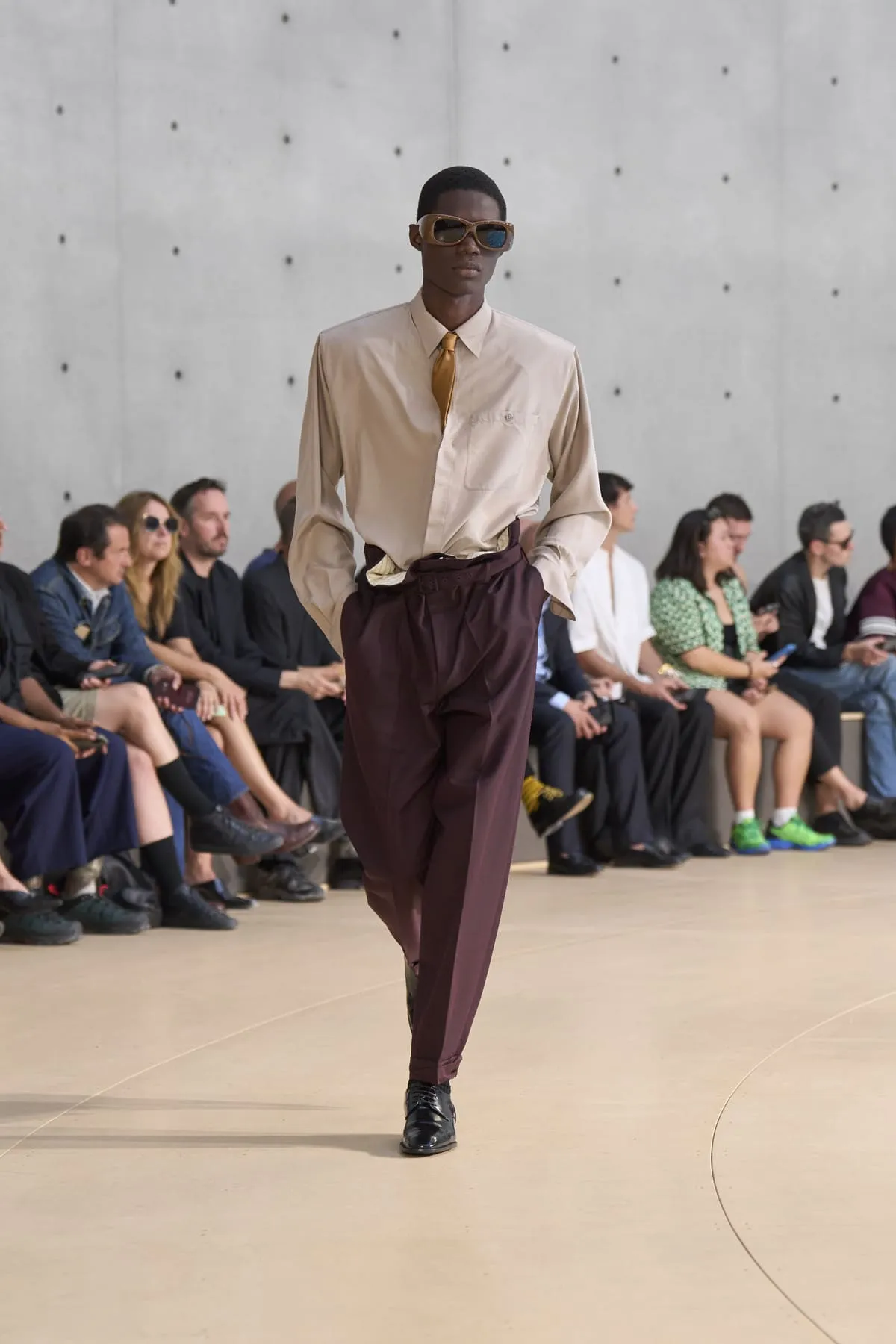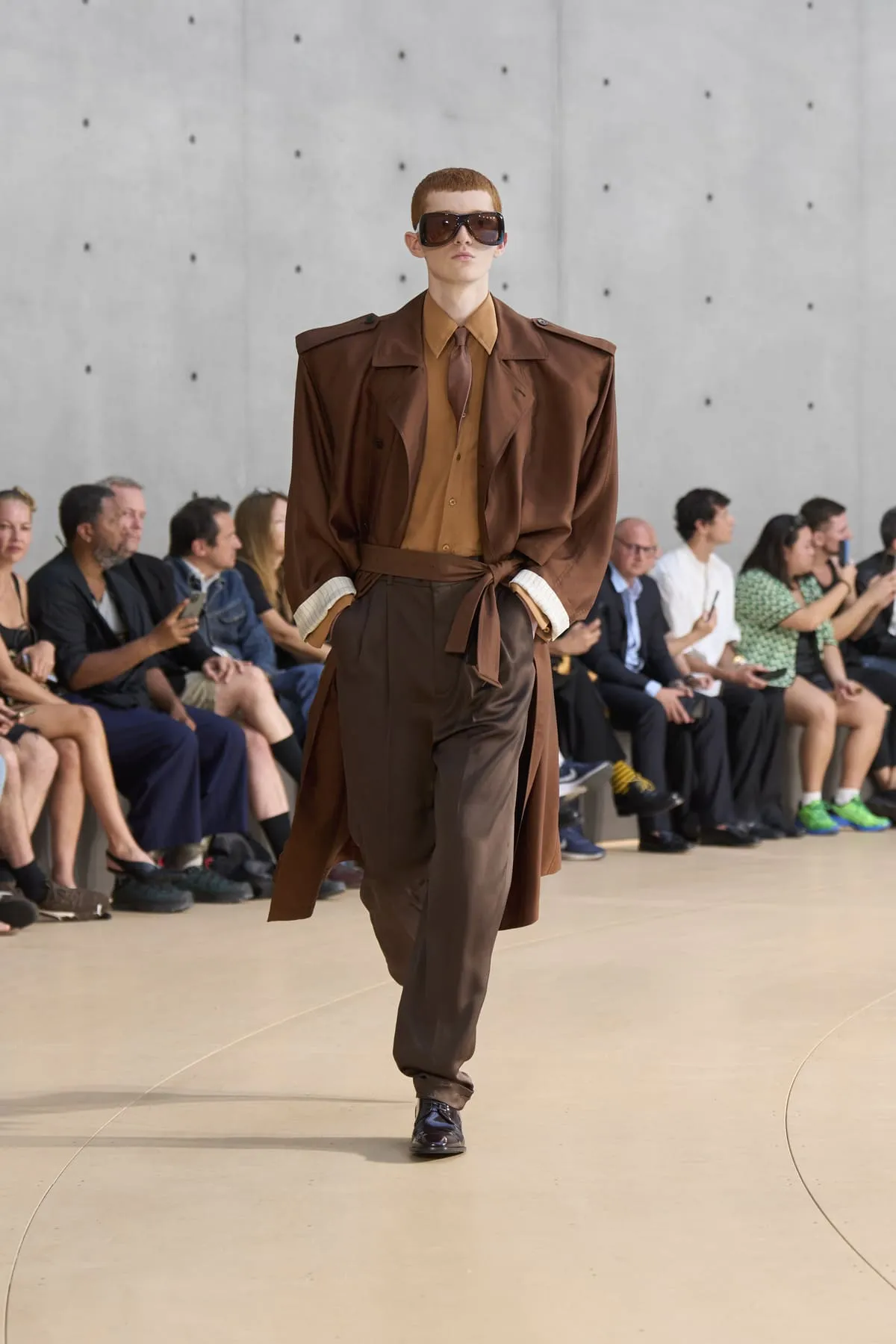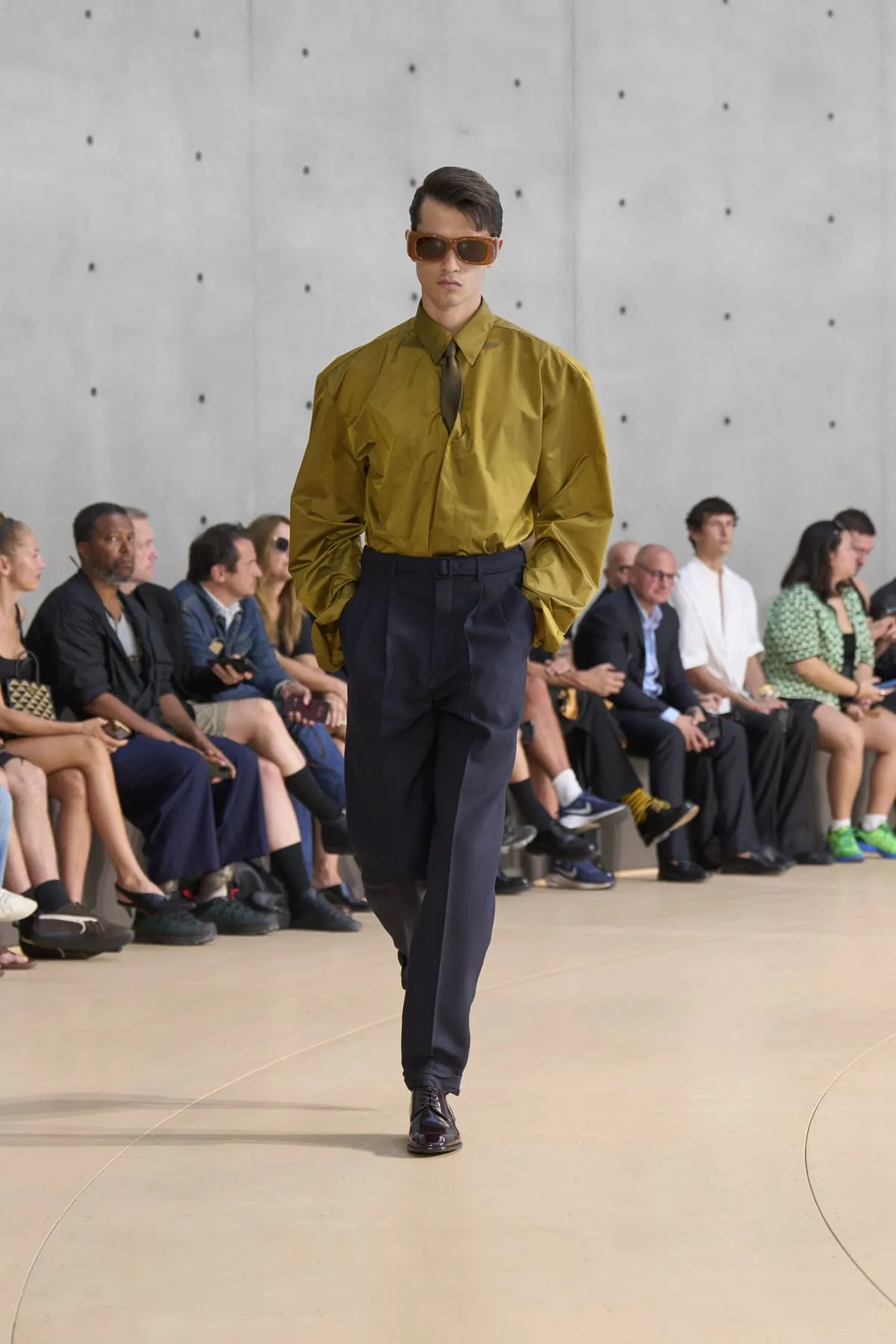 Pour le défilé Saint Laurent homme été 2026, Anthony Vaccarello évoque un moment suspendu, quelque part entre Paris et Fire Island, où l’évasion devient élégance et le désir langage. Cette ligne, dévoilée à la Bourse de Commerce, rend hommage à une génération disparue, aux artistes – Stanton, Angus, Ellis – qui ont donné un visage à des désirs silencieux. Et à Yves Saint Laurent, bien sûr, qui, en 1974, a trouvé refuge pour créer à nouveau. Inspirée par une époque où le désir était un style, où la beauté servait de bouclier contre le vide, la collection explore cette sensualité subtile, cet instant fragile où l’on s’habille autant pour se révéler que pour dissimuler. L’ambiguïté devient élégance. Elle se déploie autour de "clinamen", une installation de Céleste Boursier-Mougenot : un bassin circulaire où des bols en porcelaine dérivent et s'entrechoquent, dessinant des lignes invisibles sur l'eau, produisant une résonance sans chorégraphie. Les formes flottent plutôt qu'elles ne s'accrochent. Tailles cintrées. Épaules allongées. Des matières comme la soie et le nylon épousent le corps avec aisance. La palette est feutrée : sable, sel, ocre pâle, mousse sèche, bleu piscine. En 2026, l’heure est à la continuité.