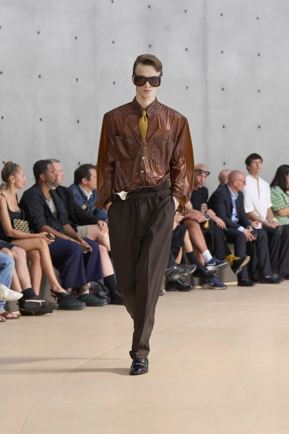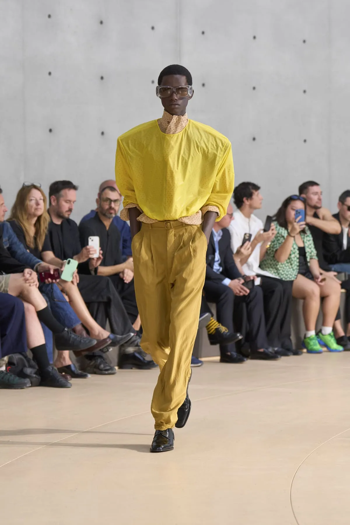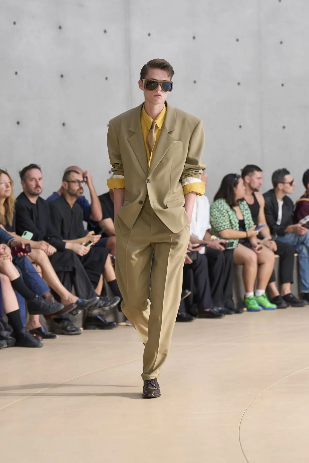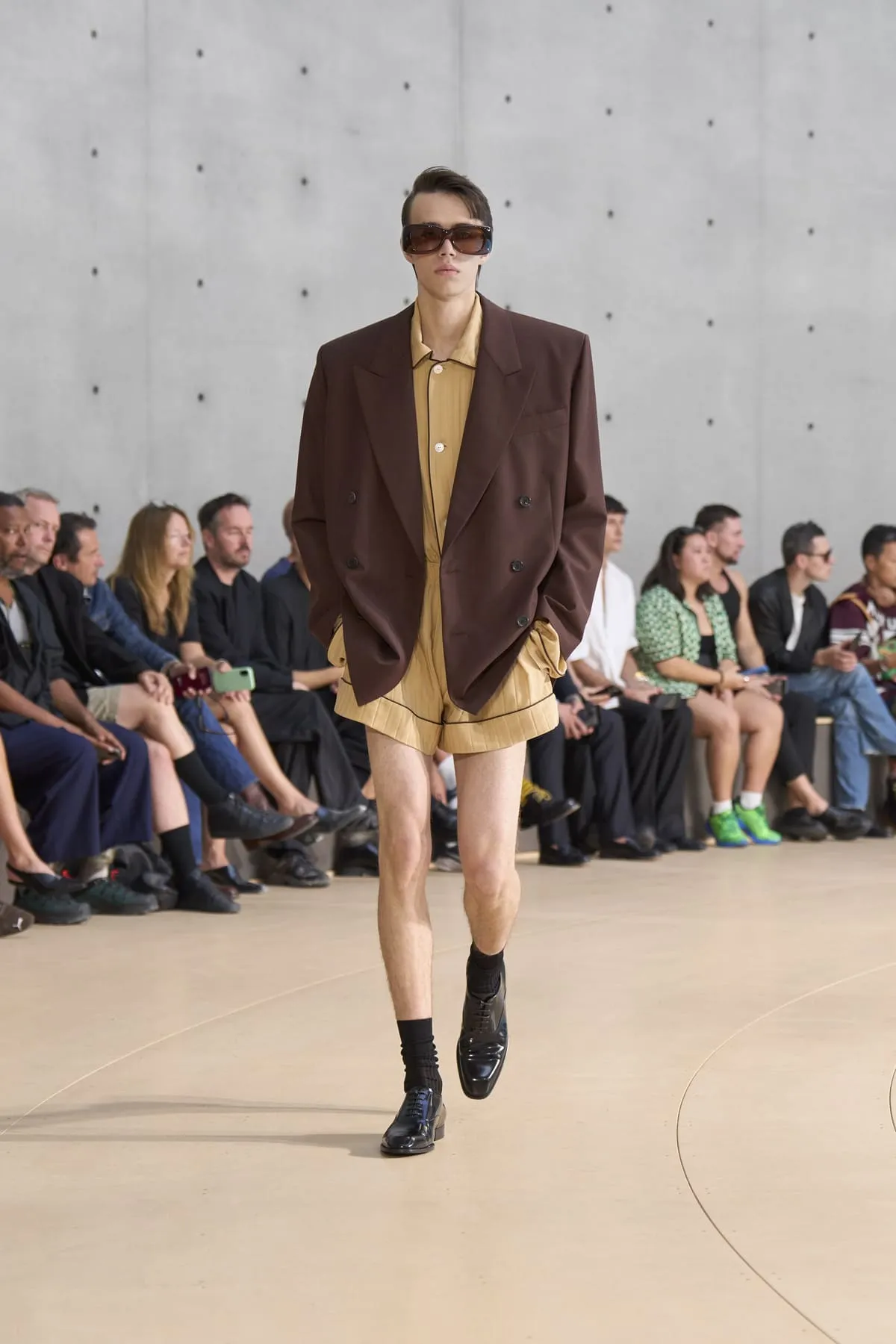 Pour le défilé Saint Laurent homme été 2026, Anthony Vaccarello évoque un moment suspendu, quelque part entre Paris et Fire Island, où l’évasion devient élégance et le désir langage. Cette ligne, dévoilée à la Bourse de Commerce, rend hommage à une génération disparue, aux artistes – Stanton, Angus, Ellis – qui ont donné un visage à des désirs silencieux. Et à Yves Saint Laurent, bien sûr, qui, en 1974, a trouvé refuge pour créer à nouveau. Inspirée par une époque où le désir était un style, où la beauté servait de bouclier contre le vide, la collection explore cette sensualité subtile, cet instant fragile où l’on s’habille autant pour se révéler que pour dissimuler. L’ambiguïté devient élégance. Elle se déploie autour de "clinamen", une installation de Céleste Boursier-Mougenot : un bassin circulaire où des bols en porcelaine dérivent et s'entrechoquent, dessinant des lignes invisibles sur l'eau, produisant une résonance sans chorégraphie. Les formes flottent plutôt qu'elles ne s'accrochent. Tailles cintrées. Épaules allongées. Des matières comme la soie et le nylon épousent le corps avec aisance. La palette est feutrée : sable, sel, ocre pâle, mousse sèche, bleu piscine. En 2026, l’heure est à la continuité.