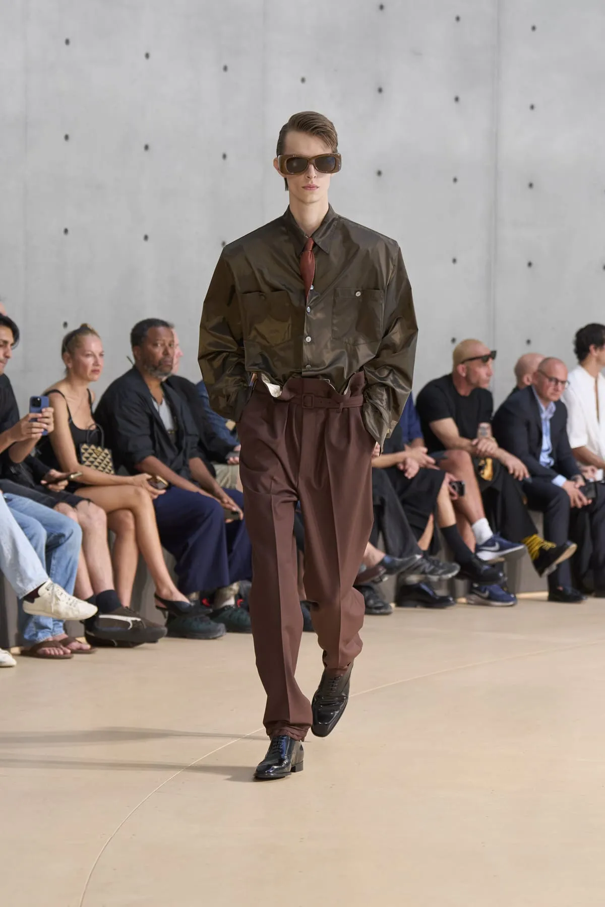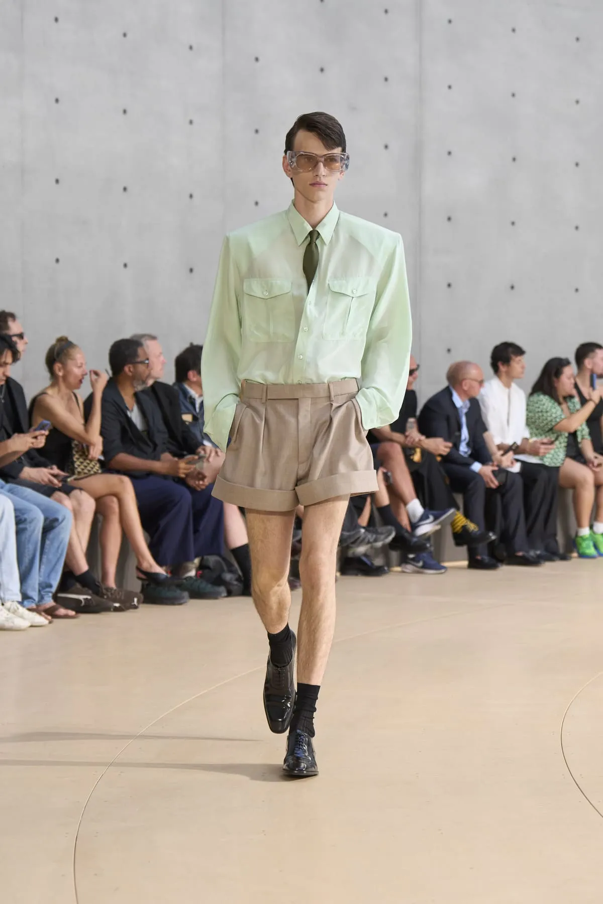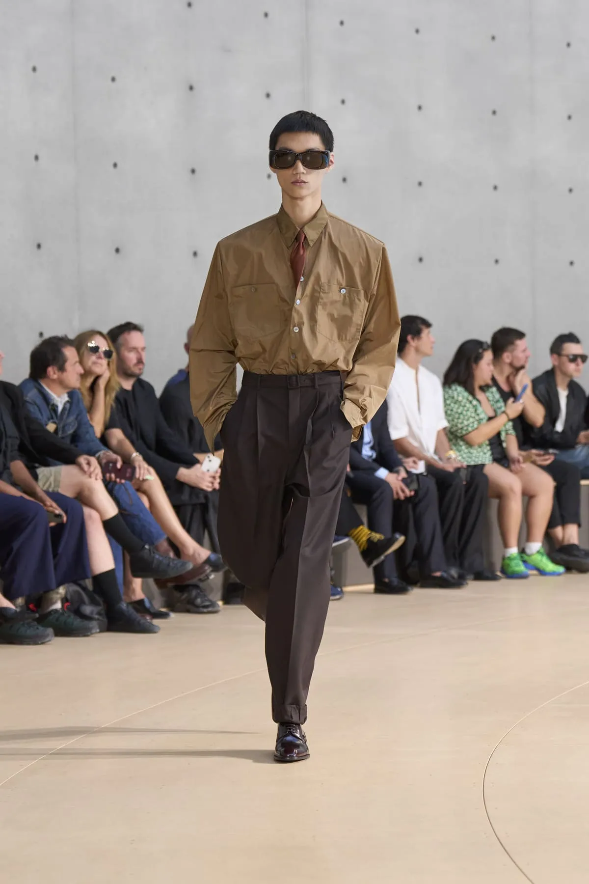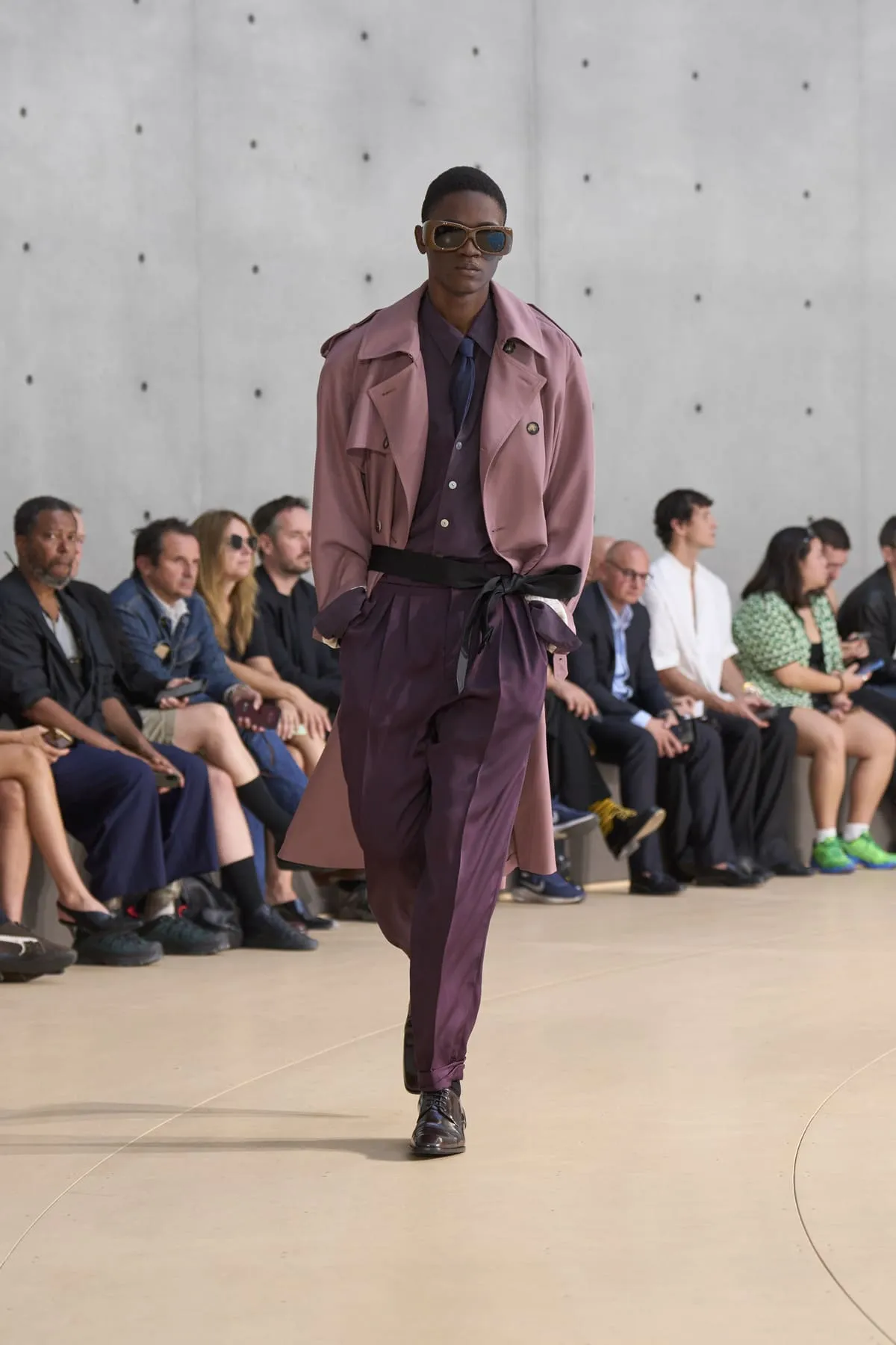 Pour le défilé Saint Laurent homme été 2026, Anthony Vaccarello évoque un moment suspendu, quelque part entre Paris et Fire Island, où l’évasion devient élégance et le désir langage. Cette ligne, dévoilée à la Bourse de Commerce, rend hommage à une génération disparue, aux artistes – Stanton, Angus, Ellis – qui ont donné un visage à des désirs silencieux. Et à Yves Saint Laurent, bien sûr, qui, en 1974, a trouvé refuge pour créer à nouveau. Inspirée par une époque où le désir était un style, où la beauté servait de bouclier contre le vide, la collection explore cette sensualité subtile, cet instant fragile où l’on s’habille autant pour se révéler que pour dissimuler. L’ambiguïté devient élégance. Elle se déploie autour de "clinamen", une installation de Céleste Boursier-Mougenot : un bassin circulaire où des bols en porcelaine dérivent et s'entrechoquent, dessinant des lignes invisibles sur l'eau, produisant une résonance sans chorégraphie. Les formes flottent plutôt qu'elles ne s'accrochent. Tailles cintrées. Épaules allongées. Des matières comme la soie et le nylon épousent le corps avec aisance. La palette est feutrée : sable, sel, ocre pâle, mousse sèche, bleu piscine. En 2026, l’heure est à la continuité.