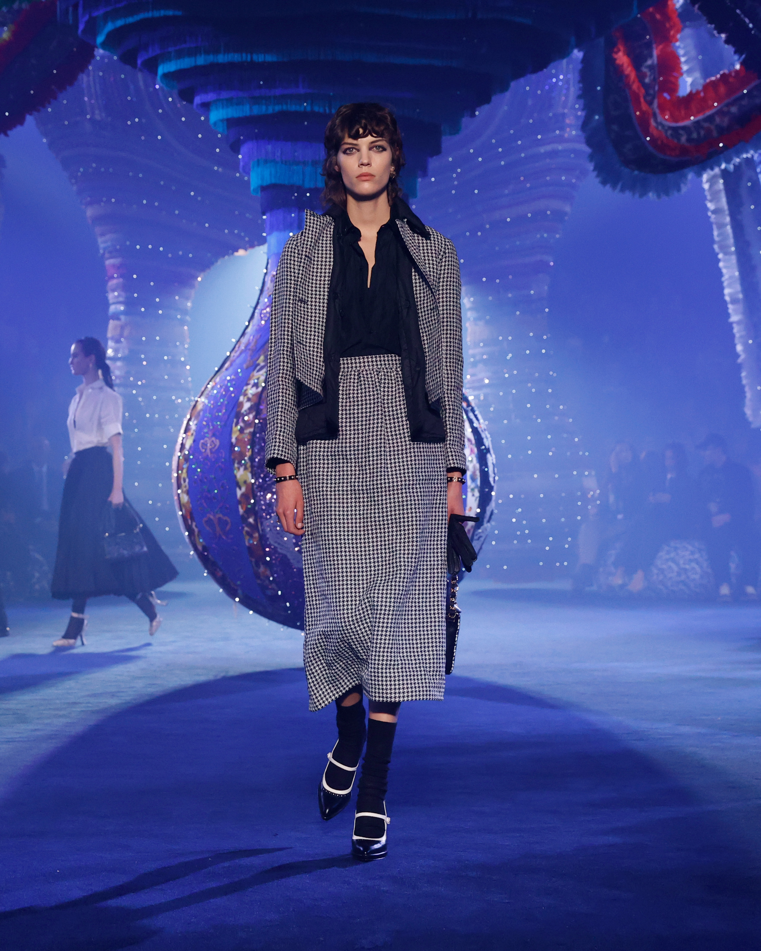 Si chaque collection est pour Maria Grazia Chiuri l’occasion de réfléchir au rôle et à l’essence du vêtement dans sa relation au(x) corps et à la mode, celle-ci flirte majestueusement avec la magie de l’instant. Dans une scénographie Valkyrie Miss Dior imaginée par l’artiste Joana Vasconcelos, sous les notes musicales de Michel Gaubert et les lumières de Philippe Cerceau, les silhouettes traduisent toute la poésie moderne véhiculée par la maison Dior. La relecture des années 1950 – au cœur de cette ligne automne-hiver 2023-2024 – est également un moyen pour la directrice artistique d’explorer, de manière toujours différente, l’histoire de la maison et d’approfondir le style français autour de trois personnalités extraordinaires : Catherine Dior, Édith Piaf et Juliette Gréco. Les motifs floraux choisis par Monsieur Dior ont été réinterprétés : la texture du chiné est entrelacée d’un fil métallique qui rend le tissu comme vivant, modelable, et gomme les contours, obtenant un effet abstrait. Les couleurs primaires occupent le devant de la scène : rubis, émeraude, jaune topaze, bleu. Les étoffes écossaises aux nuances délicates investissent les manteaux ainsi que les vestes et les jupes droites. Les broderies composent de petits jaillissements de lumière. Célébrant l’image kaléidoscopique d’une féminité dessinée par des icônes puissantes, habitées de conscience, ces créations suggèrent des parcours émotionnels aux nouvelles générations de femmes qui ébauchent notre avenir.