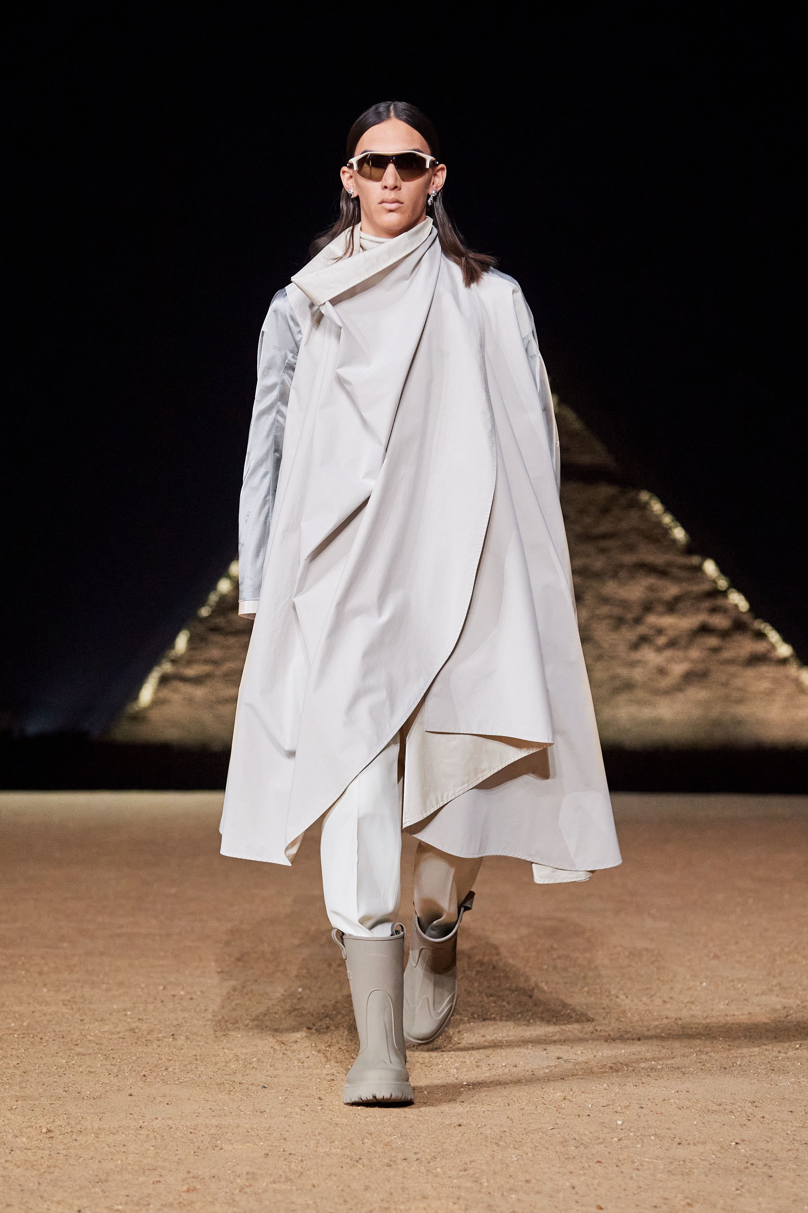 Gizeh. Un soir d’automne. Vue sur le coucher de soleil, derrière la grande pyramide. Une scénographie spectaculaire dans laquelle des silhouettes en mouvement apparaissent au milieu du désert égyptien. Autour des notes d’un ardent crépuscule, le directeur artistique des lignes masculines de la maison Dior, Kim Jones, met en abyme la coupe pour la collection Dior homme automne 2023. Le féminin se métamorphose en masculin avec le Tailoring relevé par une gradation de gris. Les finitions couture sont valorisées sur les vêtements extérieurs, les broderies d’archives se transforment en arsenal futuriste, tandis que la maroquinerie réinvente le luxe d’un nouvel utilitaire organique. La fluidité et l’aisance s’associent à travers des transparences en jacquard sur des demi-kilts en laine inspirés de la jupe plissée en biais d’une robe des années 1950 nommée Bonne Fortune.