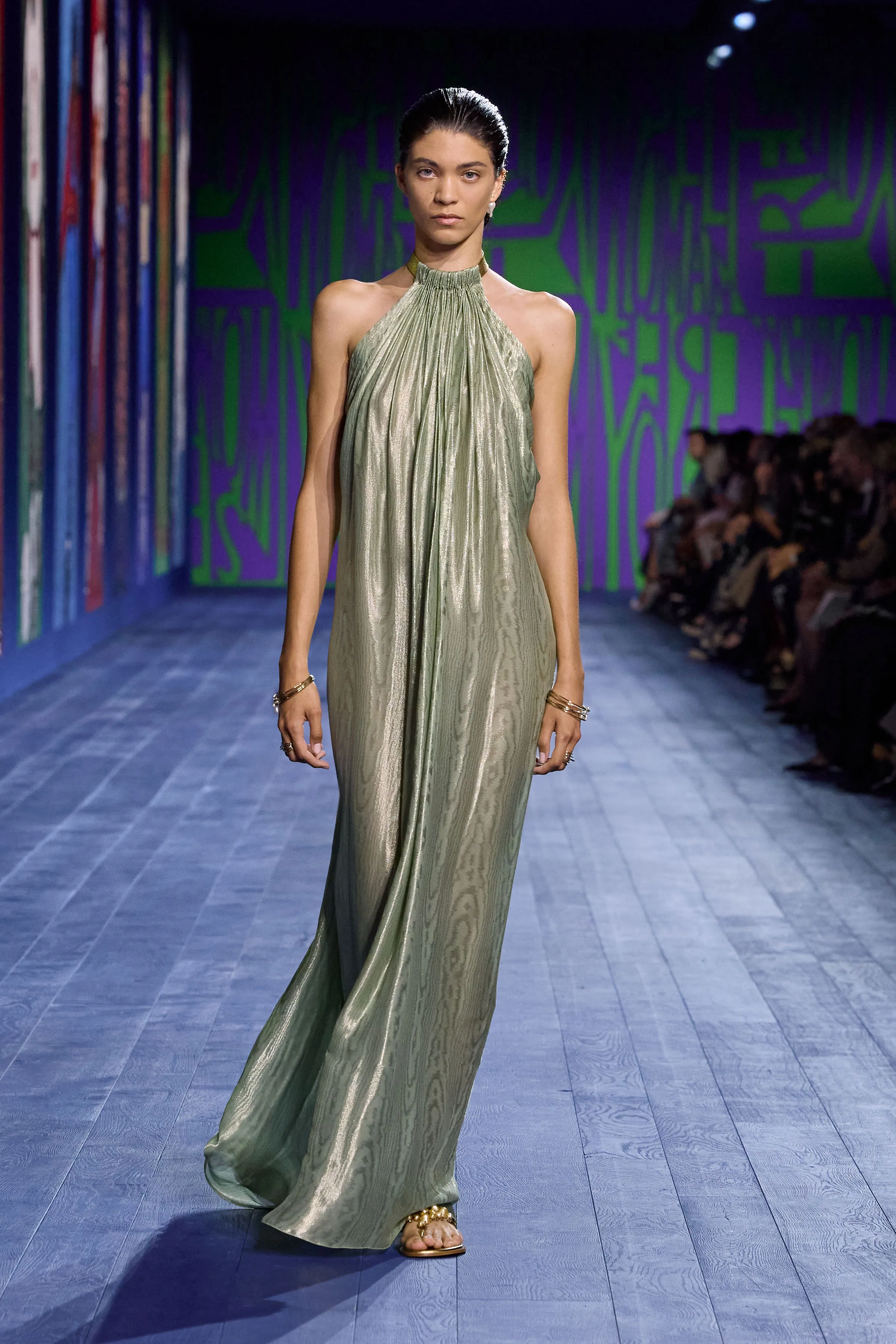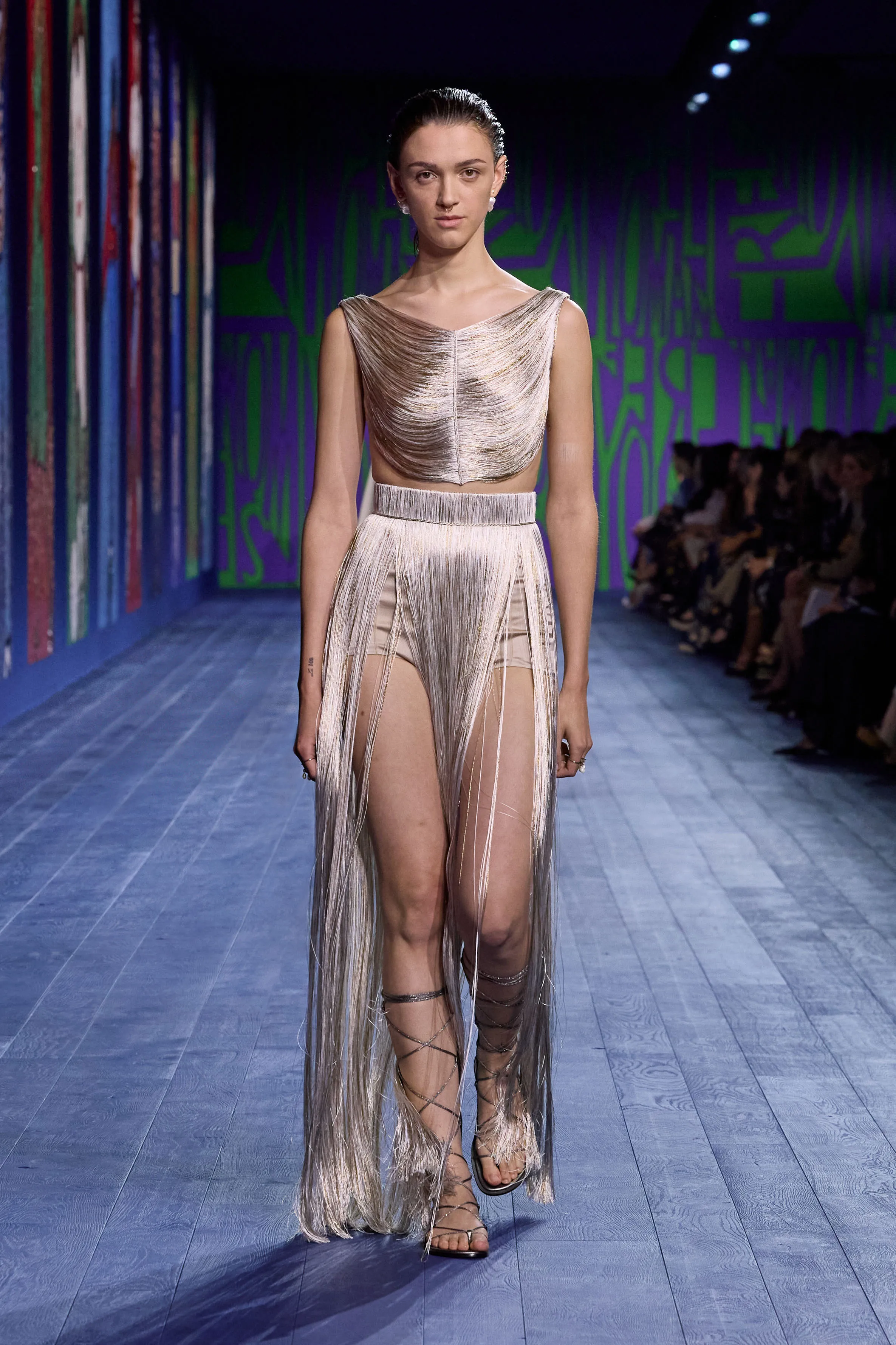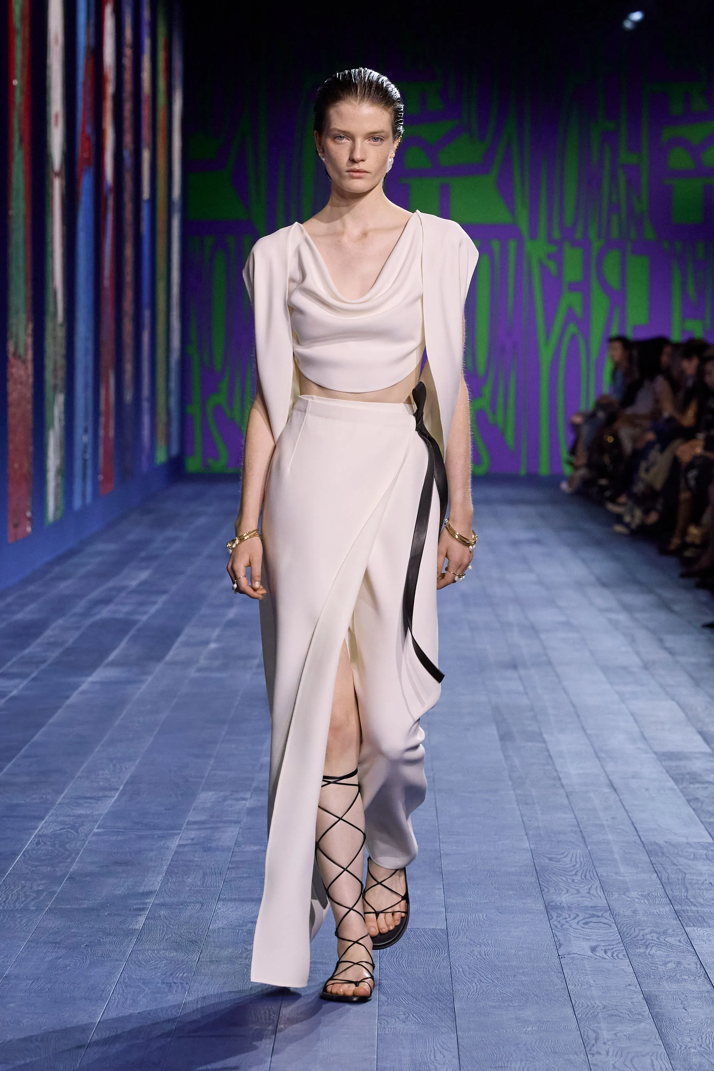 L’arrivée, à Paris, des Jeux olympiques – incarnation sacrée de la compétition – a incité Maria Grazia Chiuri à rendre idéalement hommage à toutes les athlètes qui, de l’Antiquité à aujourd’hui, ont surmonté les préjugés et les obstacles pour gagner un champ d’égalité dans les compétitions sportives. Explorant les liens entre la performance et le vêtement, la directrice artistique interroge l’essence même de ce dernier, sa construction et son rapport singulier au corps en mouvement. Merveilleuse référence visuelle à la statuaire classique, le drapé investit notamment le défilé au gré de robes de soie magnifiées de broderies, de débardeurs métalliques transparents bordés de satin, ou encore d’ensembles où la jupe révèle, à chaque pas, un pantalon. Les silhouettes reflètent le pouvoir – tant expérimental que réflexif – de la couture, sa virtuosité à repenser l’allure, l’élégance d’une femme à la fois délicate et puissante.