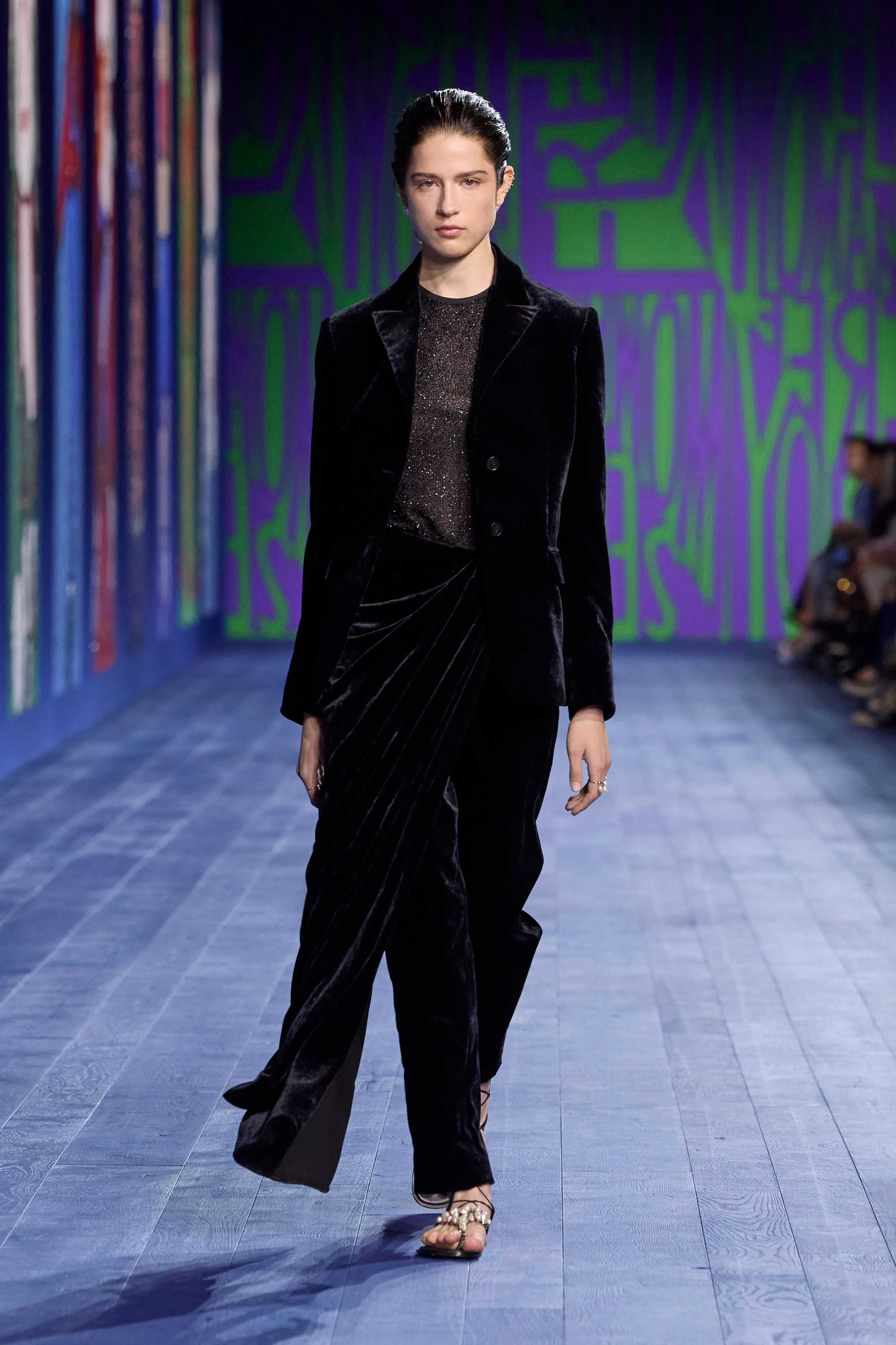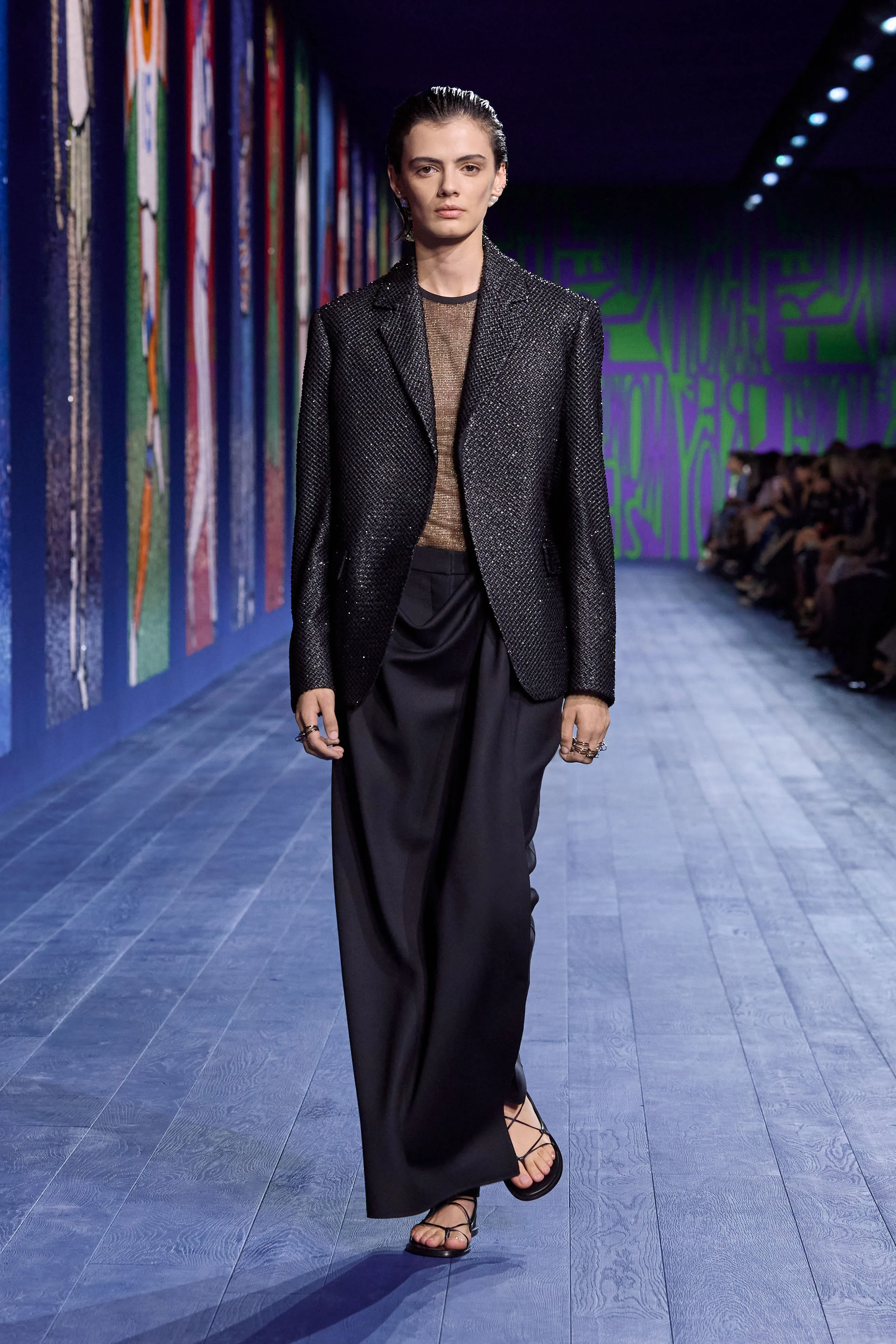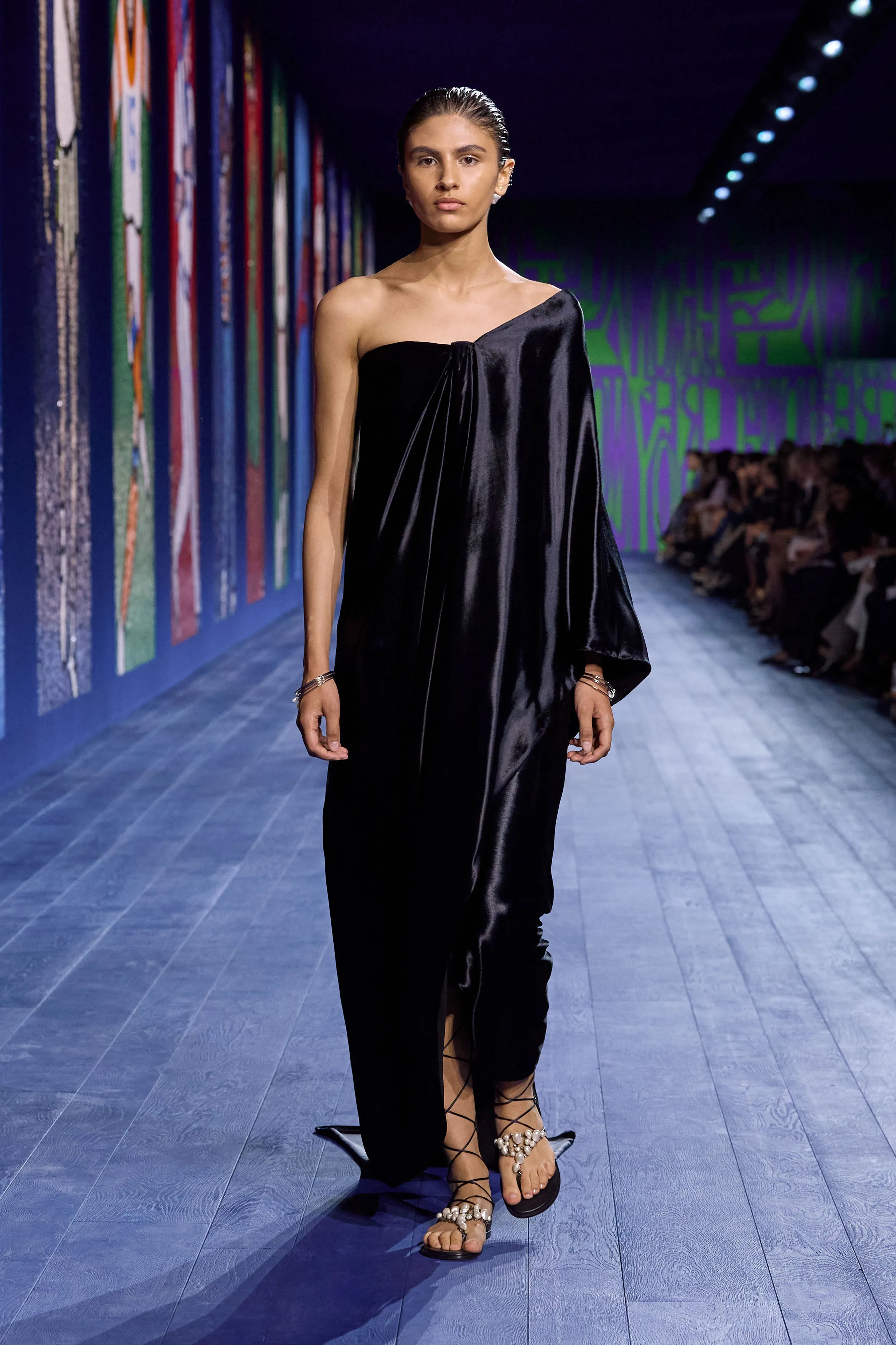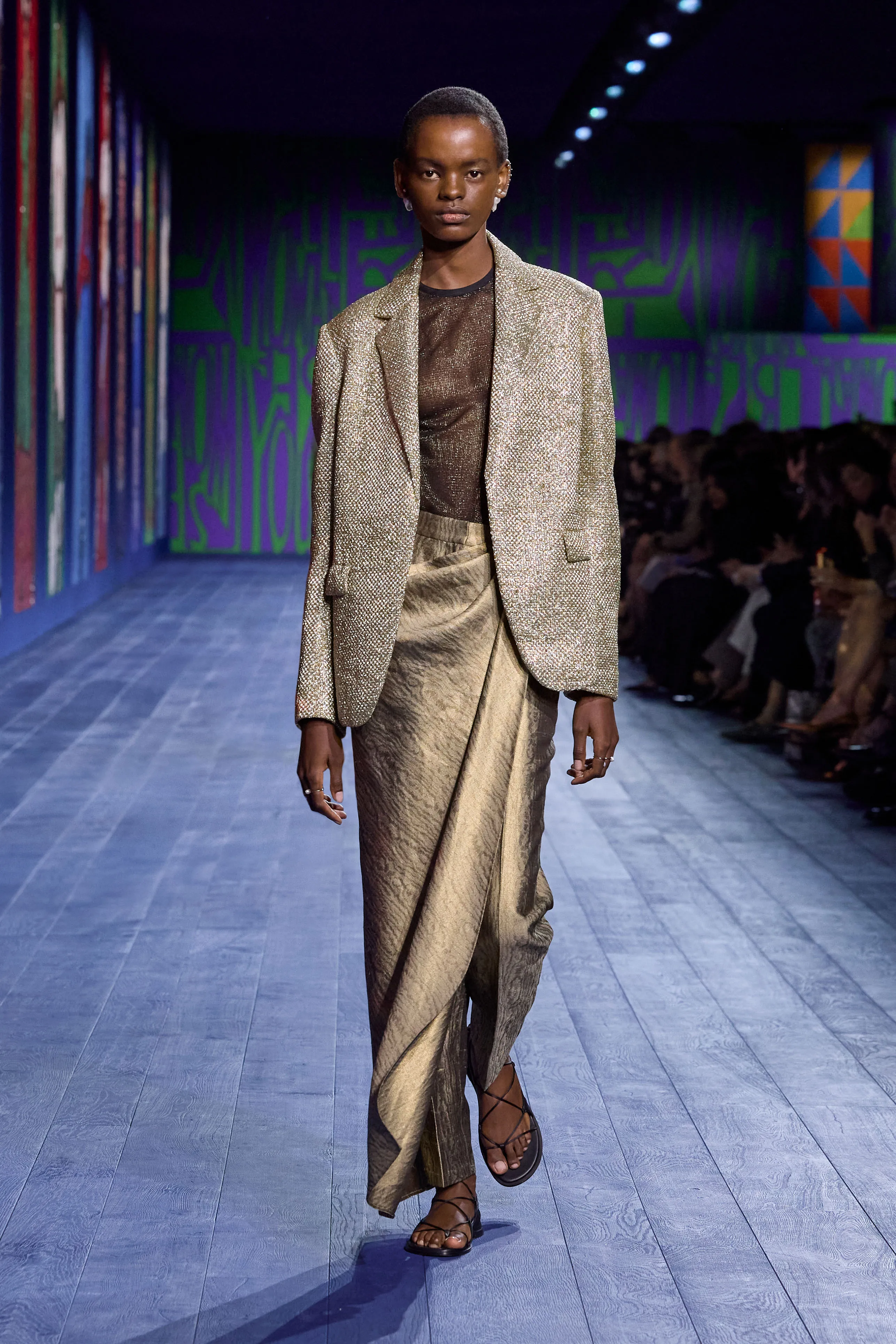 L’arrivée, à Paris, des Jeux olympiques – incarnation sacrée de la compétition – a incité Maria Grazia Chiuri à rendre idéalement hommage à toutes les athlètes qui, de l’Antiquité à aujourd’hui, ont surmonté les préjugés et les obstacles pour gagner un champ d’égalité dans les compétitions sportives. Explorant les liens entre la performance et le vêtement, la directrice artistique interroge l’essence même de ce dernier, sa construction et son rapport singulier au corps en mouvement. Merveilleuse référence visuelle à la statuaire classique, le drapé investit notamment le défilé au gré de robes de soie magnifiées de broderies, de débardeurs métalliques transparents bordés de satin, ou encore d’ensembles où la jupe révèle, à chaque pas, un pantalon. Les silhouettes reflètent le pouvoir – tant expérimental que réflexif – de la couture, sa virtuosité à repenser l’allure, l’élégance d’une femme à la fois délicate et puissante.