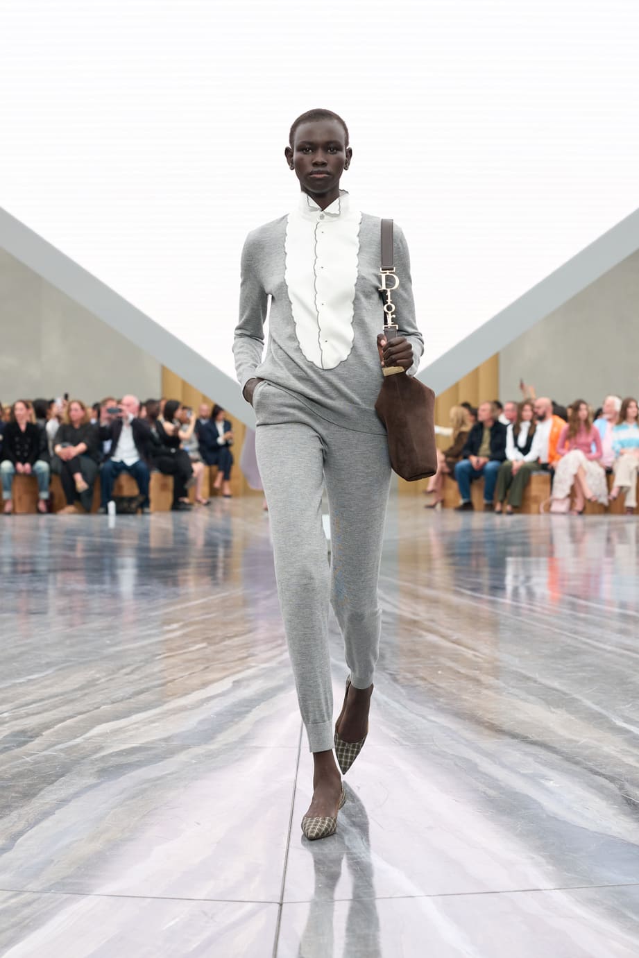 Dévoilée hier au Jardin des Tuileries à Paris, la collection Dior de Jonathan Anderson explore le langage de la Maison à travers une relecture empathique de son héritage. Le directeur artistique a nourri sa vision d’éléments d’Archives interprétés avec inventivité. Les nœuds - un code intemporel - ont été déclinés sous de multiples formes : des manteaux à pinces sur le devant et des minijupes drapées en coton drill aux robes en dentelle aérienne et aux sacs à main - à anse unique - Dior Cigale. Les vestes Bar rétrécies adoptent des volumes sculpturaux, tandis que les longues capes ondulantes et les shorts volumineux nouent un lien avec les débuts de Jonathan Anderson chez Dior, en juin dernier. Le résultat, d'une tension captivante, offre une multitude d'attitudes et d'expressions de soi. L'espace épuré du défilé, conçu par Luca Guadagnino et Stefano Baisi, a fusionné le numérique et le physique. Racontée à travers les images d'une œuvre spécialement commandée au documentariste Adam Curtis, l'histoire de la Maison défilait devant les yeux des invités sur une pyramide en LED inversée, avant de s'évanouir comme par magie dans une boîte à chaussures Dior. Elle symbolise un passé conservé qui peut être revisité comme des souvenirs.