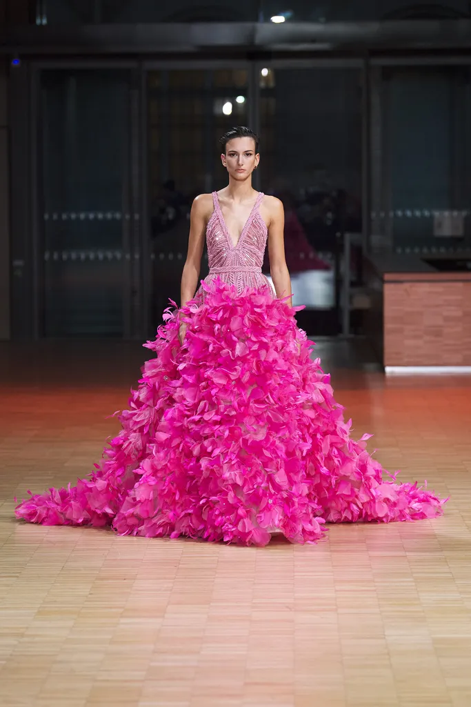 Telle une ode aux paysages méditerranéens, à sa beauté, son charme et son héritage, la collection Elie Saab haute couture printemps-été 2022 traduit la joie et le réconfort que procure cet environnement au créateur. Chaque robe s’inspire de différents lieux, de saveurs et de formes variées pour un voyage dans un paradis terrestre "Eden On Earth". Paillettes scintillantes et cristaux embellissent des décolletés plongeants et des courbes féminines sublimées par des textures en taffetas généreuses.