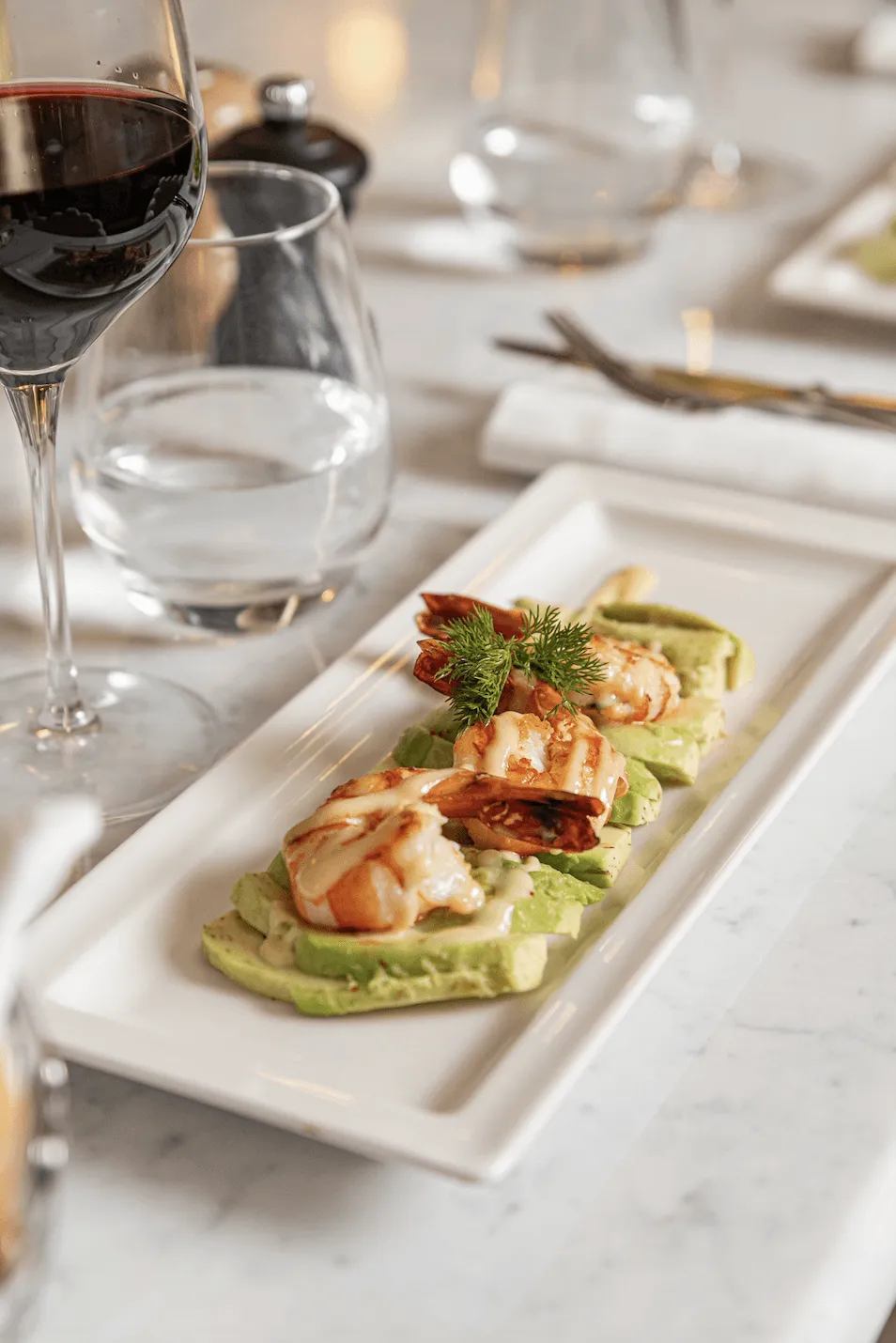 Ce qui marque dans le lieu chic qui a ouvert ses portes à l’hiver 2024, c’est avant tout cette scénographie bien pensée. Un sublime bar en marbre blanc, des moulures typiques, d’épais rideaux et banquettes en velours terracotta, un escalier majestueux ou encore des appliques Art Déco. S’ajoute le ballet élégant des garçons de café et maîtres d’hôtels qui déambulent entre les tables. Dans cette ambiance confidentielle, nous commençons le repas avec deux entrées : une poêlée de champignons surmontée d’un œuf mollet et un avocat et gambas black tiger servi dans un plat à la ligne rectangulaire. Des portions parfaites à partager pour démultiplier les saveurs en bouche.