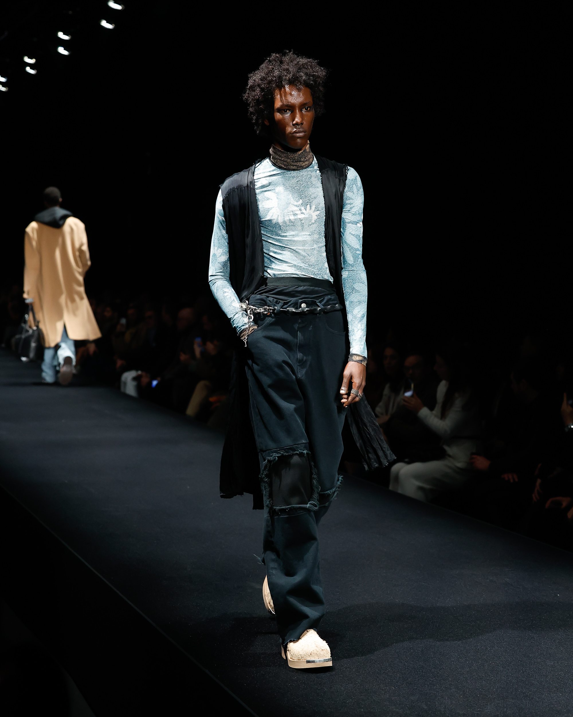 Déchiffrer où commence et où se termine un vêtement. Pour sa collection automne-hiver 2023, MM6 Maison Margiela présente des textures et des traitements de tissus inattendus. Une chemise avec un body en marine, des manches en cuir volumineuses ou un blazer en laine sur mesure, des choix de styles improbables sont obtenus grâce à des méthodes de construction trompeuses. Les chaussures et accessoires sont également réfractés à travers la galerie des glaces de cette saison. Cuissardes, bottes et plateformes créent une illusion de hauteur. Malgré tous les discours sur l’artifice esthétique, cette collection ne cherche pas à tromper le spectateur. Ces pièces s’assemblent en puzzle pour créer une œuvre à la vue de tous. A chacun de jouer de ces looks pour imaginer des énigmes qui ont du sens.