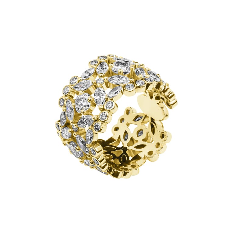 L'idée est poétique : traduire en bijoux les gestes délicats de la broderie. Les festons, ces petits points arrondis qui bordent le tissu, deviennent des lignes d'or serties de diamants. Les ajourés se métamorphosent en dentelles précieuses. Résultat : des pièces qui évoquent autant le savoir-faire textile que l'excellence joaillière. Pour César et Manon, le duo à l'origine de la marque, cette analogie va plus loin. Ils voient dans la broderie une métaphore des relations humaines : des liens qui se construisent point par point, avec patience et attention. Que ce soit l'amour entre partenaires, l'attachement familial ou l'amitié profonde.