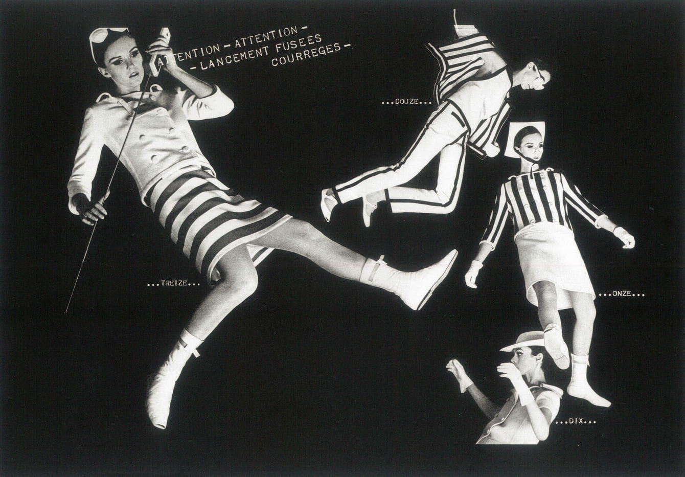 Quand André Courrèges présente sa collection printemps-été 1965, la presse parle aussitôt de "bombe". Et pour cause : le couturier basque dynamite les conventions de la haute couture. Minijupe, blanc immaculé, formes architecturales, il ne s'agit plus de draper le corps féminin, mais de le construire. Un style, dira-t-on, "qui n'est pas une simple vision esthétique mais qui correspond à une philosophie profonde définissant un style de vie". Peter Knapp était là pour immortaliser l'explosion. Dans le numéro 1002 d'Elle, en mars 1965, il présente cette nouvelle femme Courrèges à travers une série elliptique et joyeusement anti-gravitationnelle. Ces images constituent le cœur de l'exposition, déclinées en quatre grands tirages, complétées par des archives et des tenues généreusement prêtées par la maison Courrèges.