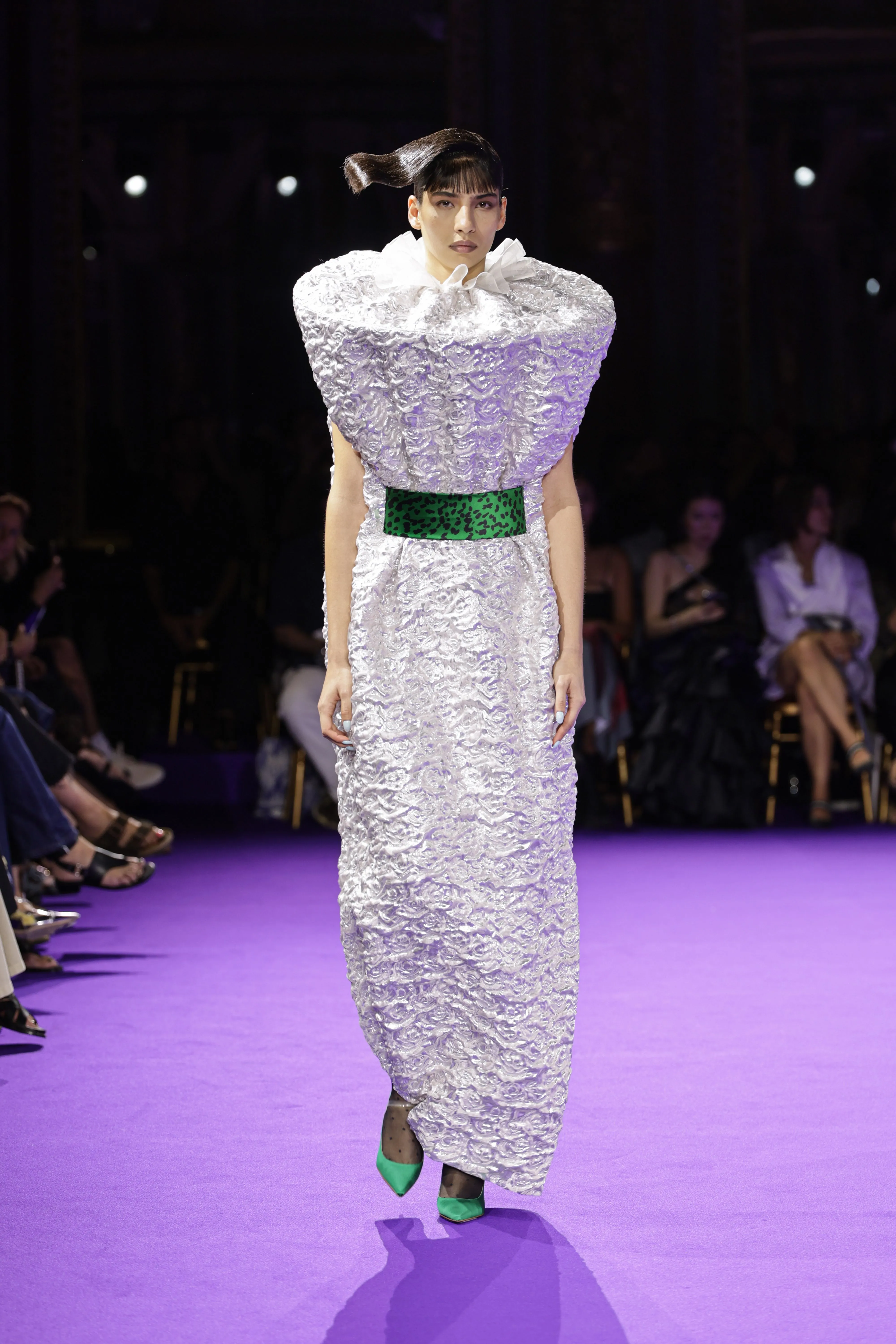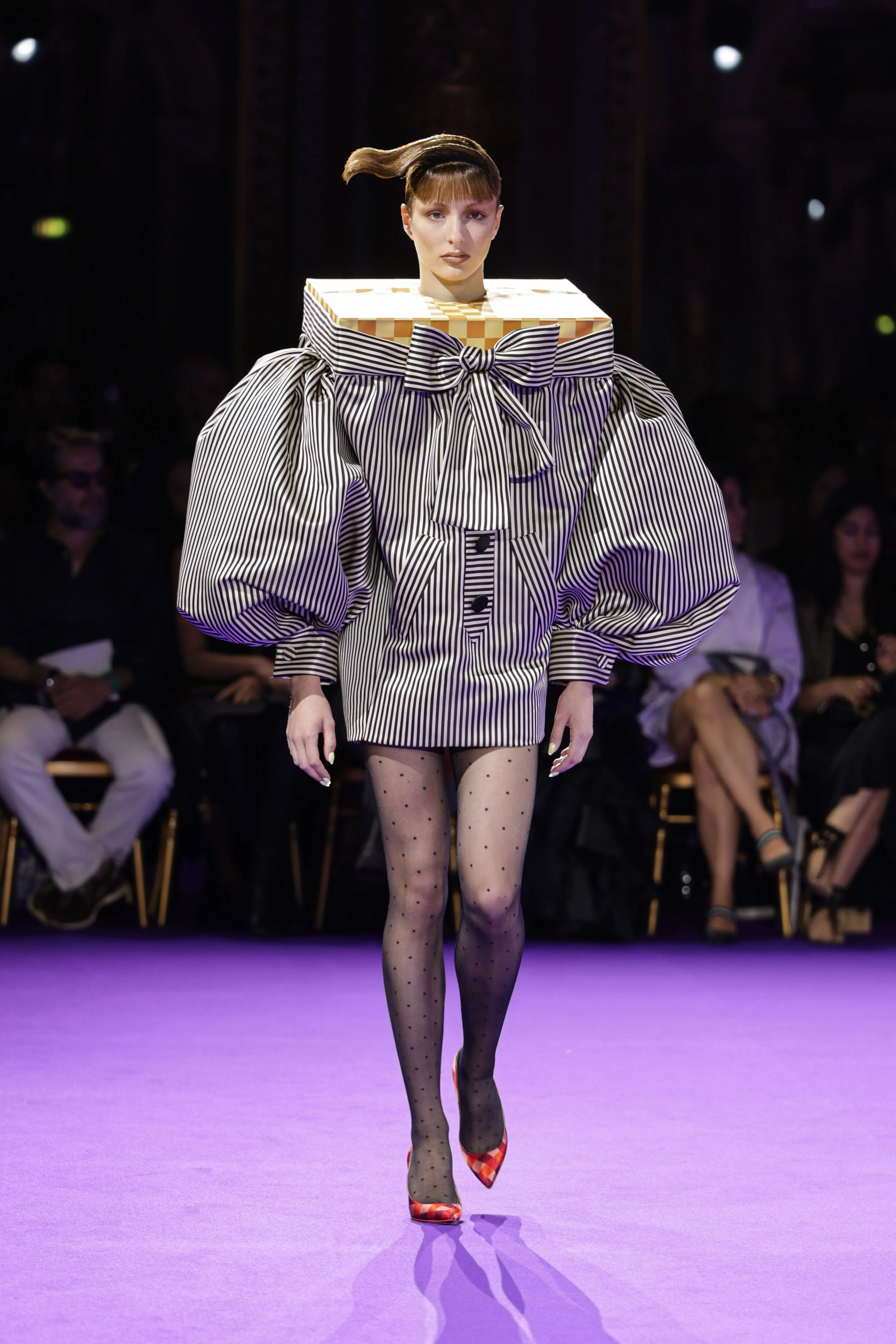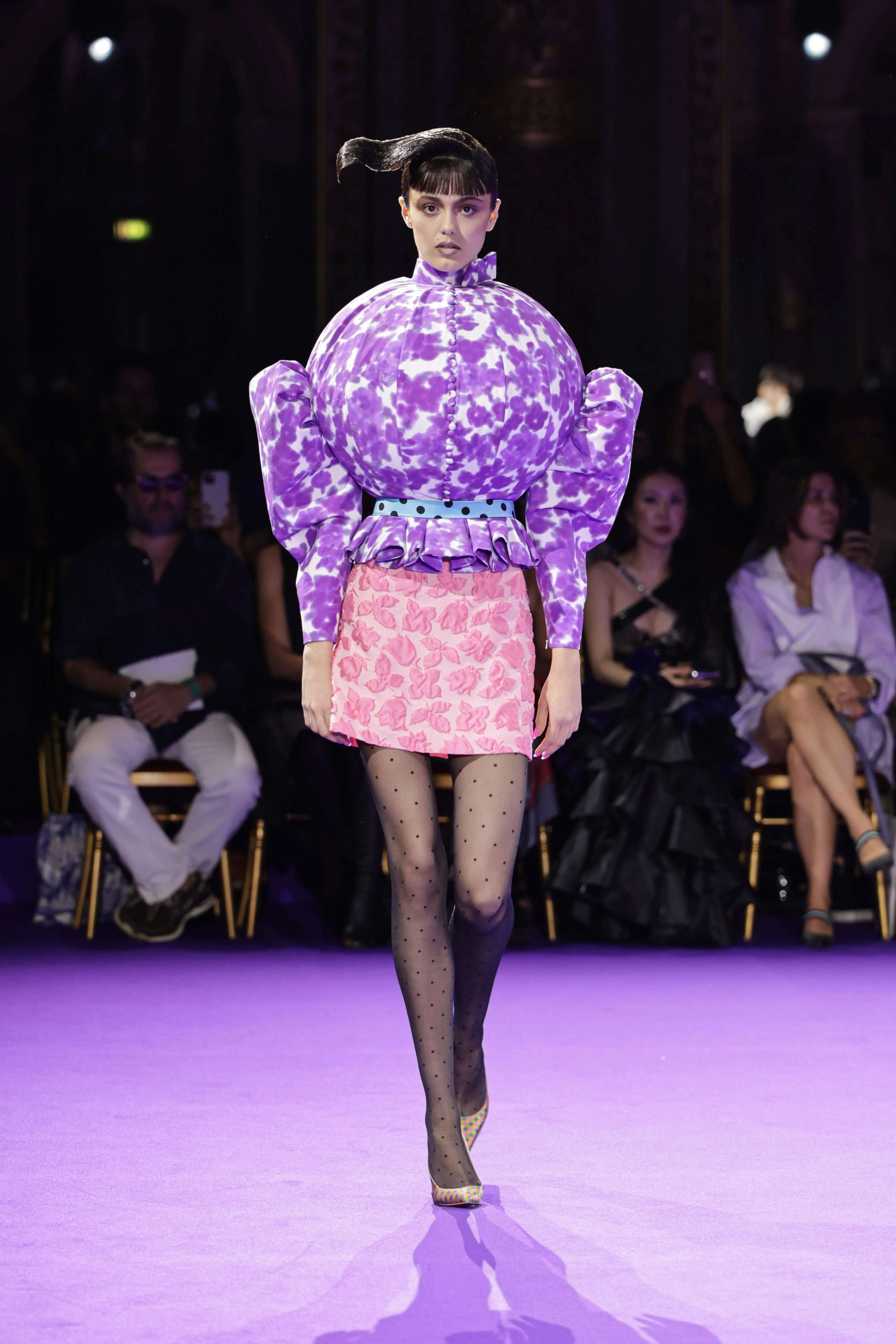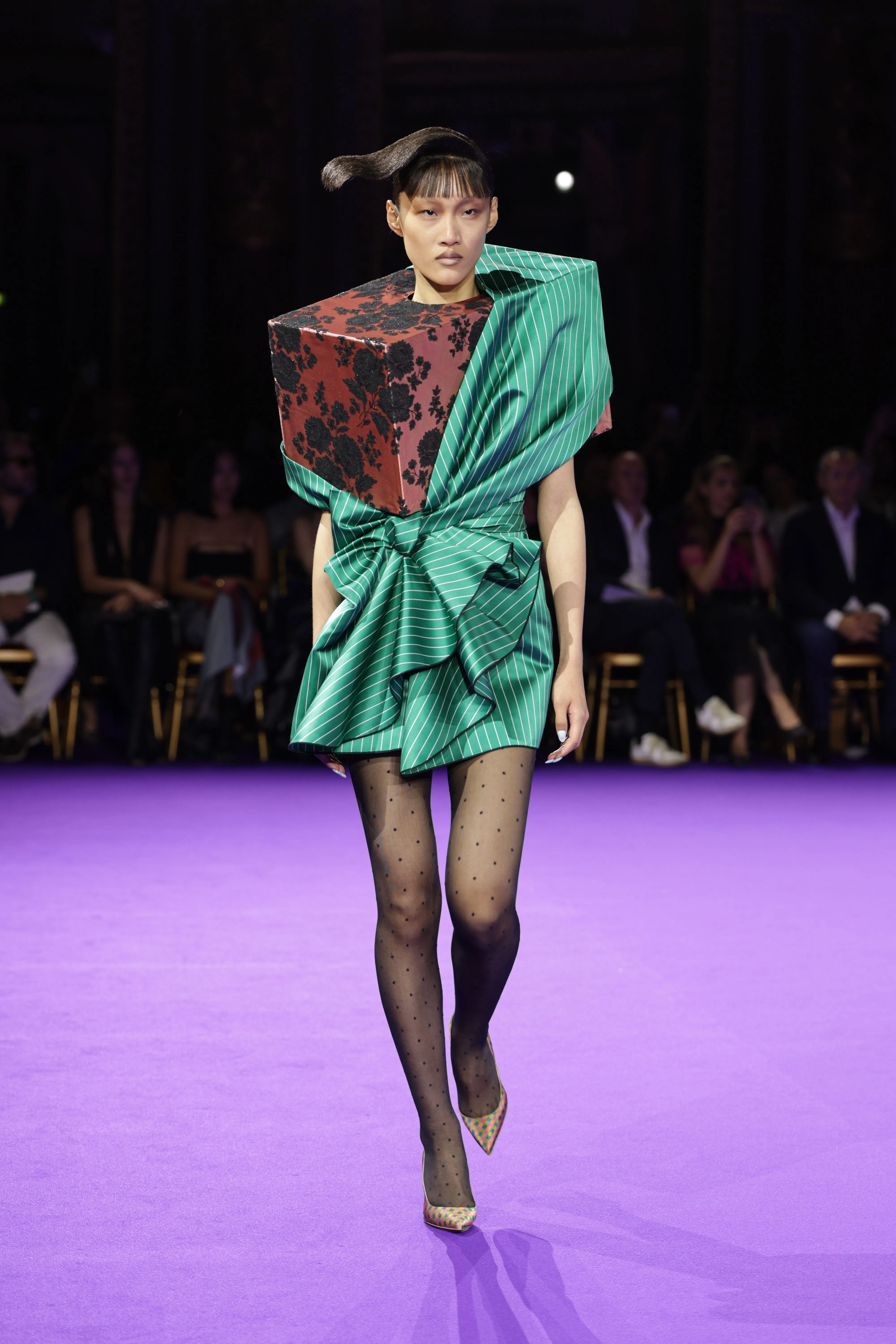 Dans une galerie de glaces d’époque aux tons feutrés, les deux créateurs Viktor & Rolf ont présenté leur collection automne-hiver 2024, baptisée “Haute Abstraction”. Pour cette ligne, la maison a choisi de flirter avec l’absurde. Des coupes angulaires, des formes presque tirées d’un cartoon ou d’un tableau de Picasso, ont foulé un sol violet. Cette saison a tiré son inspiration de la collection “Atomic Bomb” présentée en 1998. Au cours de ces 26 dernières années, les pièces sont devenues encore plus abstraites et le duo de créateurs néerlandais a complètement redéfini la silhouette couture en jouant avec la géométrie et la 3D : corsets sphériques, blazers aux épaulettes XXL, bustiers rectangulaires, jupes circulaires… Les associations de couleurs, de motifs et de textures ajoutent au côté non-conventionnel de cette collection qui n’hésite pas à allier rayures verticales, fleurs et nœuds surdimensionnés. Reflétant les tissus et les couleurs des vêtements, chaque look est complété par des talons Christian Louboutin en satin coloré. Les mannequins défilent avec des collants à pois de Falke, qui complètent les constructions absurdes de cette saison.