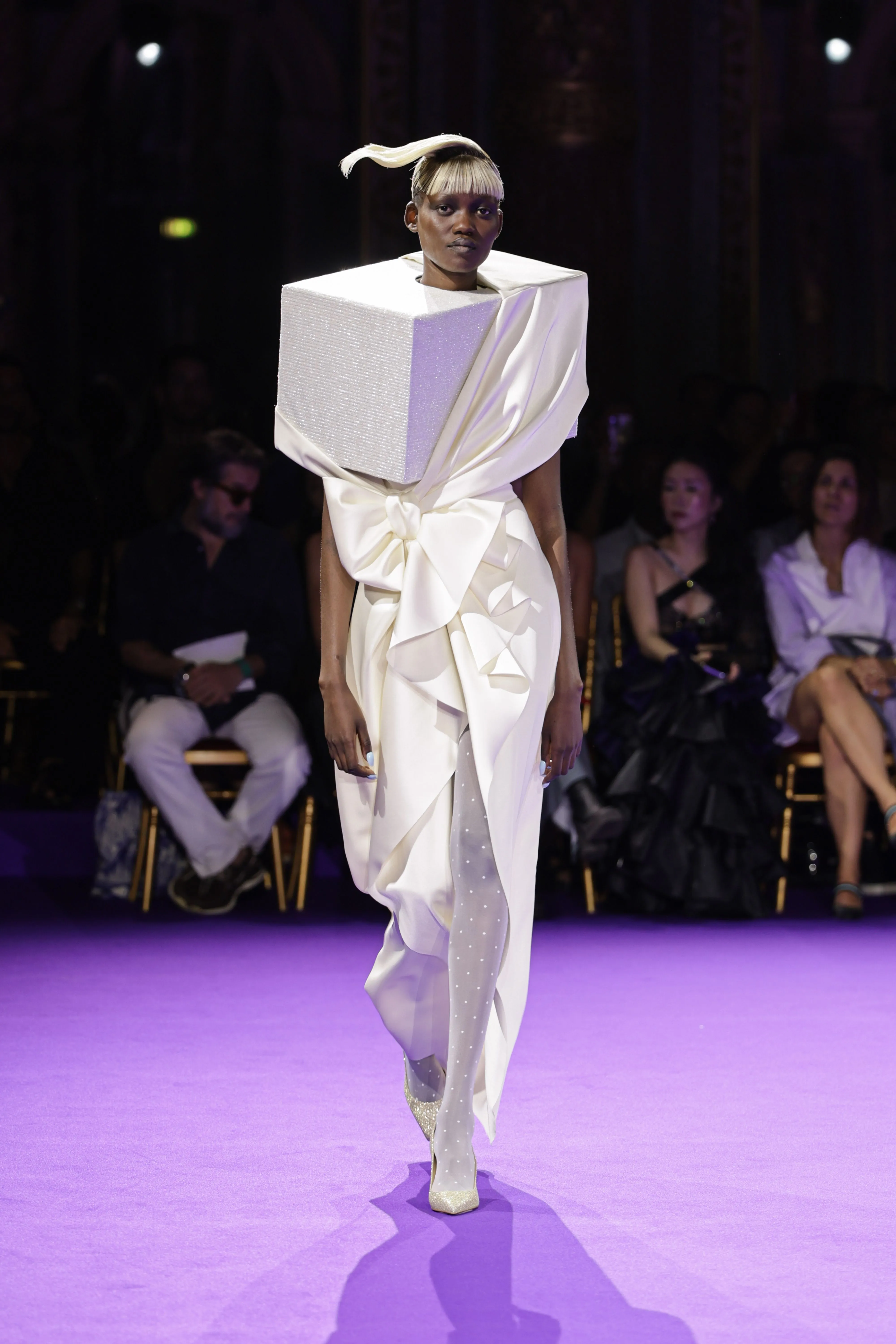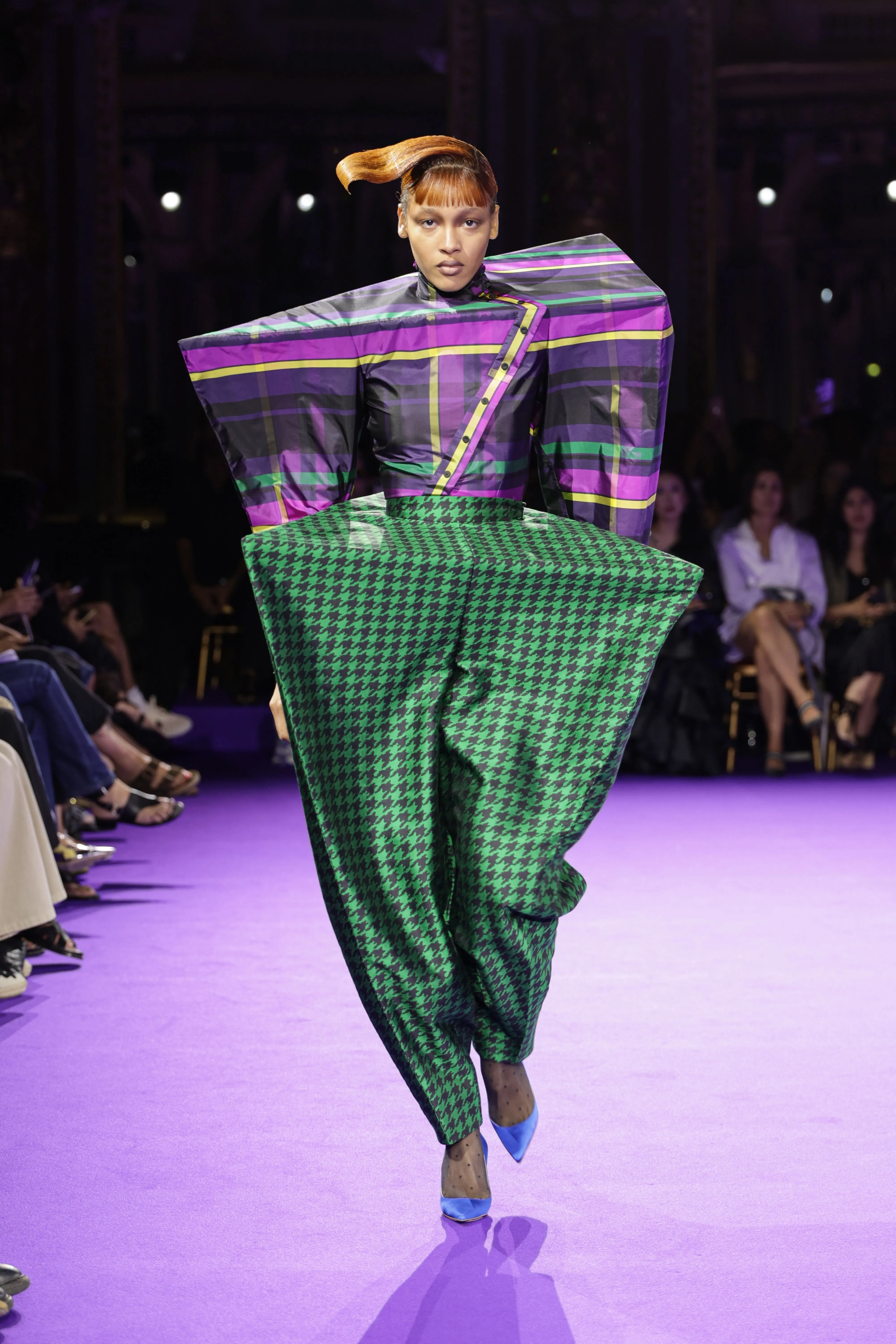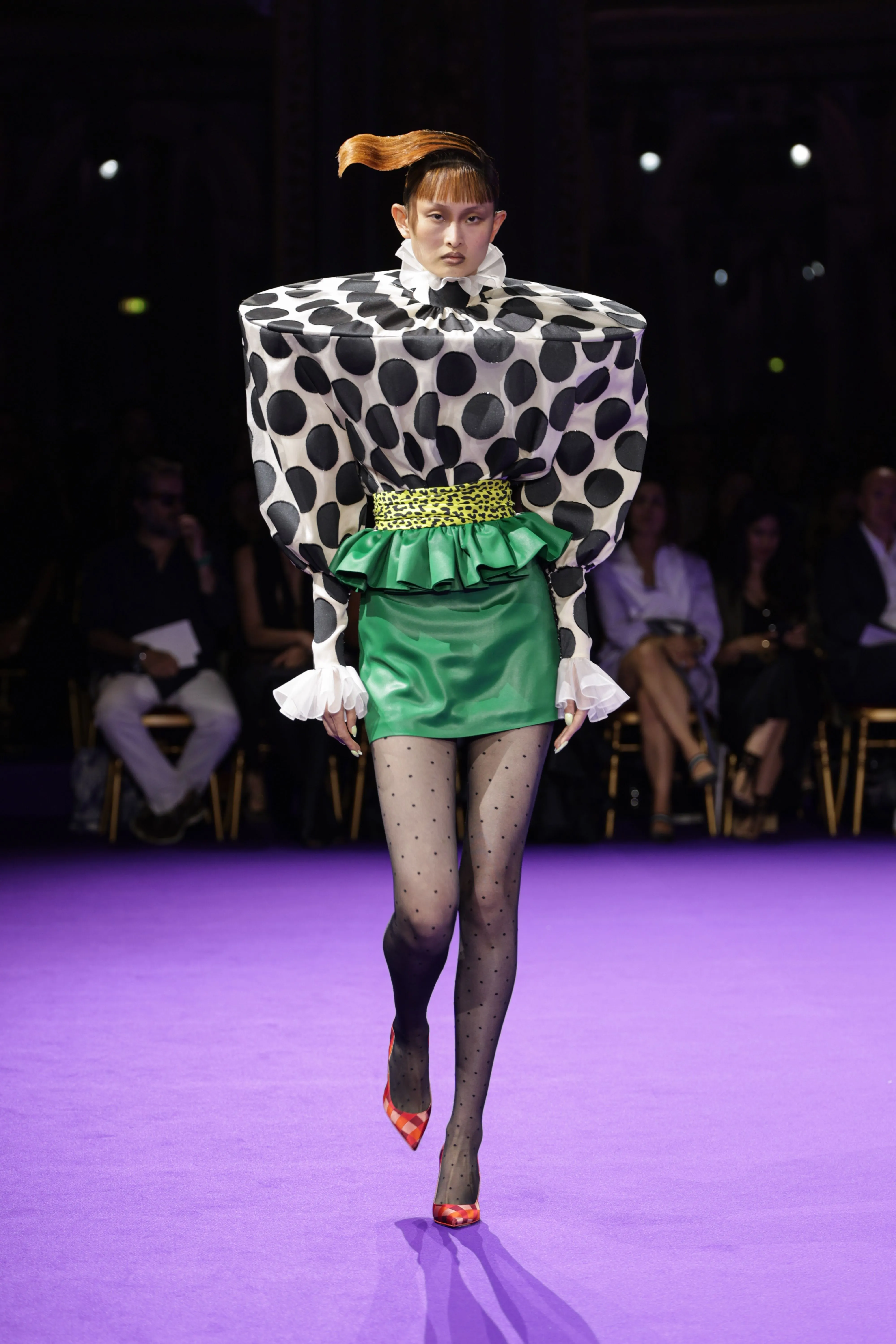 Dans une galerie de glaces d’époque aux tons feutrés, les deux créateurs Viktor & Rolf ont présenté leur collection automne-hiver 2024, baptisée “Haute Abstraction”. Pour cette ligne, la maison a choisi de flirter avec l’absurde. Des coupes angulaires, des formes presque tirées d’un cartoon ou d’un tableau de Picasso, ont foulé un sol violet. Cette saison a tiré son inspiration de la collection “Atomic Bomb” présentée en 1998. Au cours de ces 26 dernières années, les pièces sont devenues encore plus abstraites et le duo de créateurs néerlandais a complètement redéfini la silhouette couture en jouant avec la géométrie et la 3D : corsets sphériques, blazers aux épaulettes XXL, bustiers rectangulaires, jupes circulaires… Les associations de couleurs, de motifs et de textures ajoutent au côté non-conventionnel de cette collection qui n’hésite pas à allier rayures verticales, fleurs et nœuds surdimensionnés. Reflétant les tissus et les couleurs des vêtements, chaque look est complété par des talons Christian Louboutin en satin coloré. Les mannequins défilent avec des collants à pois de Falke, qui complètent les constructions absurdes de cette saison.