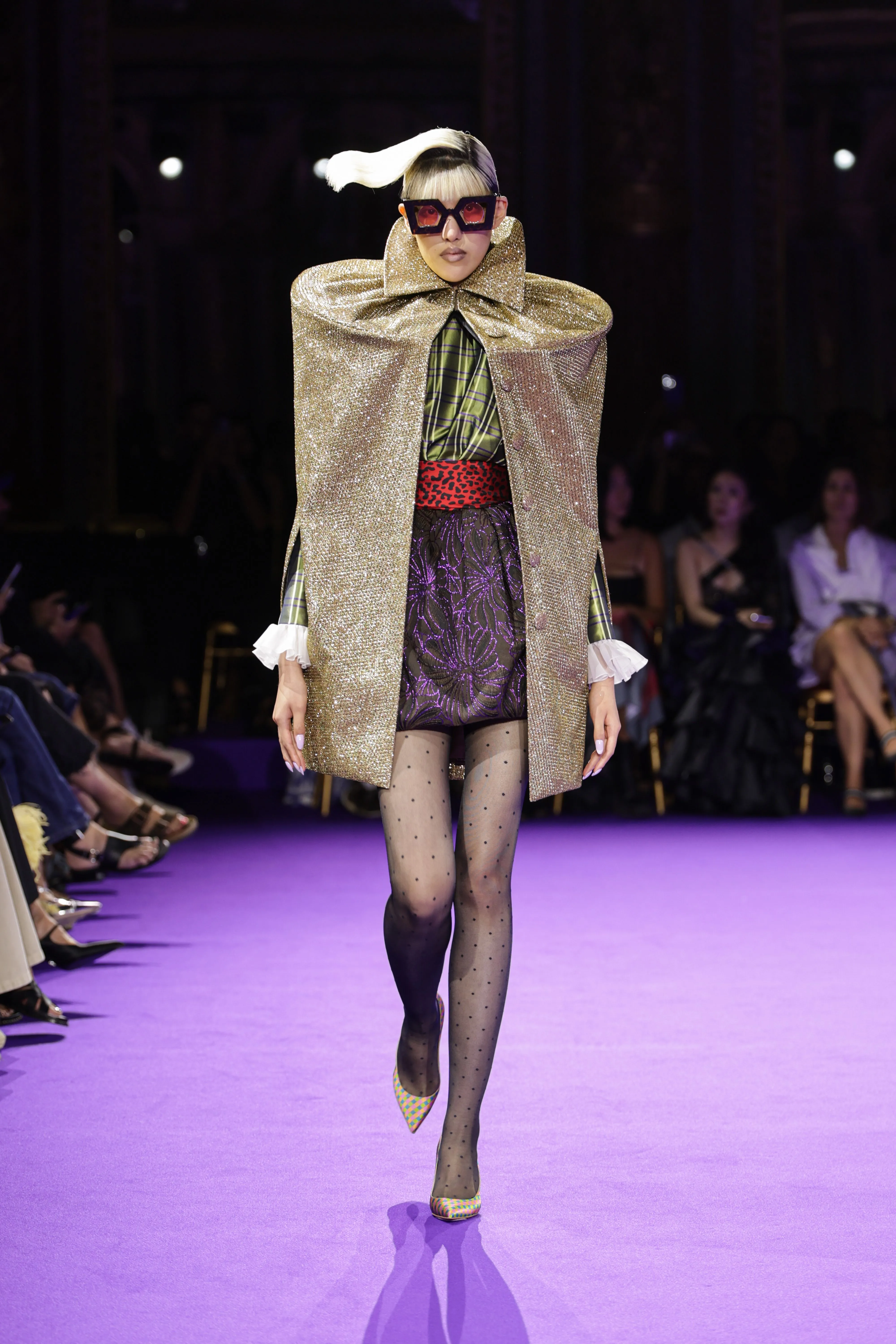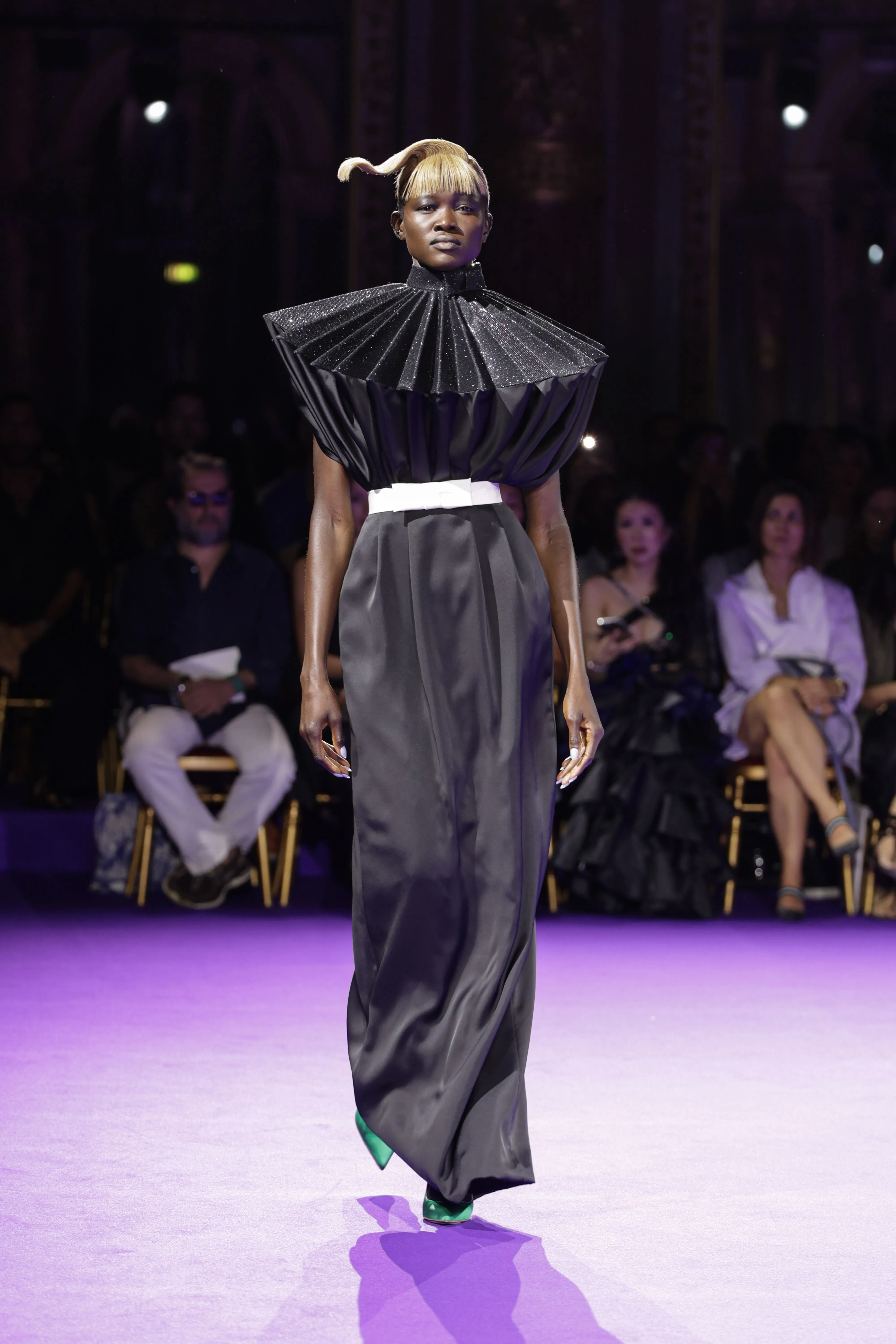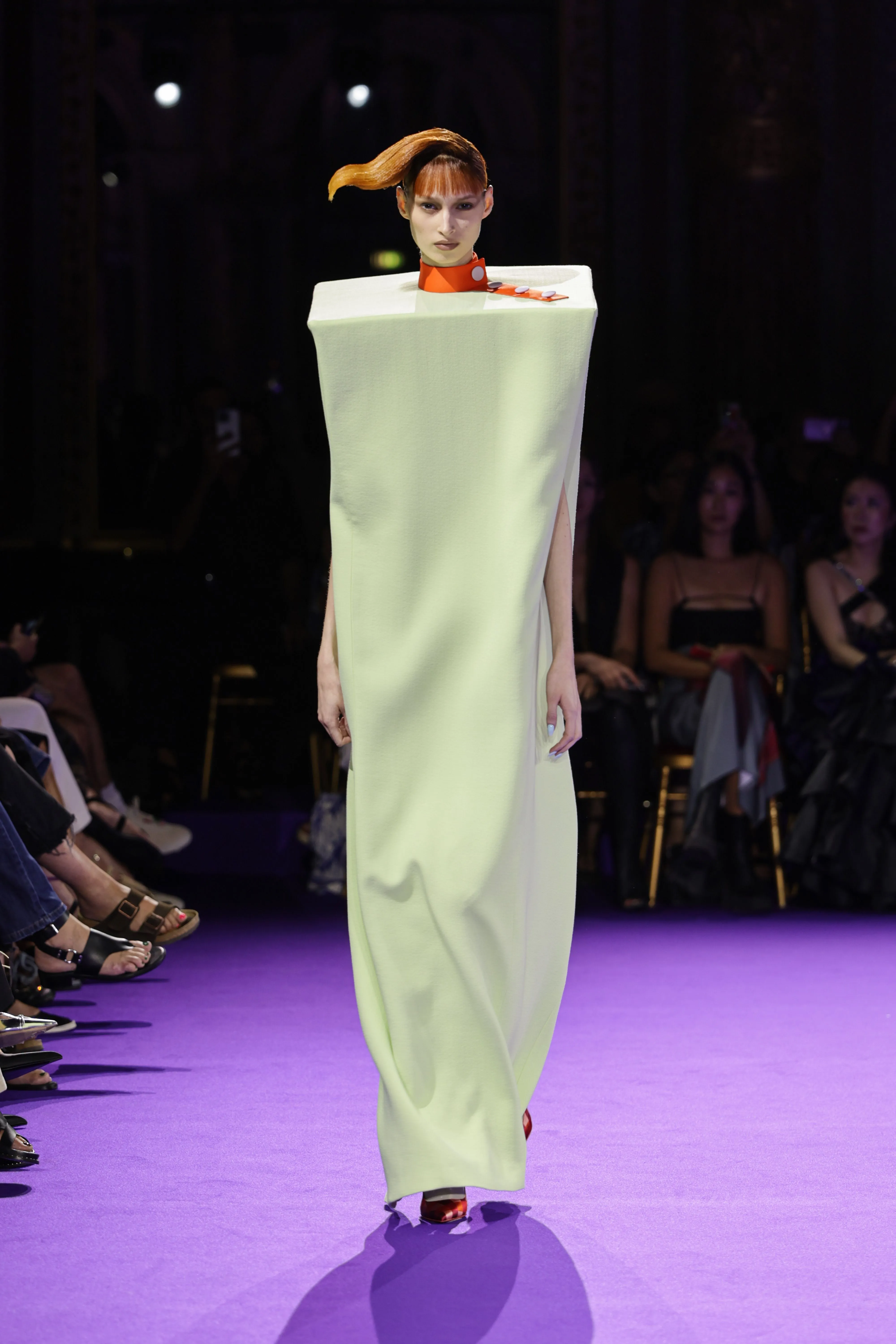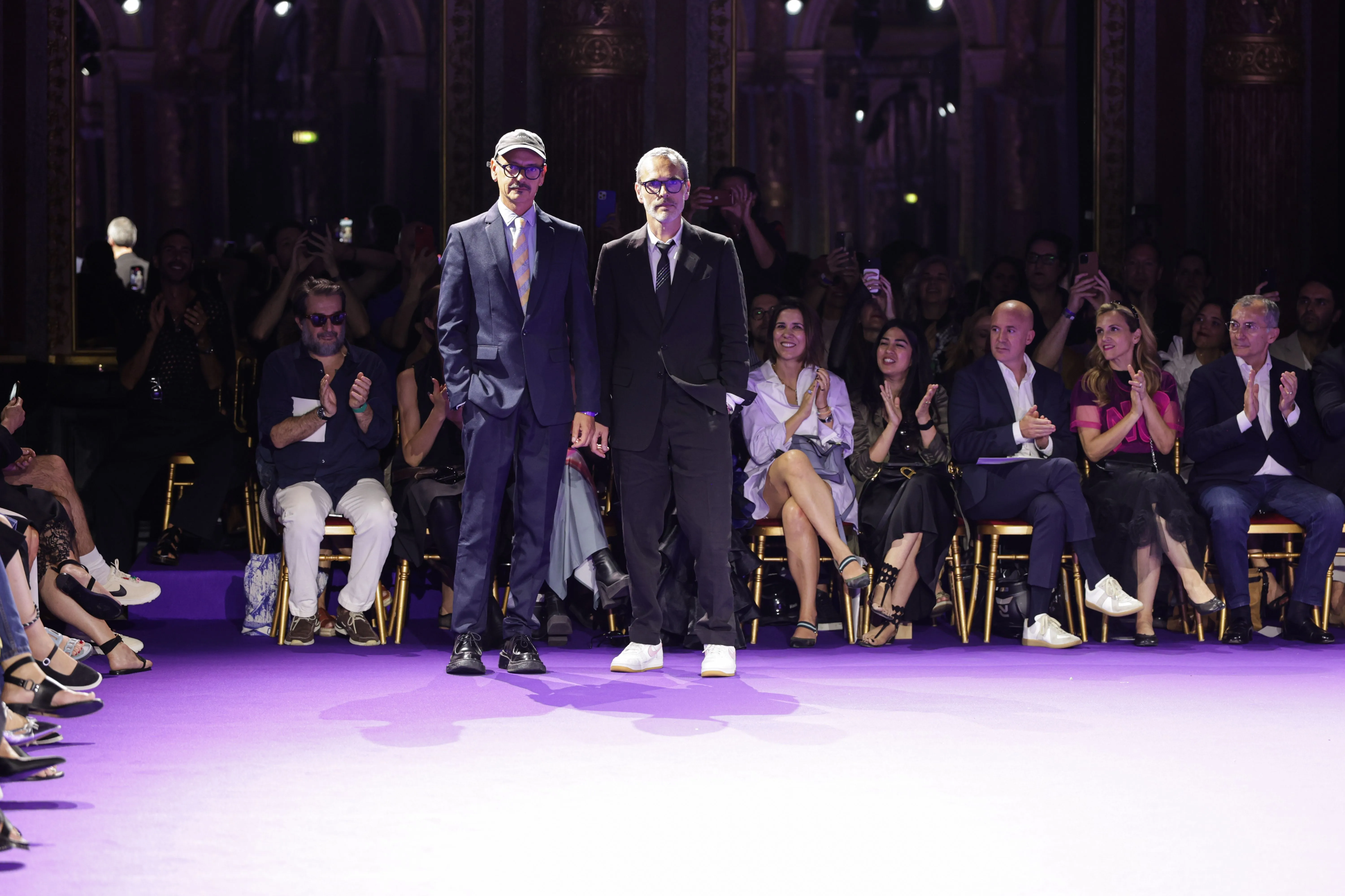 Dans une galerie de glaces d’époque aux tons feutrés, les deux créateurs Viktor & Rolf ont présenté leur collection automne-hiver 2024, baptisée “Haute Abstraction”. Pour cette ligne, la maison a choisi de flirter avec l’absurde. Des coupes angulaires, des formes presque tirées d’un cartoon ou d’un tableau de Picasso, ont foulé un sol violet. Cette saison a tiré son inspiration de la collection “Atomic Bomb” présentée en 1998. Au cours de ces 26 dernières années, les pièces sont devenues encore plus abstraites et le duo de créateurs néerlandais a complètement redéfini la silhouette couture en jouant avec la géométrie et la 3D : corsets sphériques, blazers aux épaulettes XXL, bustiers rectangulaires, jupes circulaires… Les associations de couleurs, de motifs et de textures ajoutent au côté non-conventionnel de cette collection qui n’hésite pas à allier rayures verticales, fleurs et nœuds surdimensionnés. Reflétant les tissus et les couleurs des vêtements, chaque look est complété par des talons Christian Louboutin en satin coloré. Les mannequins défilent avec des collants à pois de Falke, qui complètent les constructions absurdes de cette saison.
