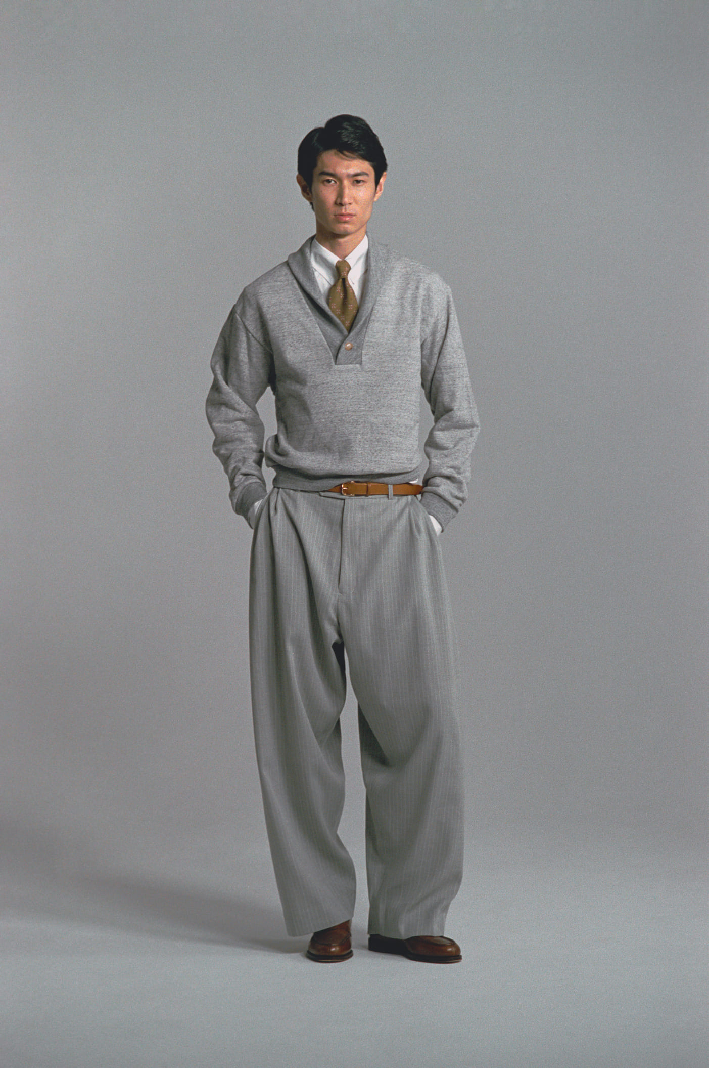 Parmi ces influences, Soshi Otsuki trouve sa propre voie en se nourrissant de l’héritage des traditions japonaises. Comme Rei Kawakubo ou Yohji Yamamoto dans les années 1980, il réinterprète les codes occidentaux avec un regard venu d’ailleurs, en apportant une sensibilité nouvelle au tailoring. Chaque pièce devient ainsi un terrain d’expérimentation où l’élégance se conjugue à la discipline, comme dans sa collection printemps-été 2025, inspirée par les employés de la bubble era japonaise (1986-1991). Fine cravate, poignets mousquetaires, épaules arrondies, boutonnage croisé, pantalons larges… Le designer expose sa propre version de ce que serait le vestiaire d’un dandy moderne. Loin de l’exubérance tapageuse du loud luxury, Soshi Otsuki propose un tailoring discret, précis, presque architectural, qui assurerait confiance et élégance à celui qui le porte.