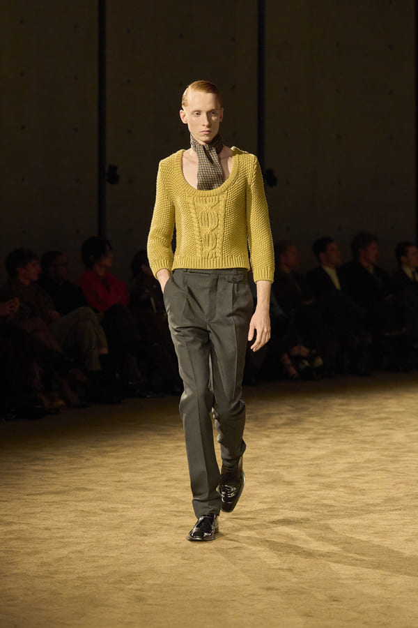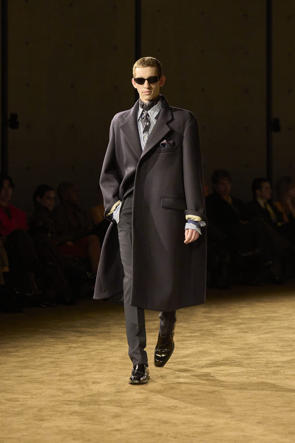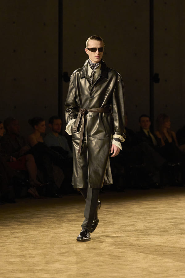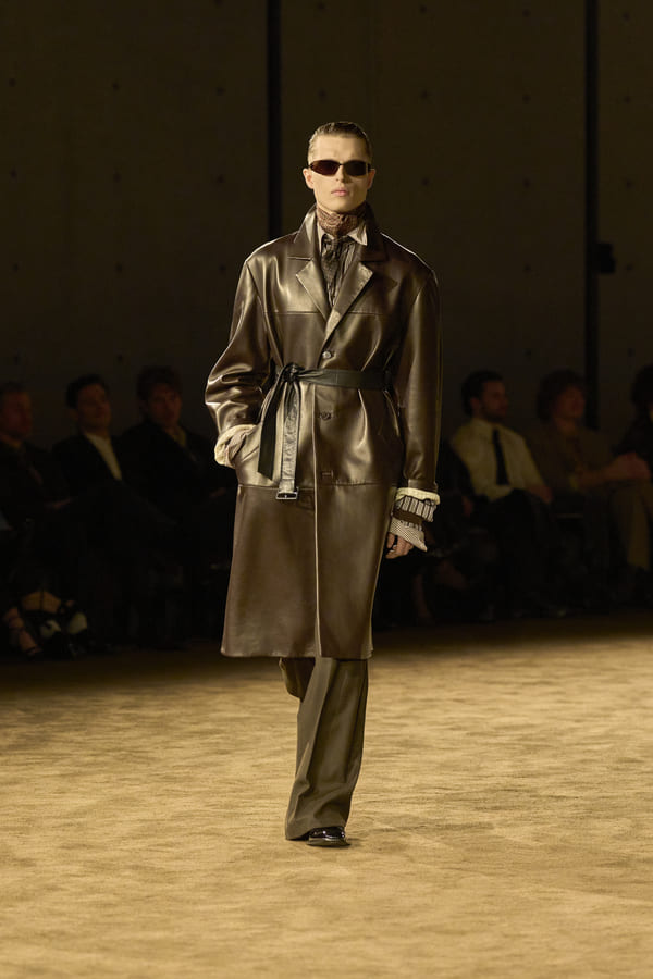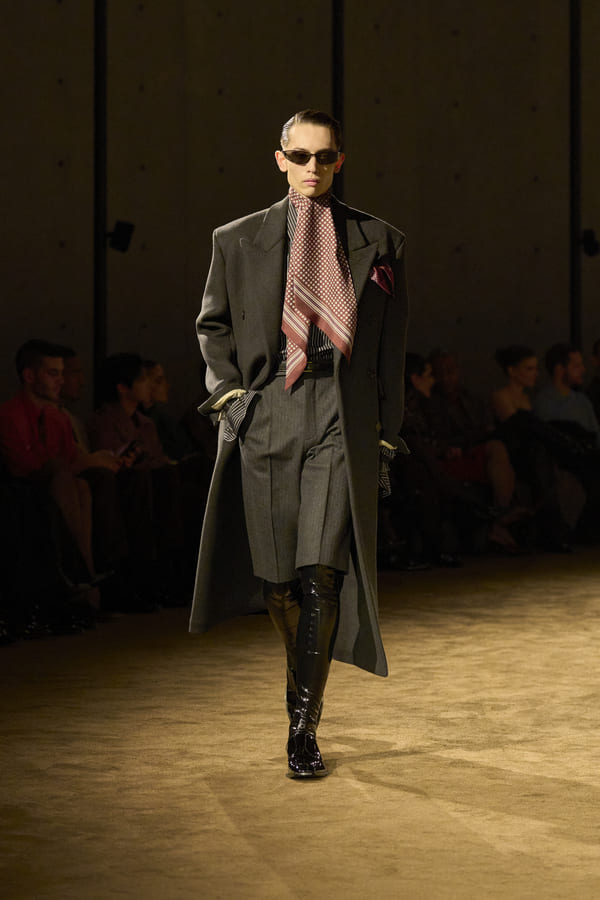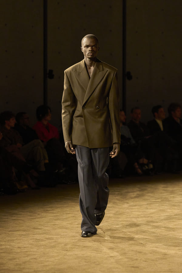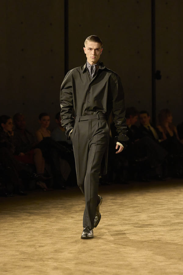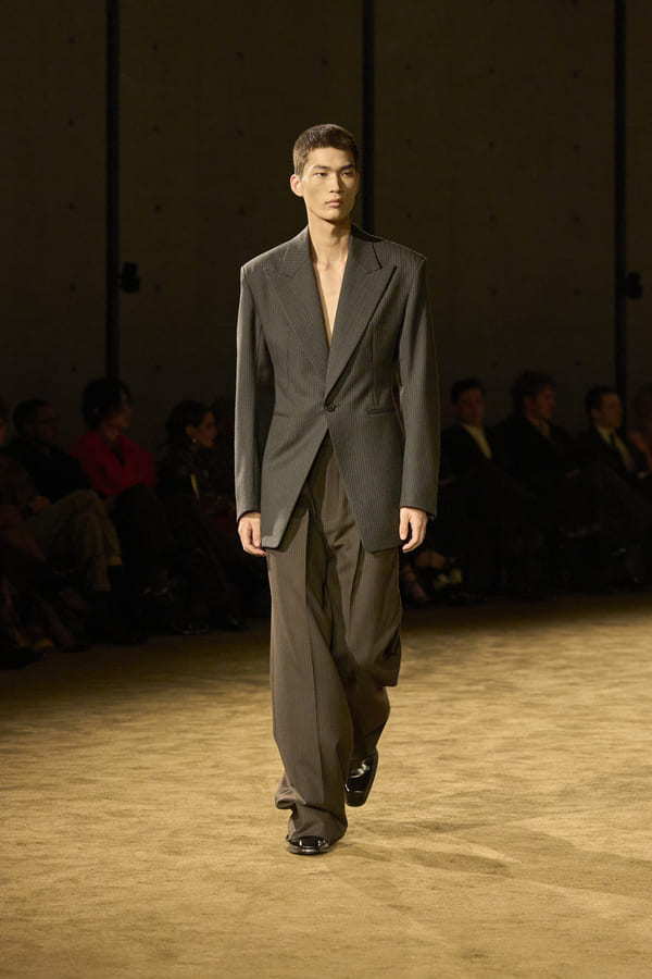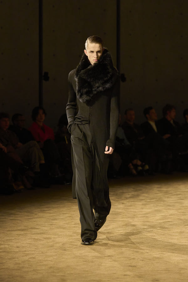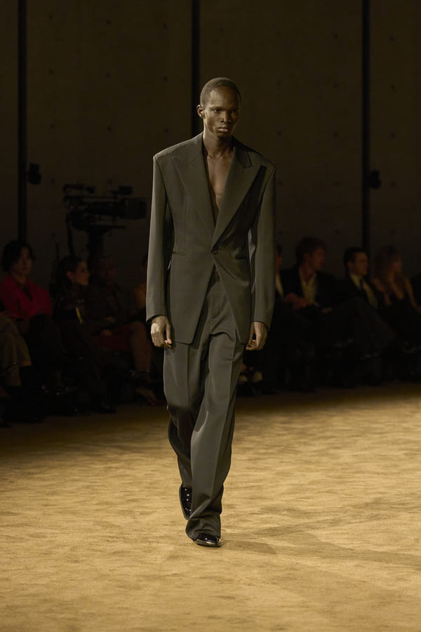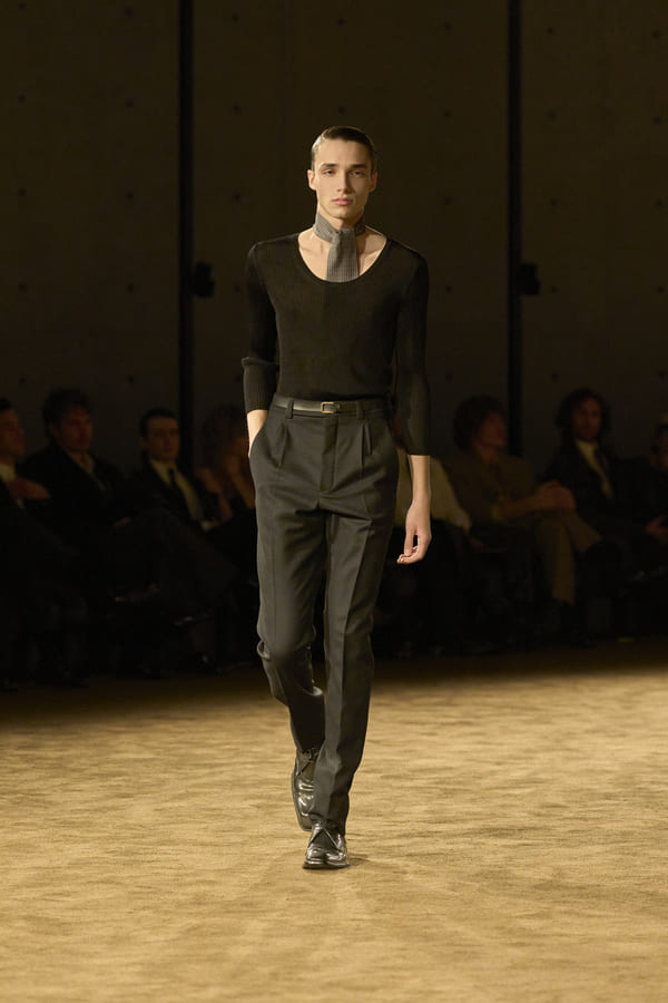 Anthony Vaccarello signe une collection masculine automne-hiver 2026-2027 qui explore l'intimité et la vulnérabilité à travers le prisme de l'aube parisienne. Inspiré par le roman emblématique de James Baldwin, Giovanni's Room (1956), le directeur artistique de Saint Laurent questionne la masculinité contemporaine en capturant ce moment liminal entre la nuit et le jour, entre la nudité et l'habit. La silhouette se fait élancée et sinueuse, à la fois fragile et forte, avec des textures froissées qui témoignent du passage du temps et des épaules structurées qui protègent sans nier la vulnérabilité. Le smoking iconique de la maison prend des allures d'armure moderne, tandis que les bottes hautes ancrent fermement la silhouette. Fidèle à l'ADN Saint Laurent, Vaccarello choisit le noir comme couleur dominante, symbole à la fois de classicisme et d'iconoclasme, pour une collection qui célèbre l'expression personnelle plutôt que le spectacle sensationnaliste.