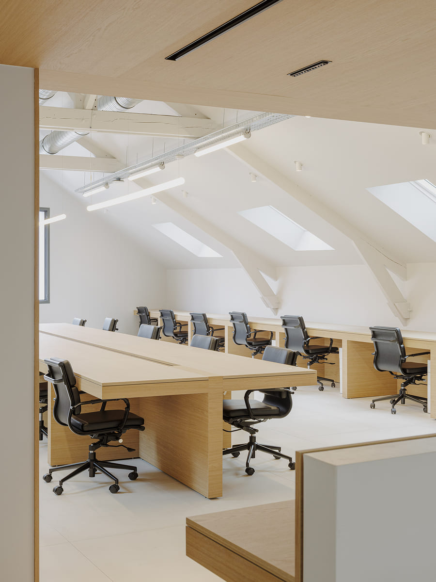 Dès notre arrivée, nous comprenons que le parti pris est clair : révéler la beauté brute des anciennes usines Beromet plutôt que la masquer. Le béton laissé apparent, les structures métalliques visibles et l'aluminium dialoguent avec des matériaux de réemploi pour créer une esthétique sincère, presque brutaliste. Mais cette radicalité est tempérée par une attention particulière à la lumière naturelle, qui adoucit les volumes et réchauffe les espaces tout au long de la journée.